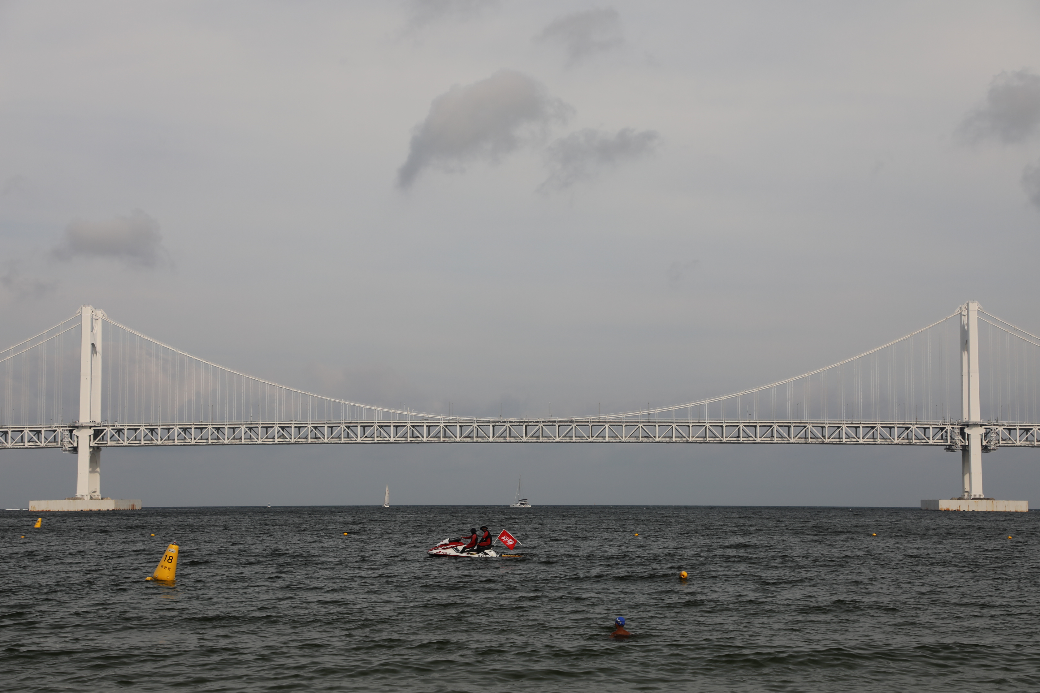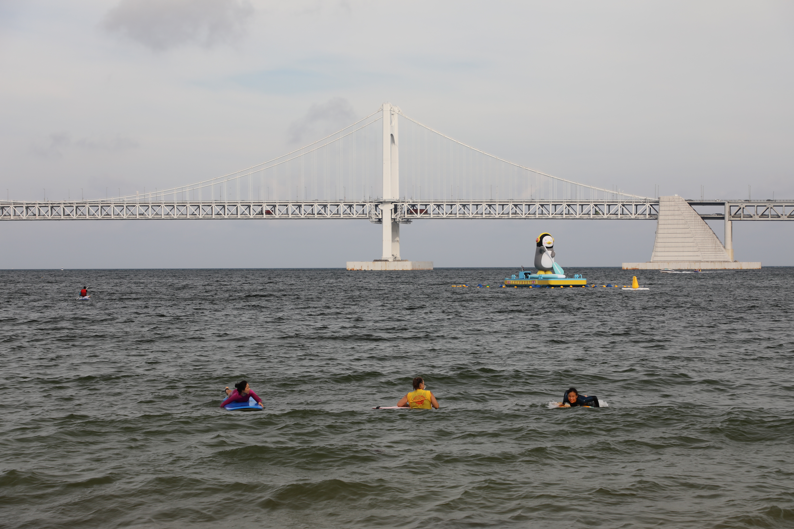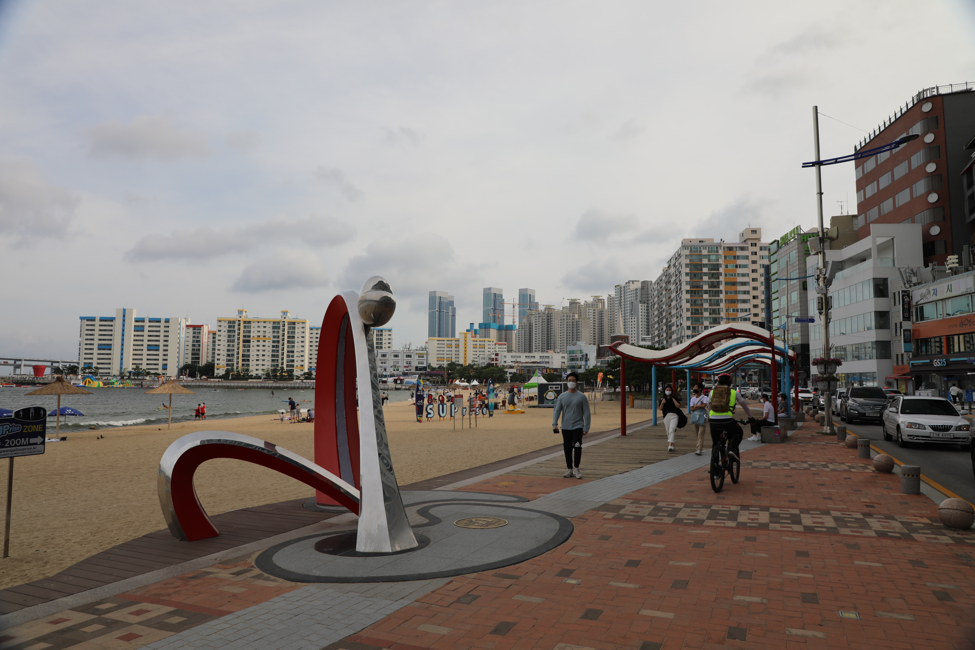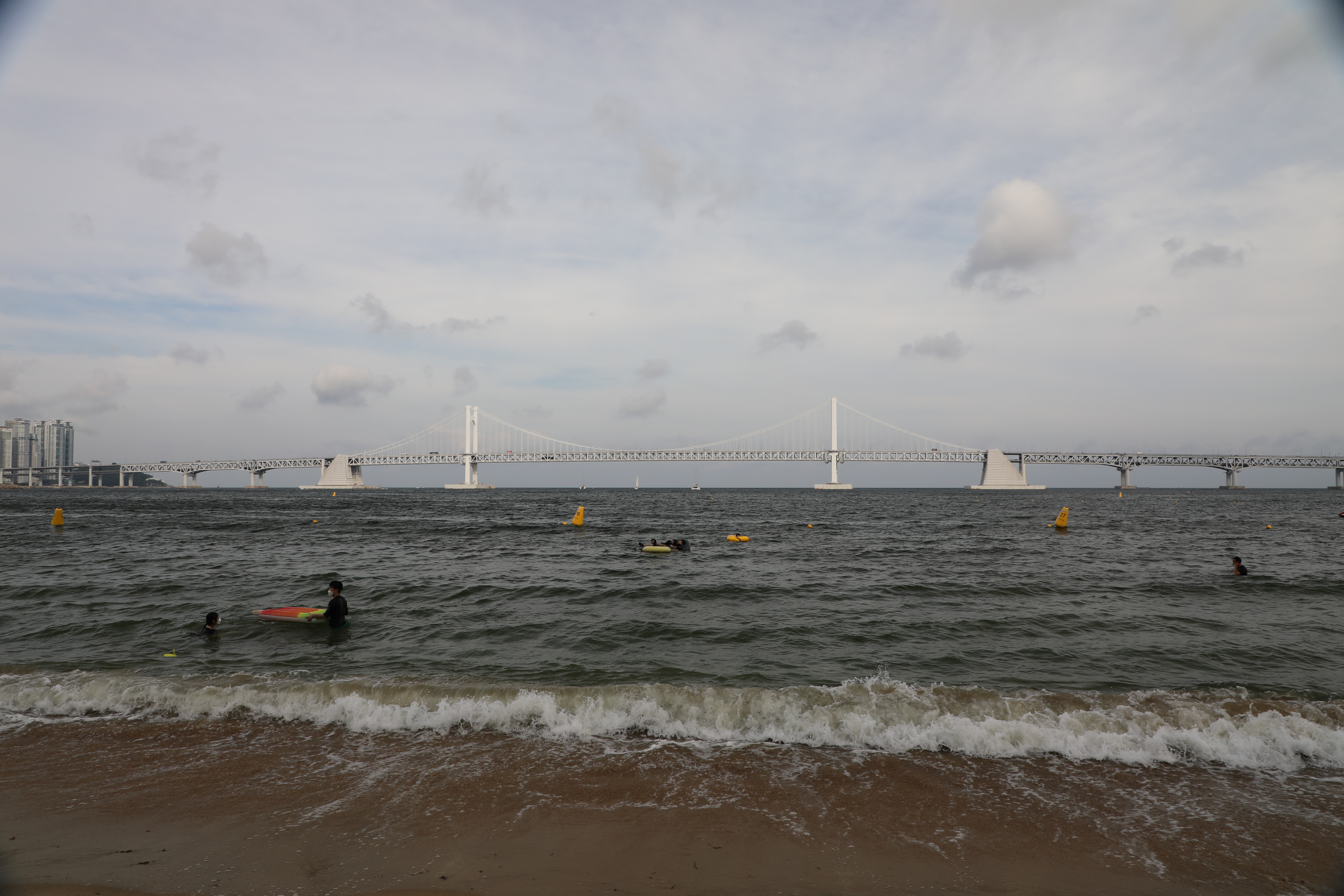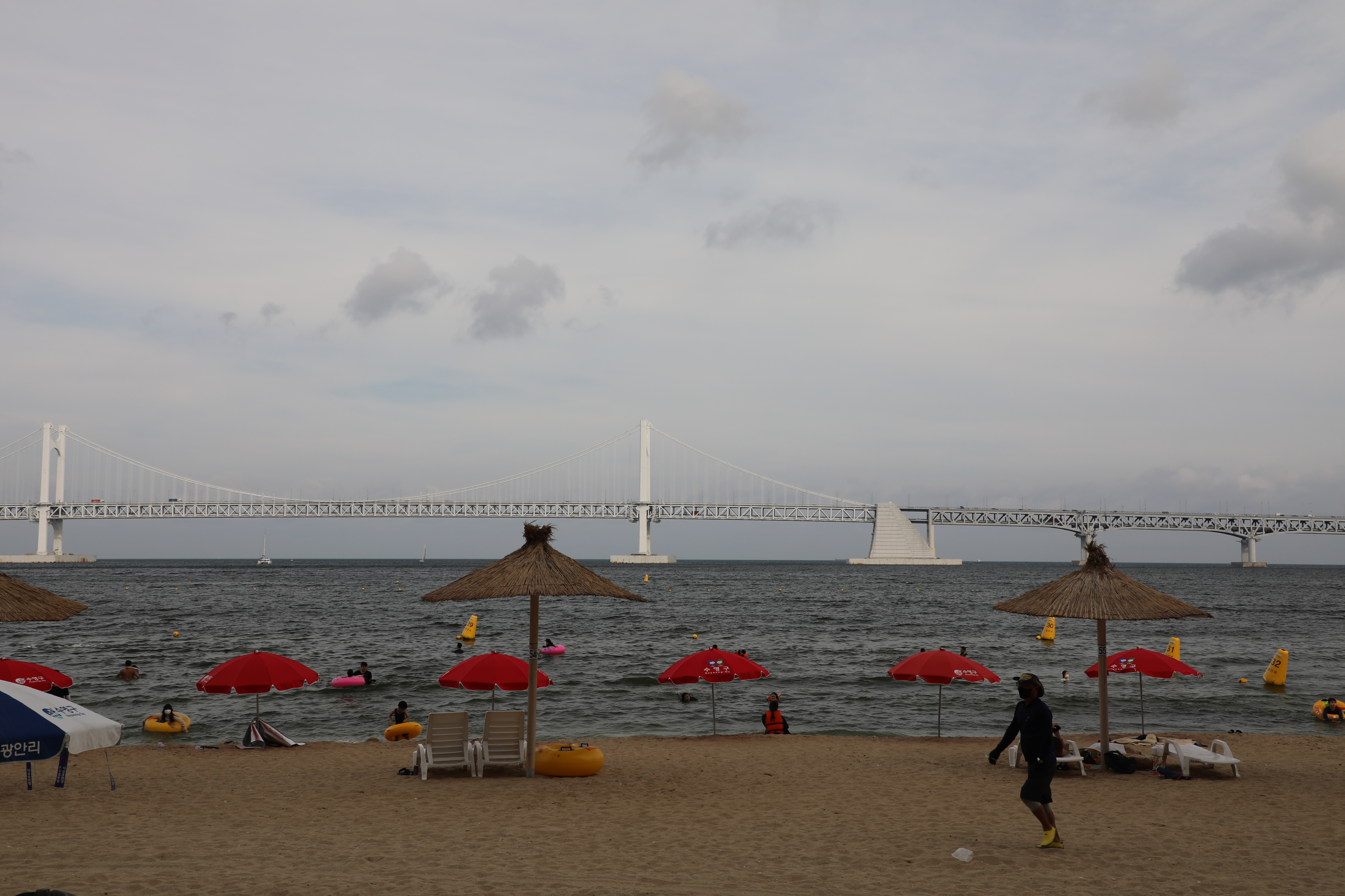 해수욕장 앞으로 광안대교가 지나간다.