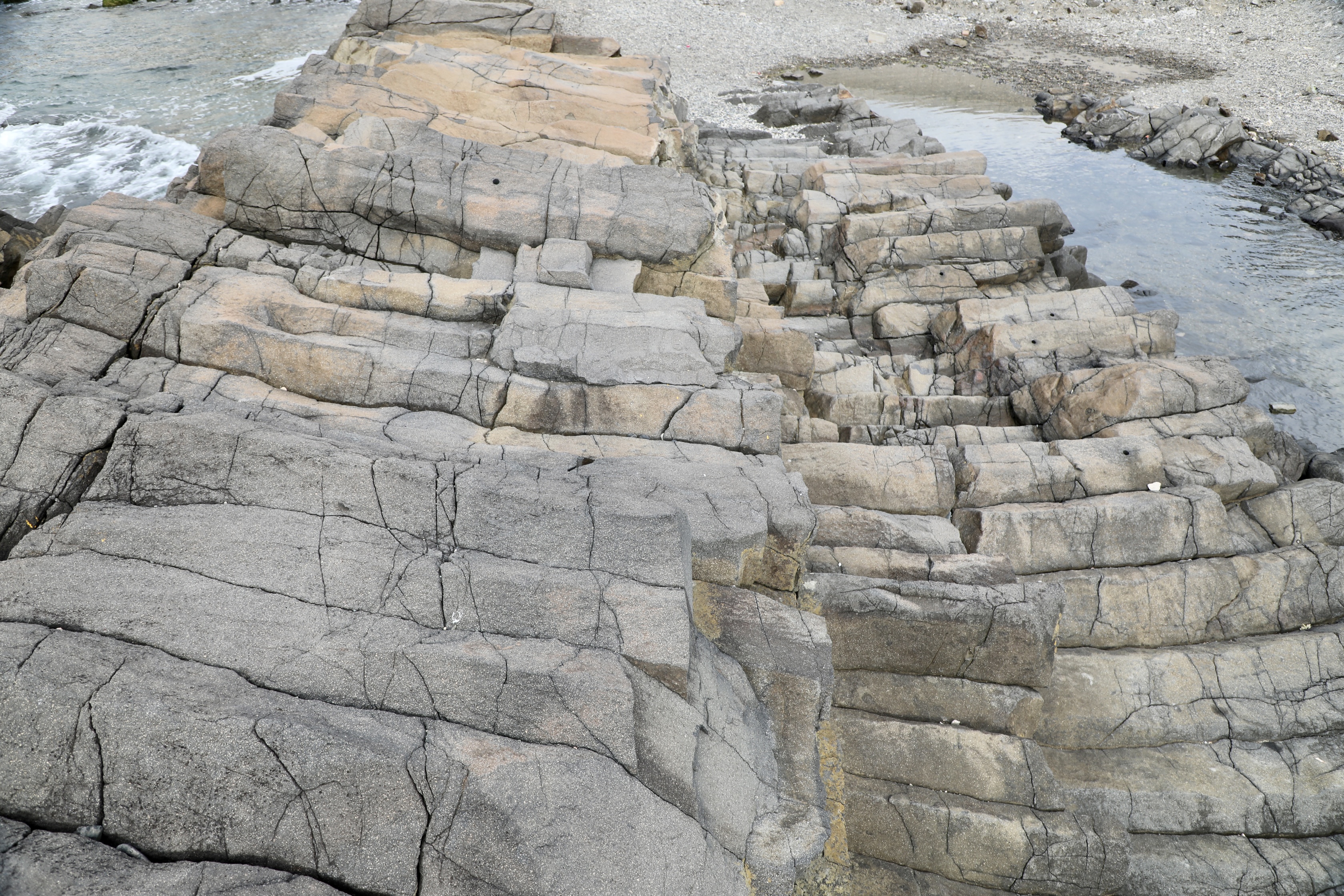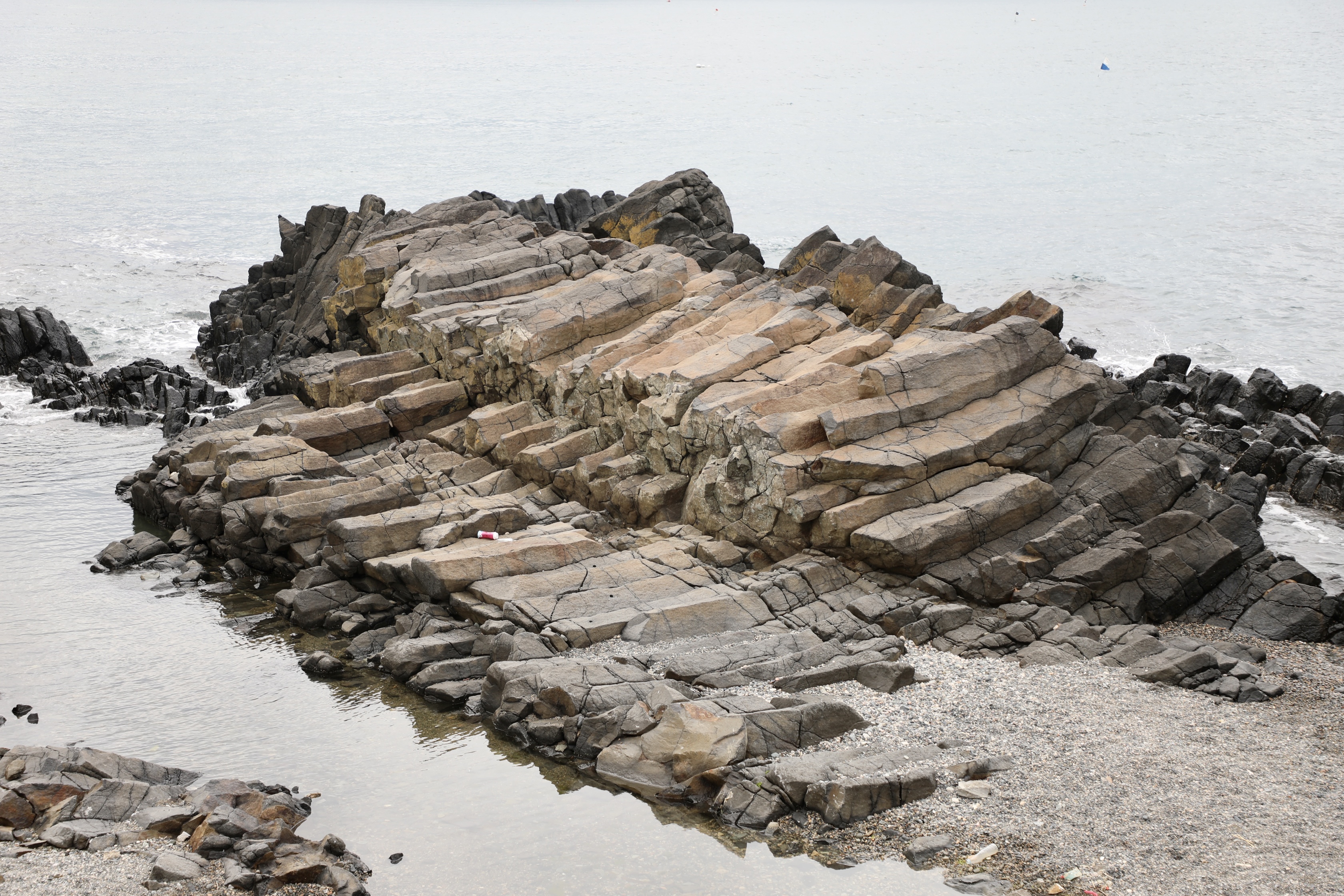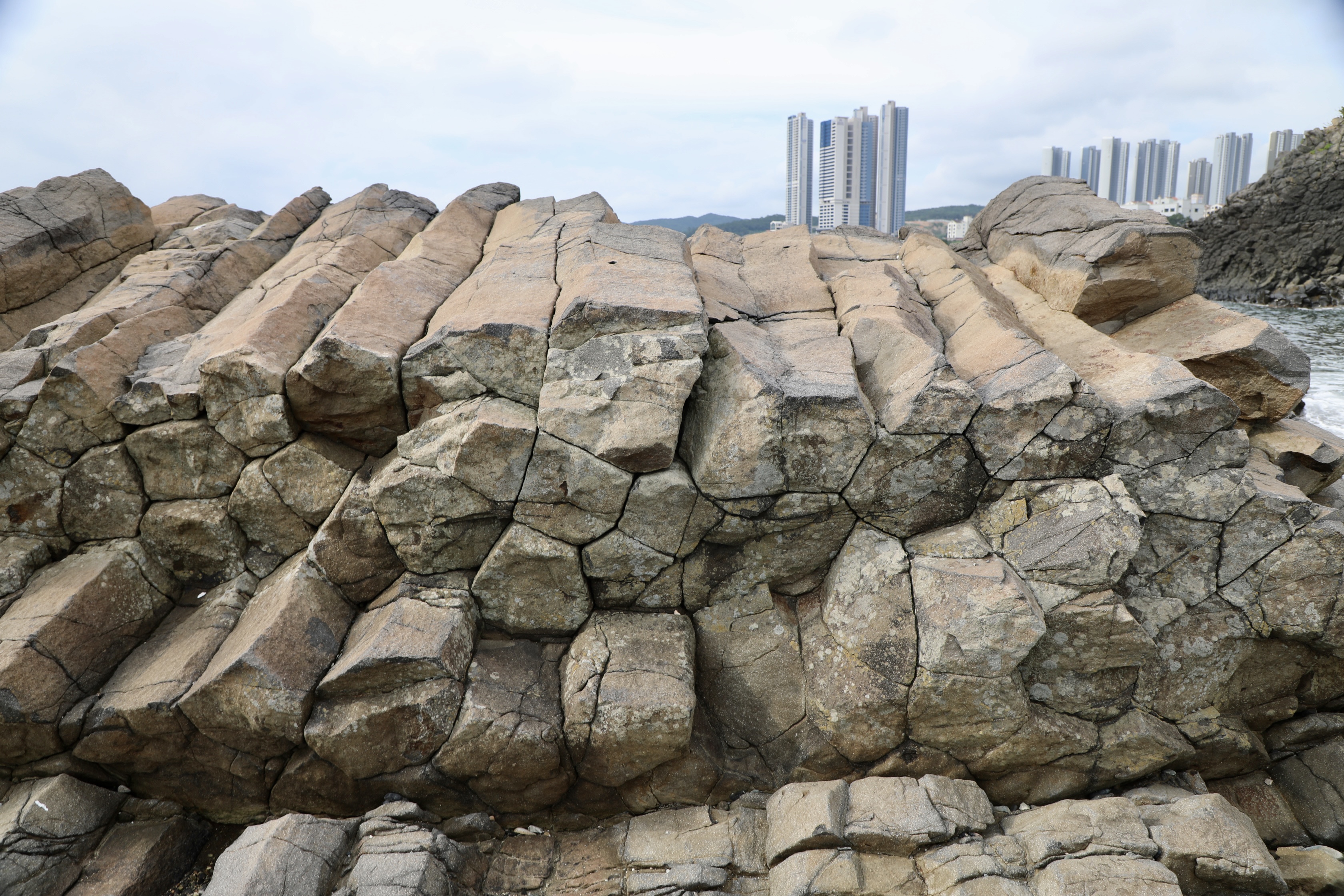 강동 몽돌해수욕장 북쪽 끝에 있는 둥글로 작은 바위 봉우리의 단면이다.