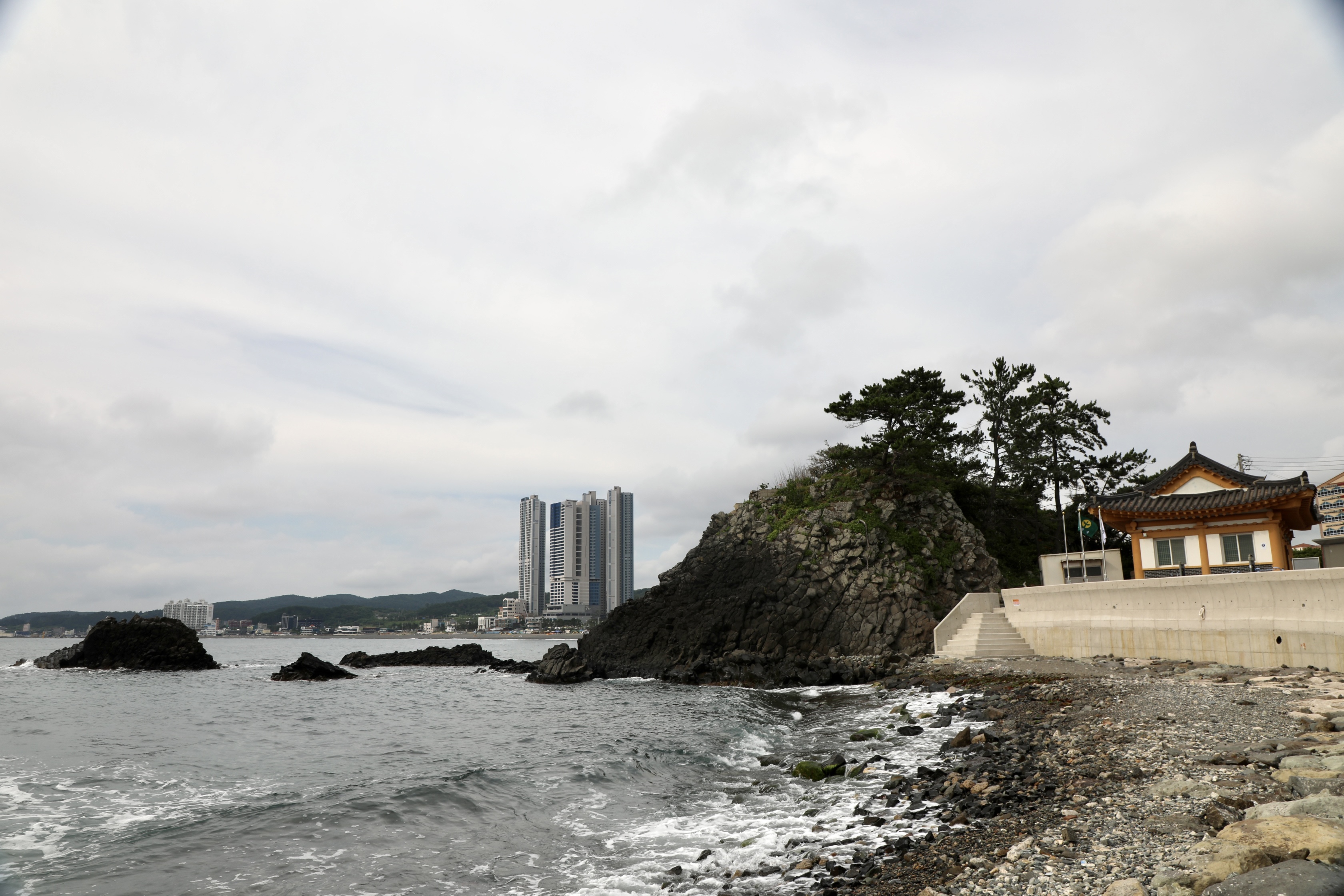 작은 바위산 옆 정자 뒤에 강동 몽돌해수욕장이 있다.