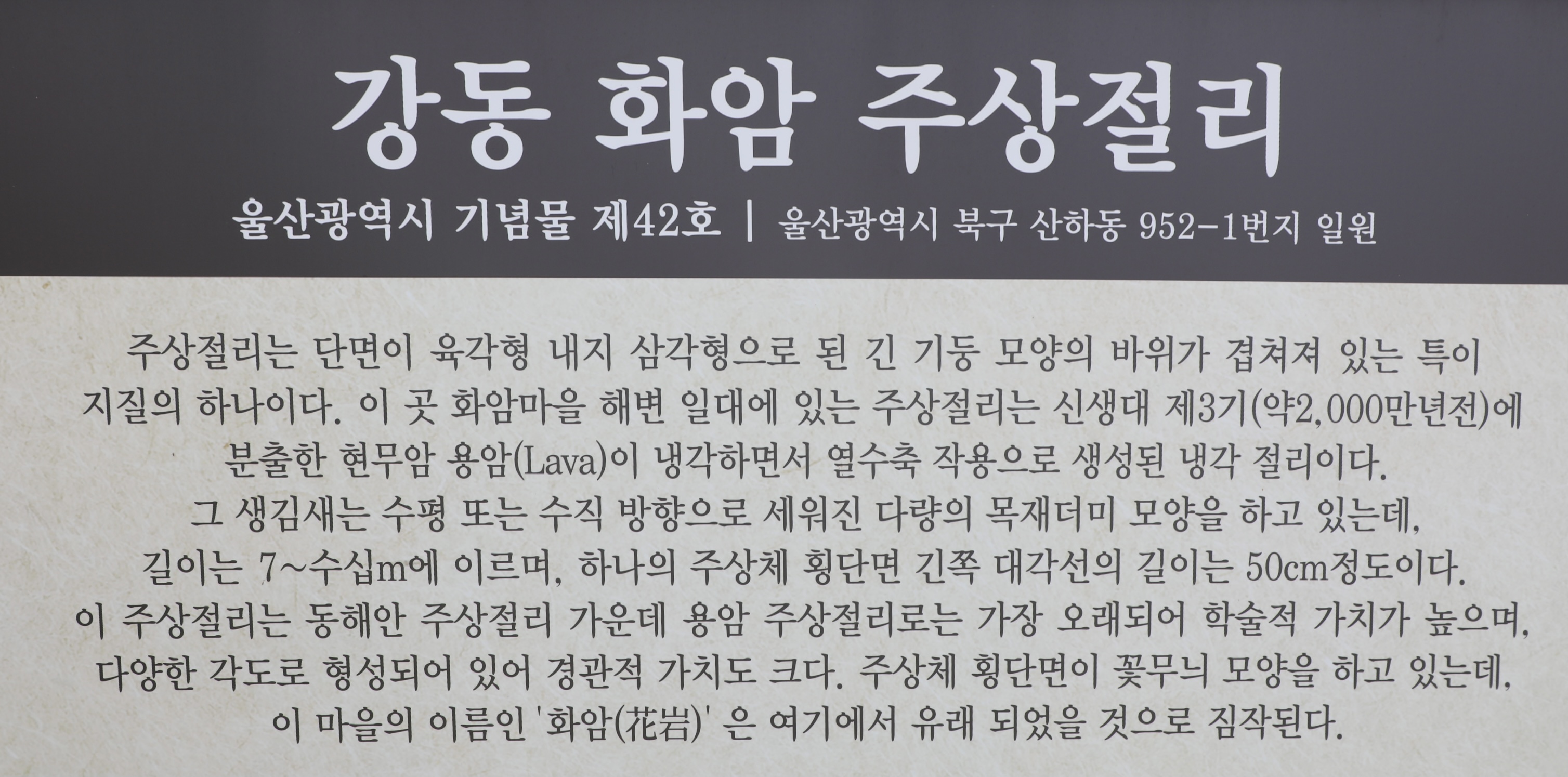 강동 화암 주상절리는 동해안에 형성된 주상절리 가운데 용암 주상절리로는 가장 오래되어 학술적 가치가 높다.