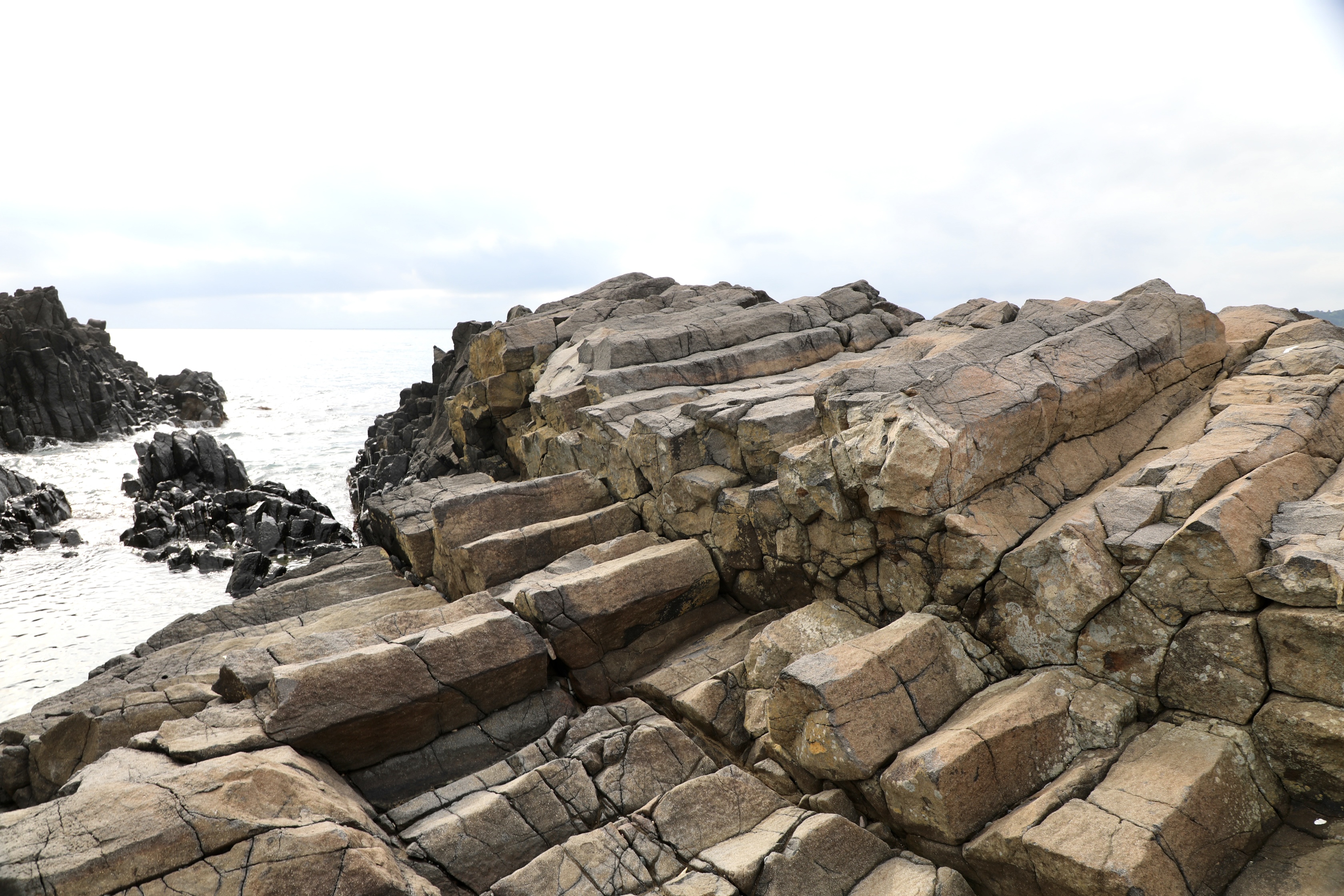 해안에 있는 화암 주상절리는 철도 침목처럼 쌓인 것도 있고, 비스듬히 세워진 것도 있다.