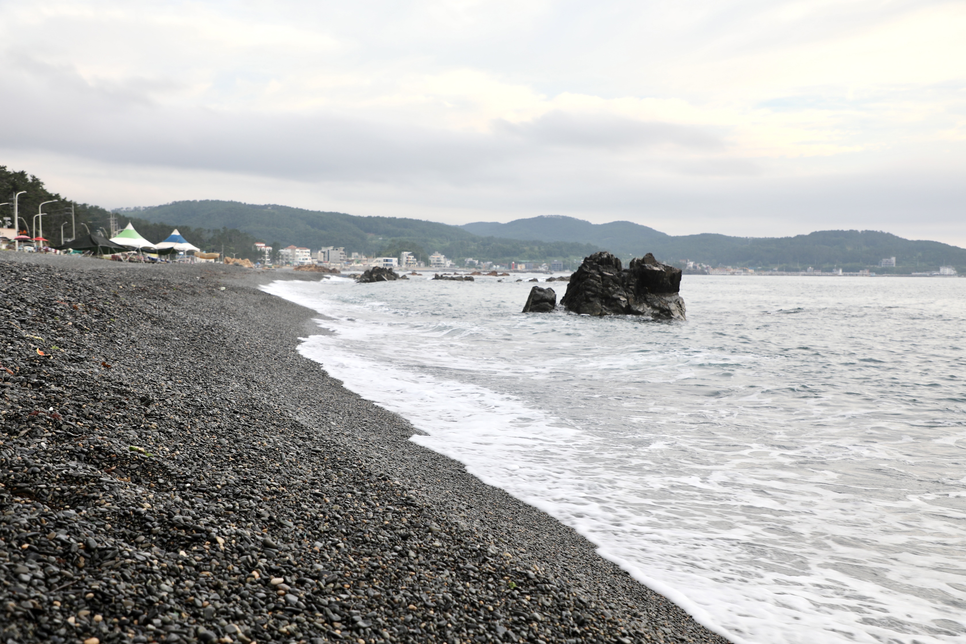 모래사장과 달리 몽돌해수욕장은 몽돌을 밟는 느낌과 소리를 들을 수 있다.