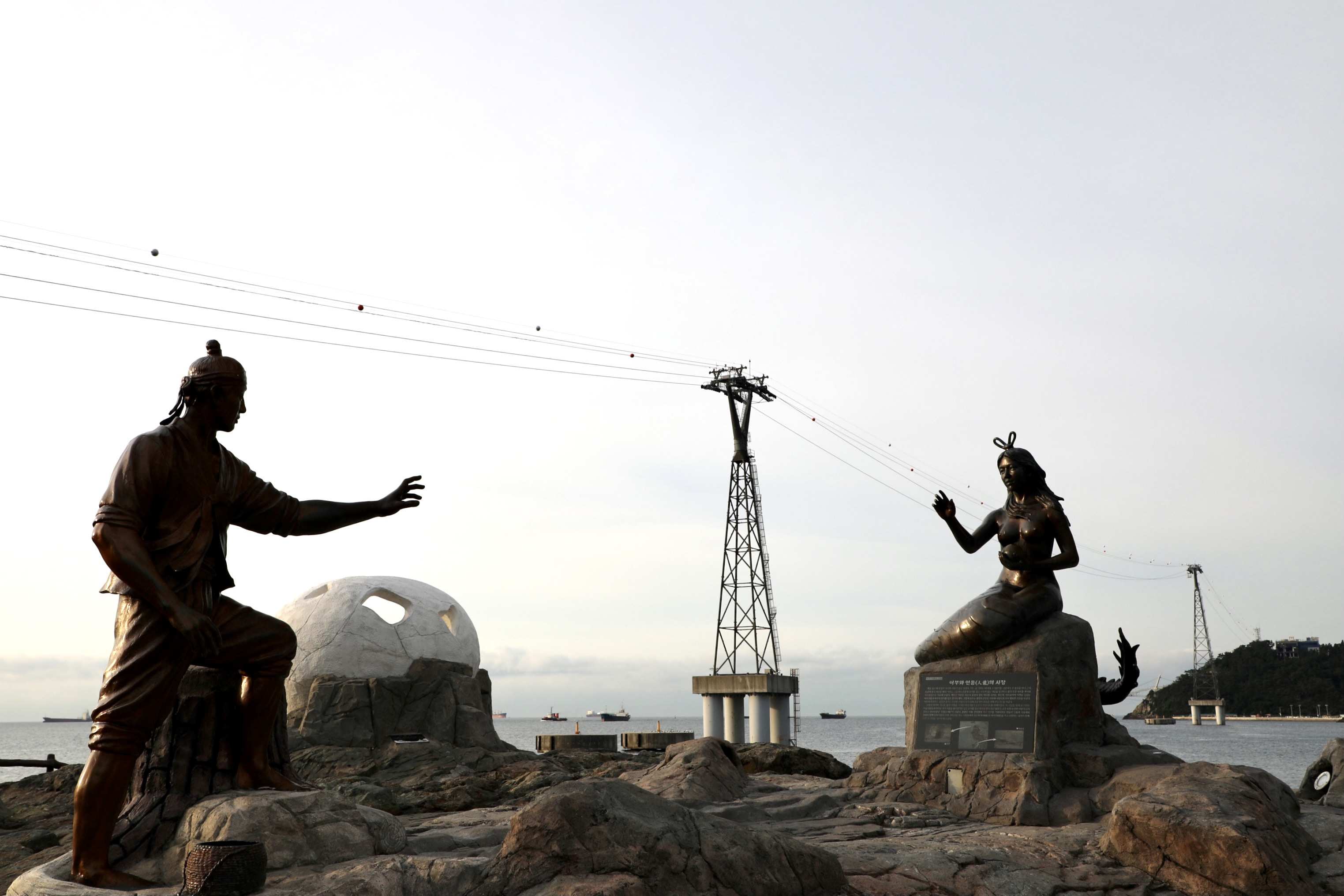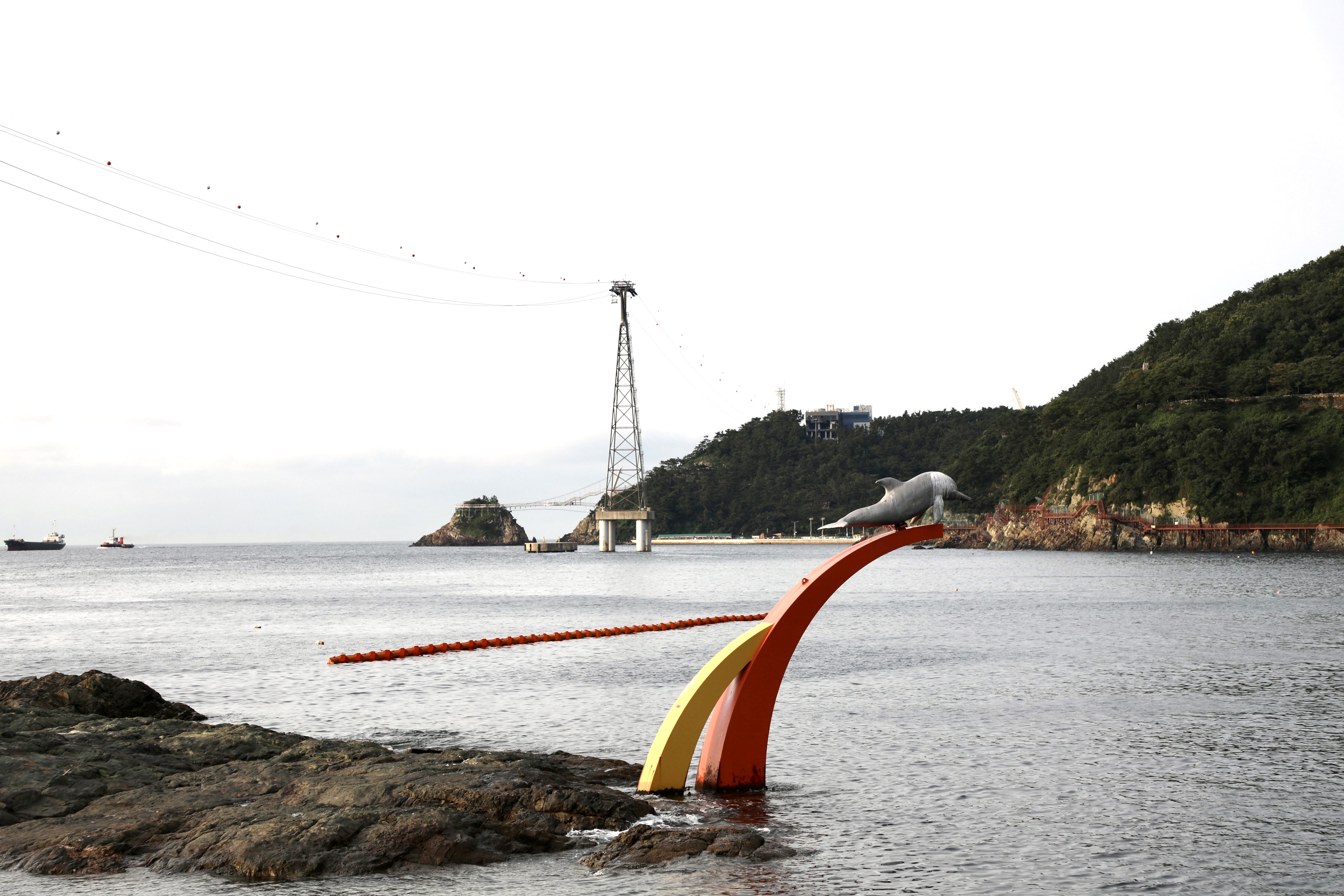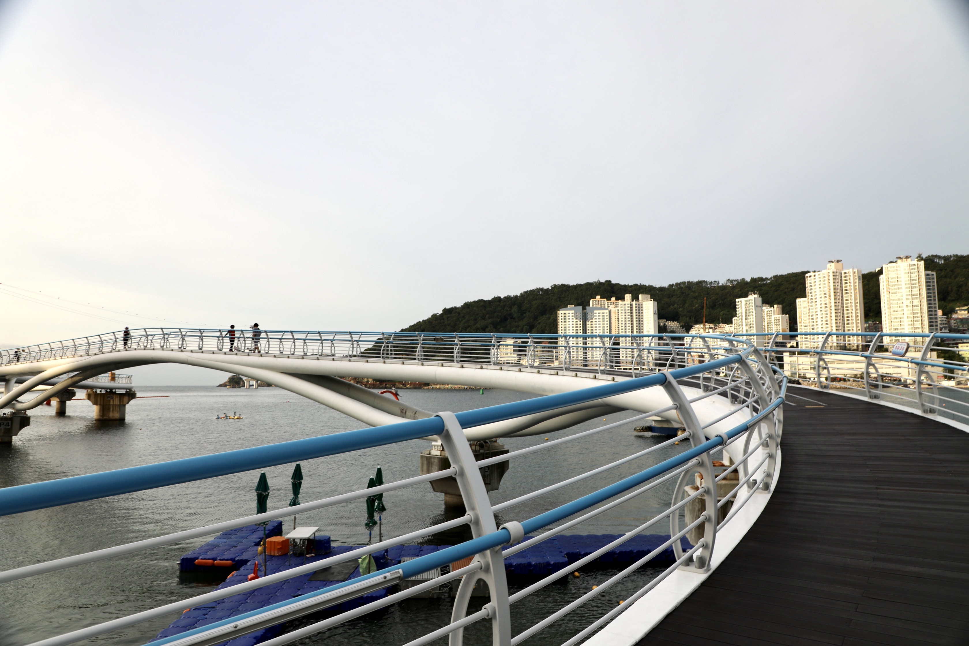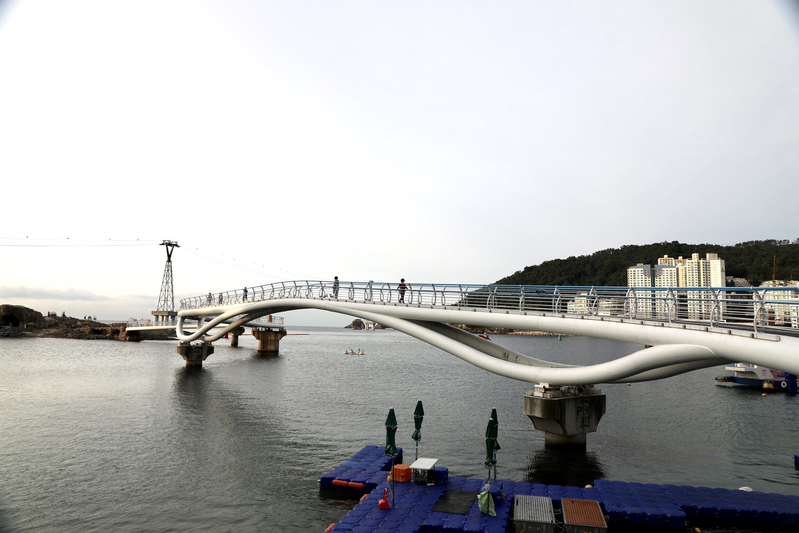 구름다리 위로 송도 해상 케이블카 지지대가 보인다.