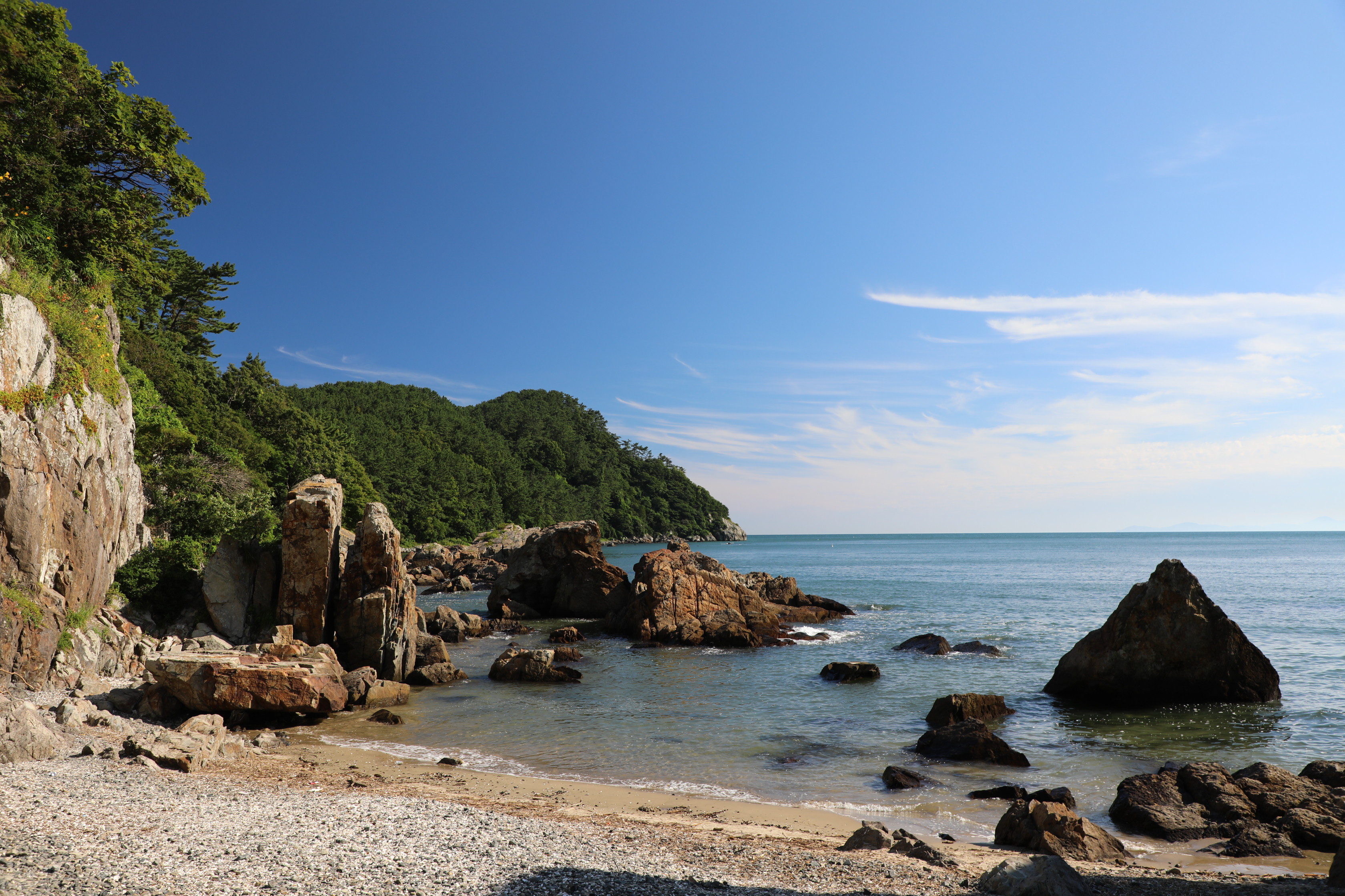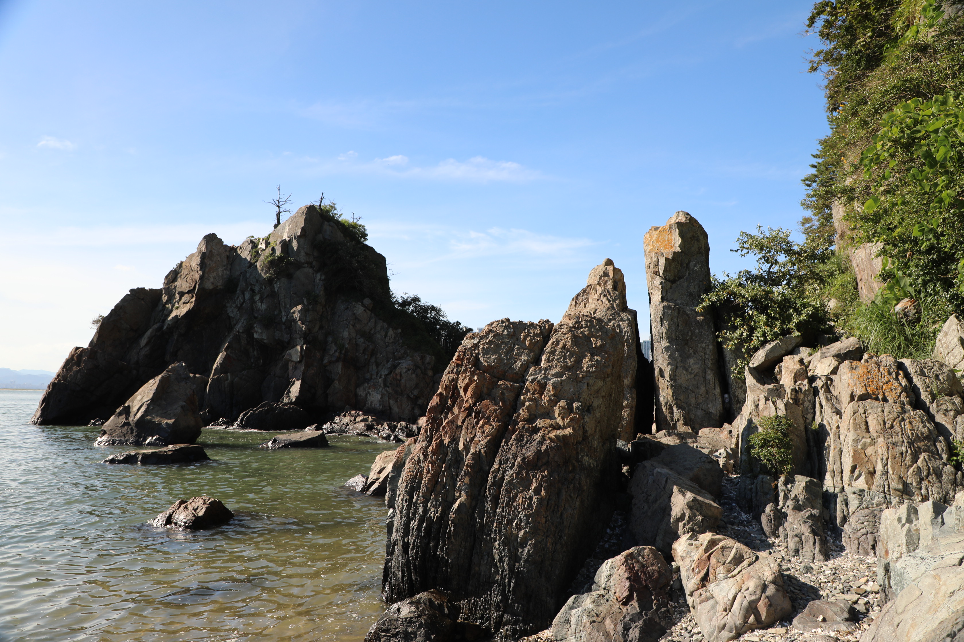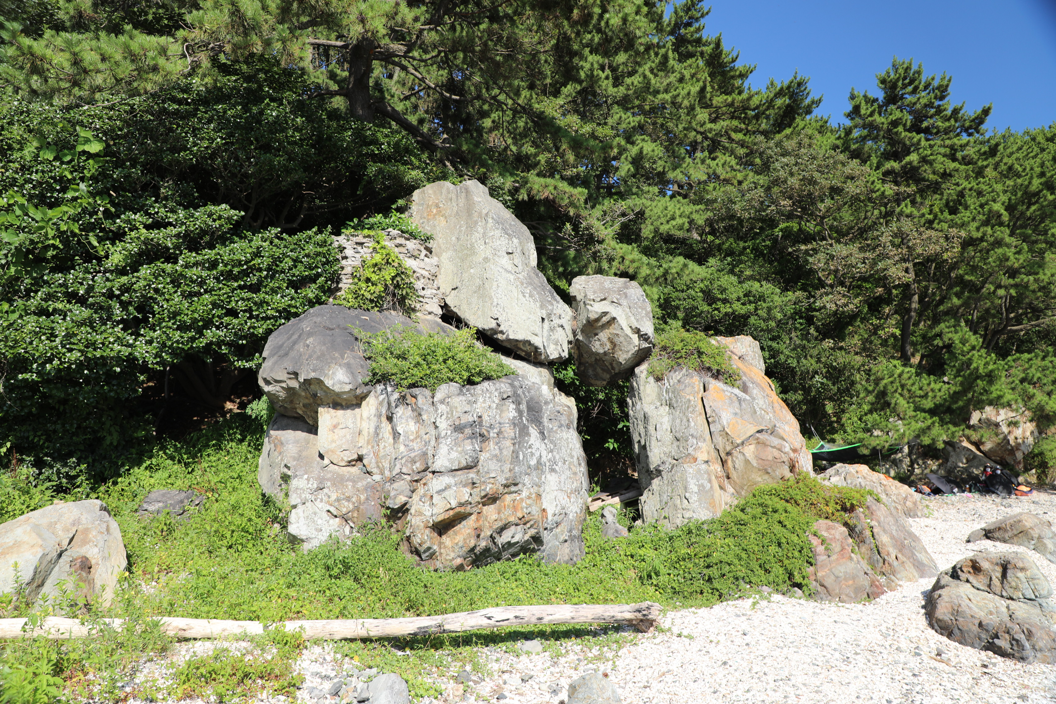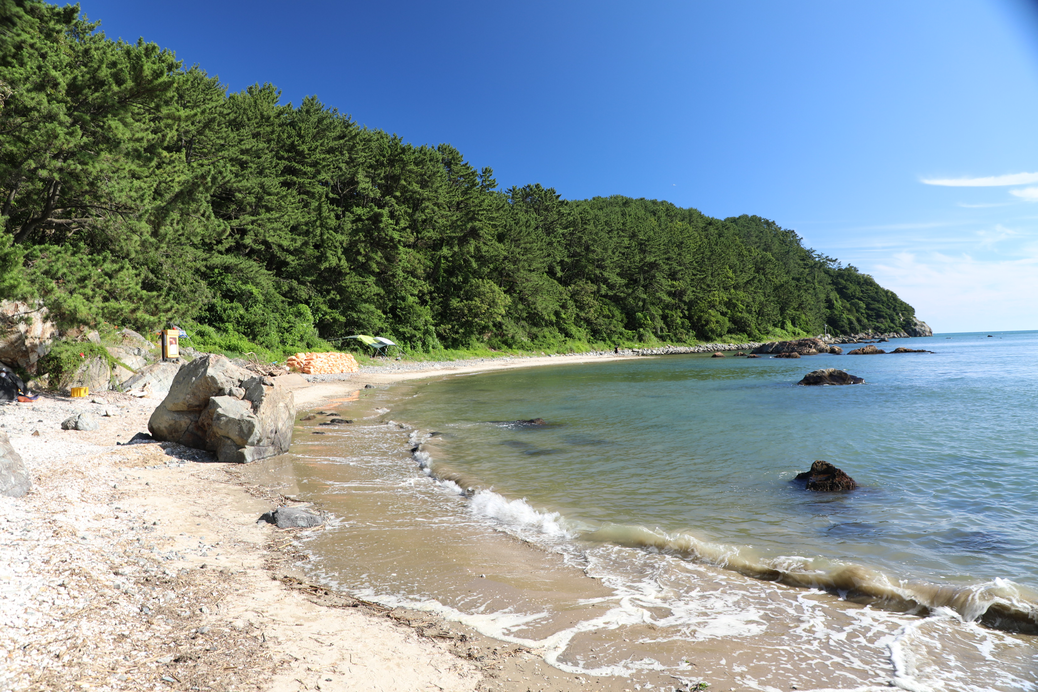 해안 자갈 마당과 어우러진 해안선은 부드럽고 완만한 편이다.
