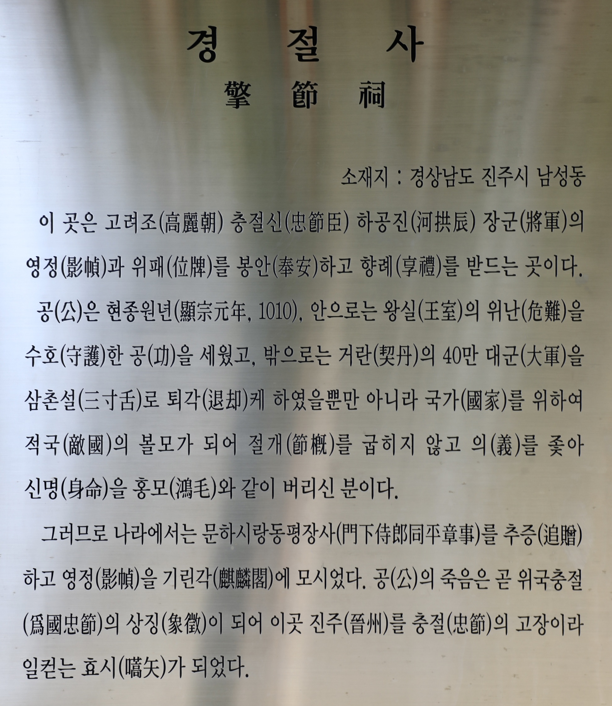 충절공 하공진 공은 진주 출신 고려 무인으로서 뛰어난 식견과 빛나는 충성심을 발휘하여 외적을 격퇴시켰을 뿐 아니라