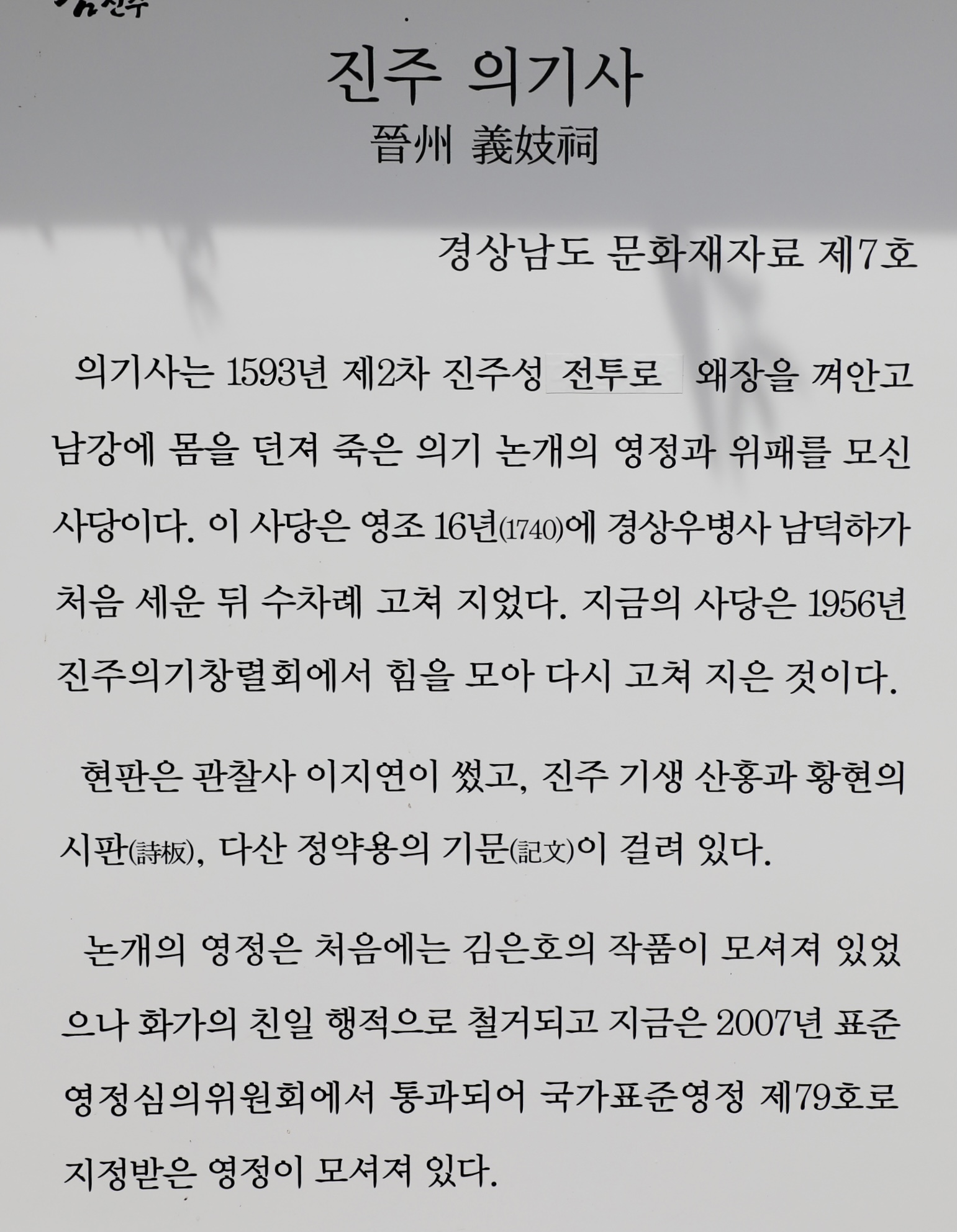 논개를 기리는 의기사와 의암이 있고, 쌍충사적비도 있다.