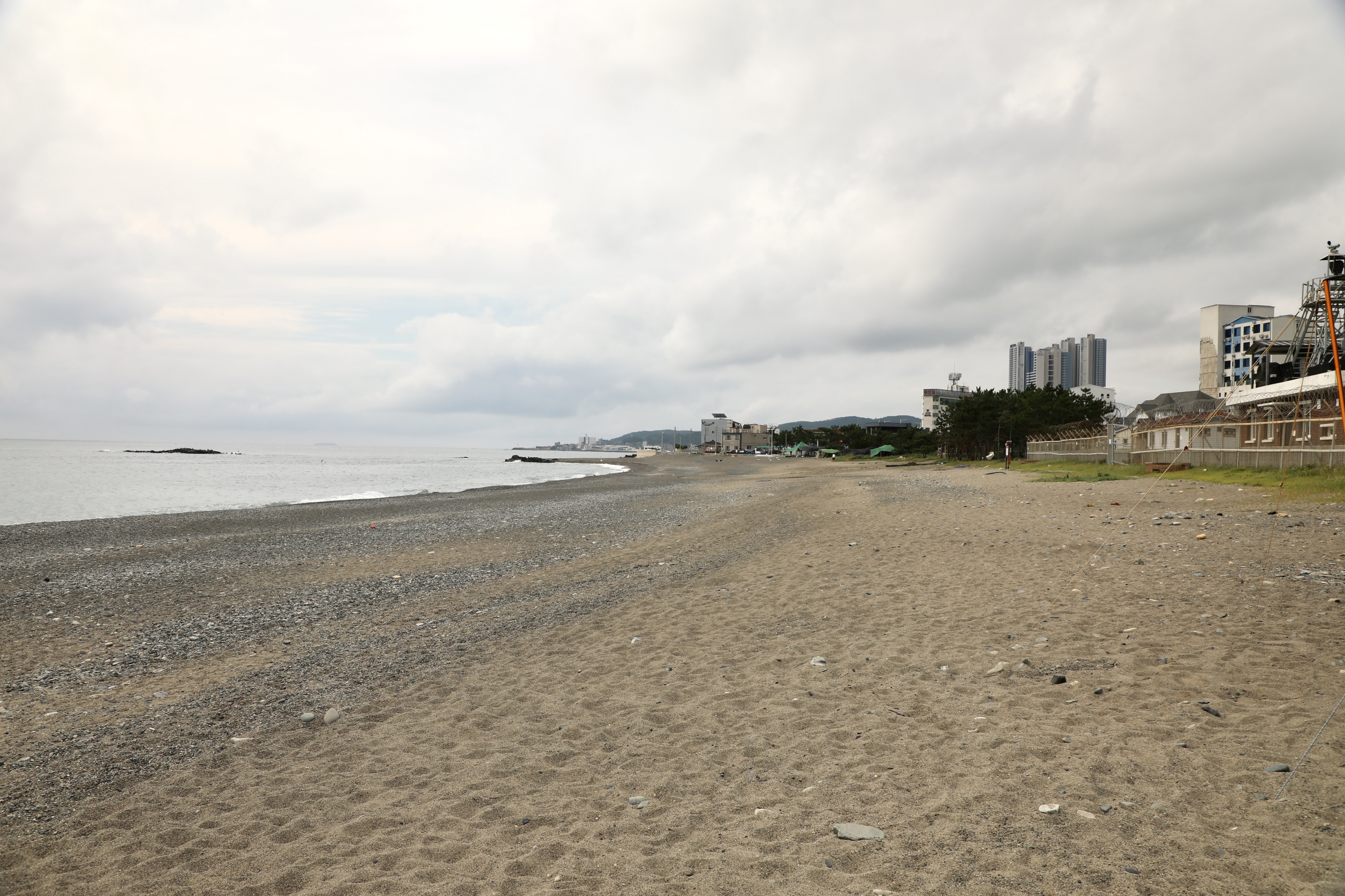 몽돌해변은 바다 쪽에 많고 바깥으로는 모래사장도 보인다.