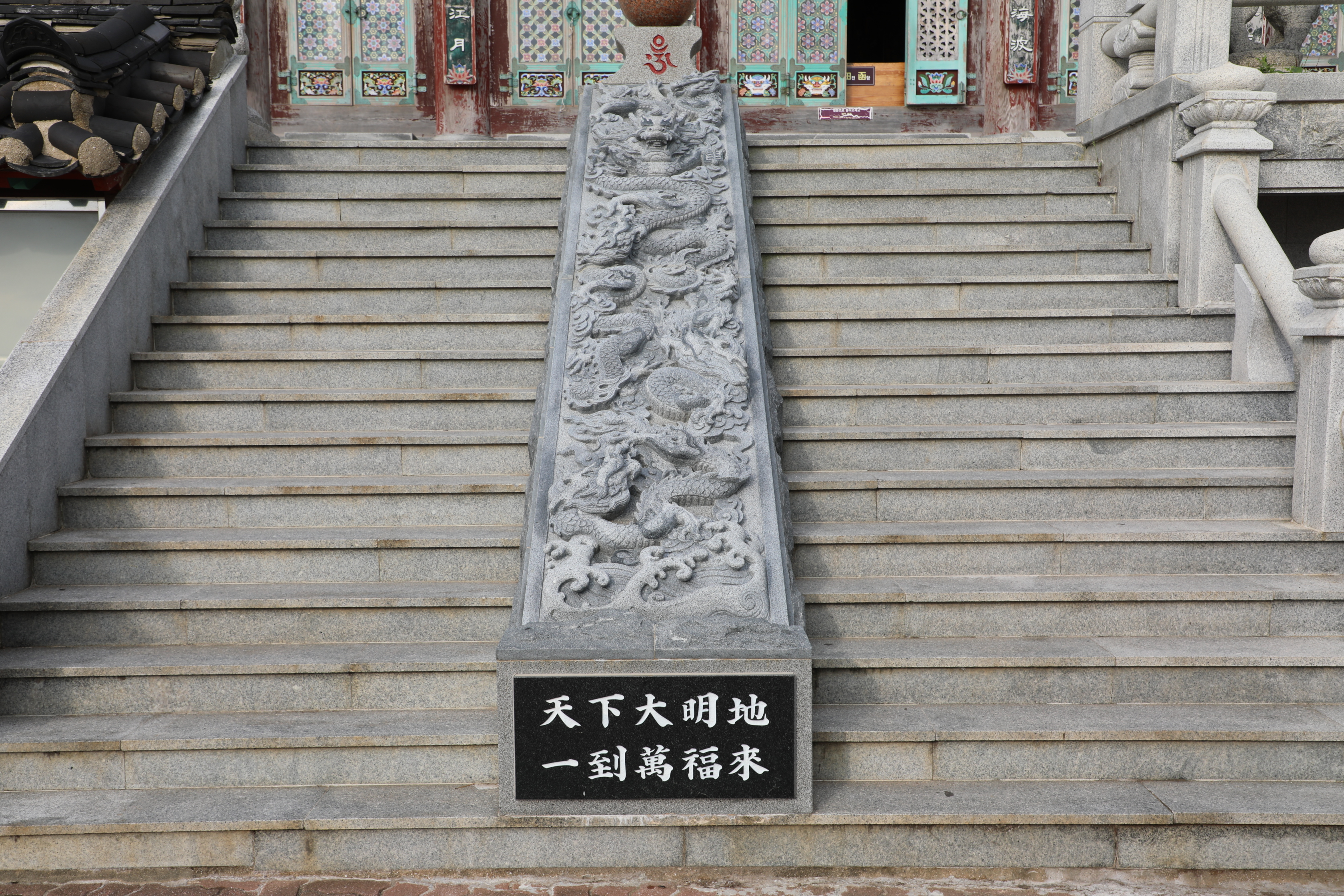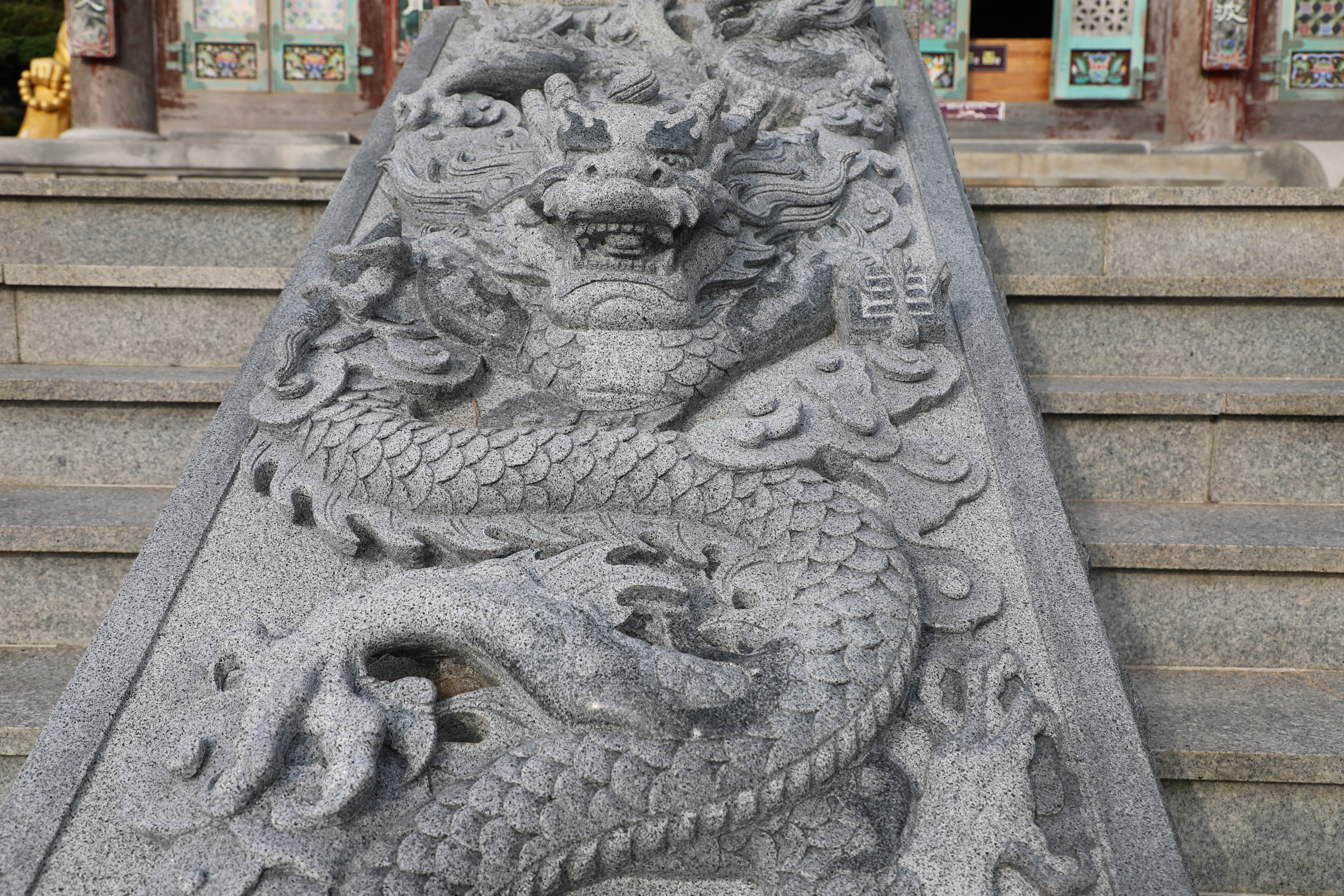 대웅전으로 오르는 돌계단의 용무늬를 새긴 돌은 전체가 하나인 통돌이다.