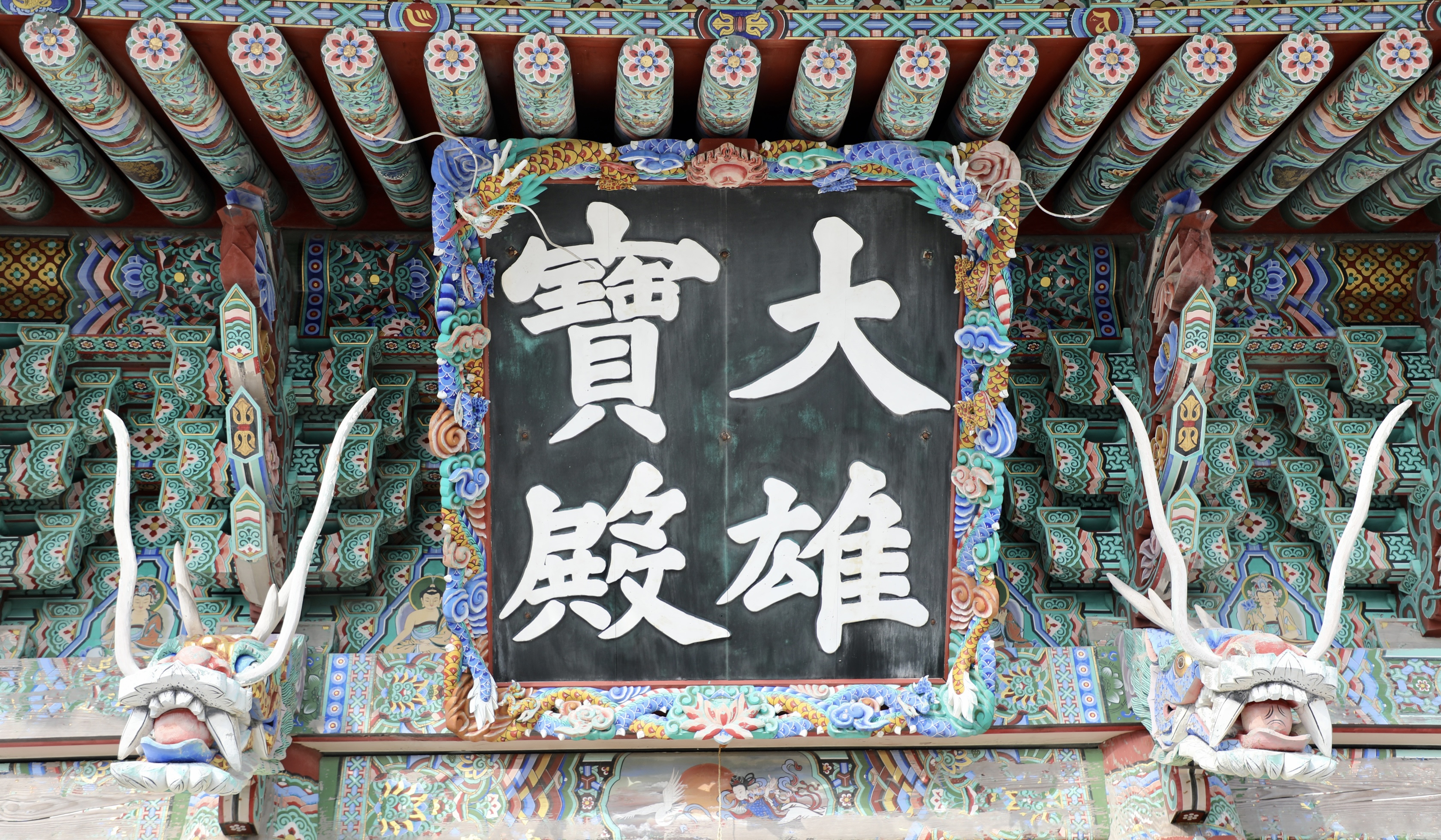 대웅보전 편액 양쪽은 용머리를 설치해 존귀하게 보인다.