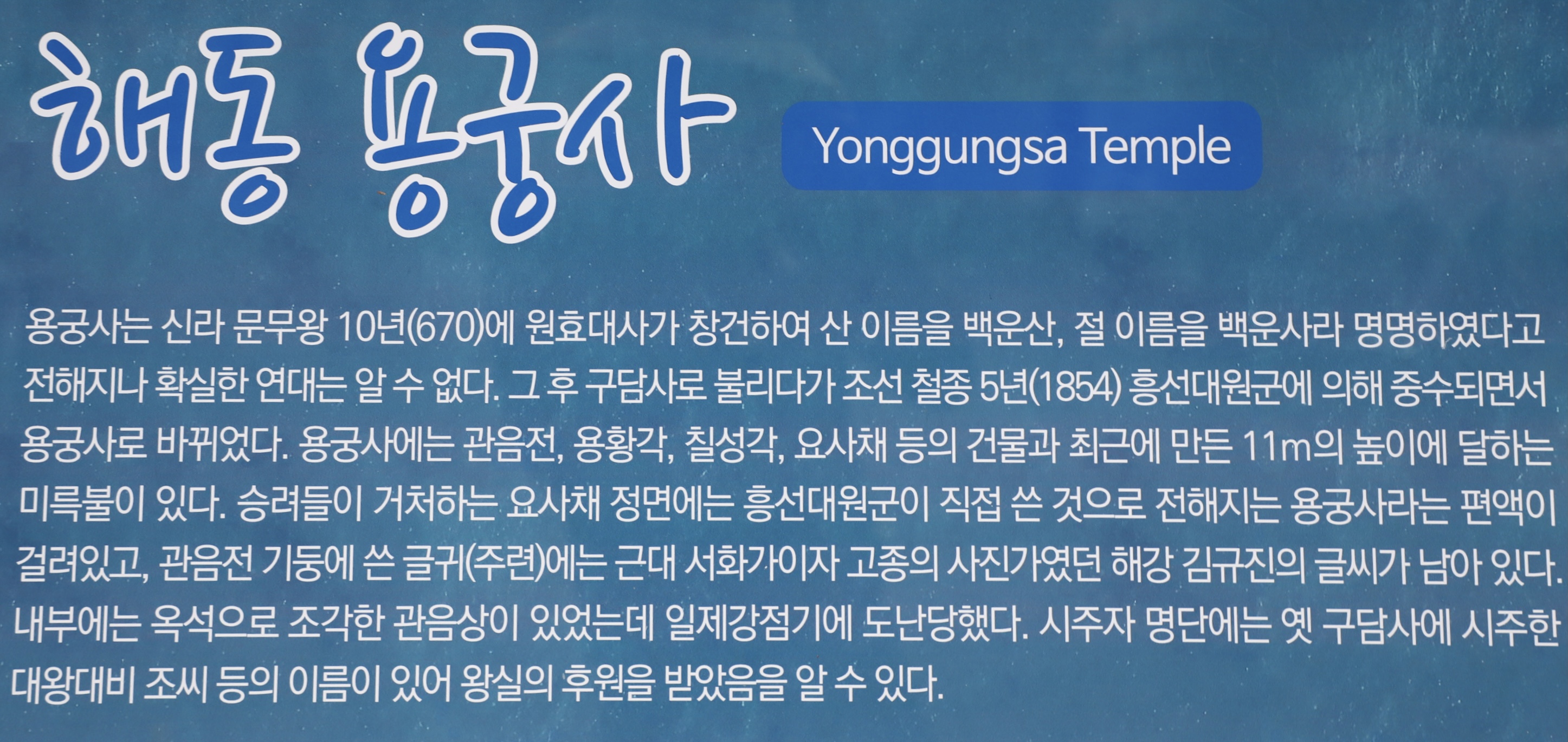 백운사에서 구담사로 불리다가 바다와 가까워서인지 어느새 용궁사로 바뀌었다.