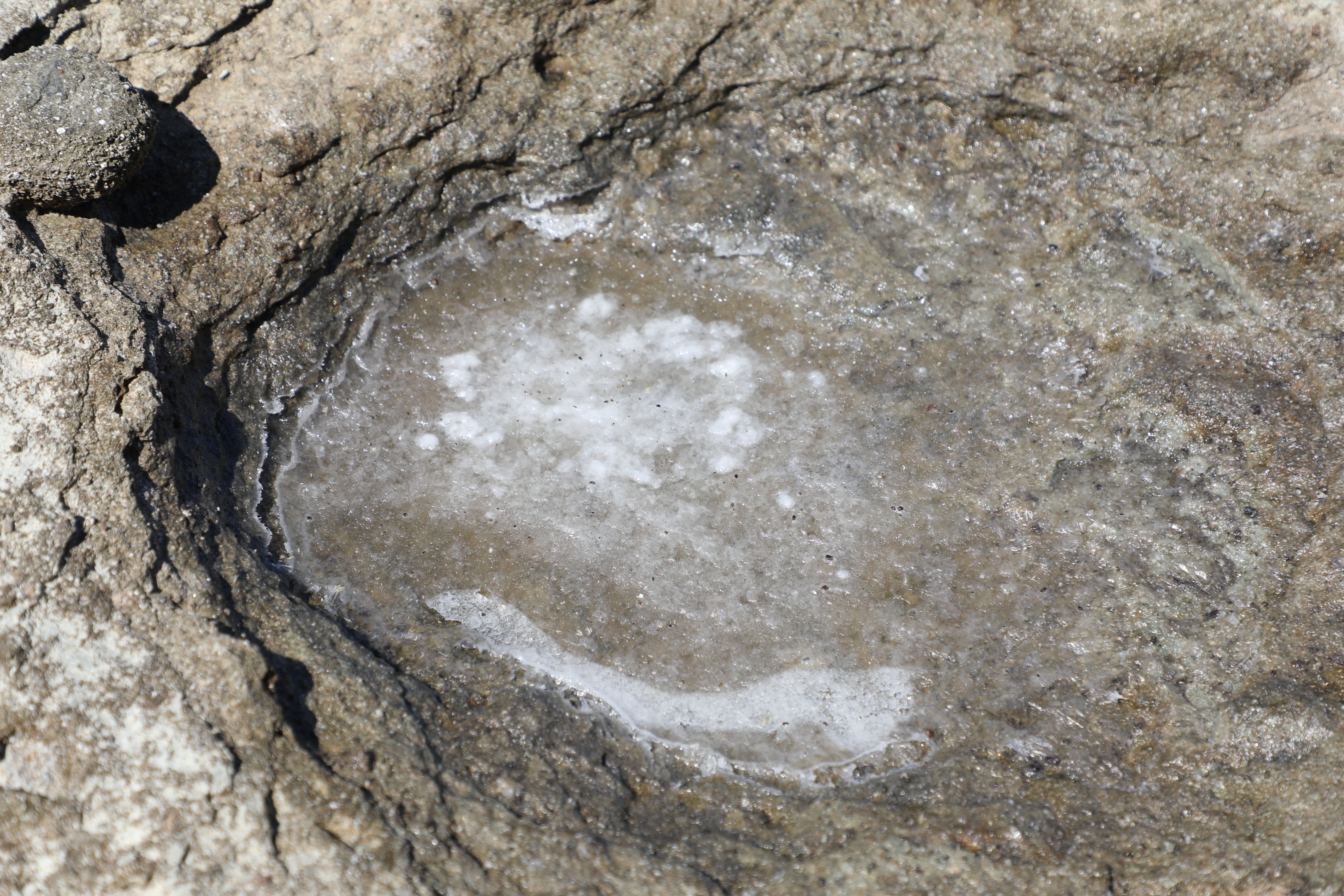 돌확처럼 구멍이 생긴 바위에 바닷물이 증발하며 소금을 만들고 있다.