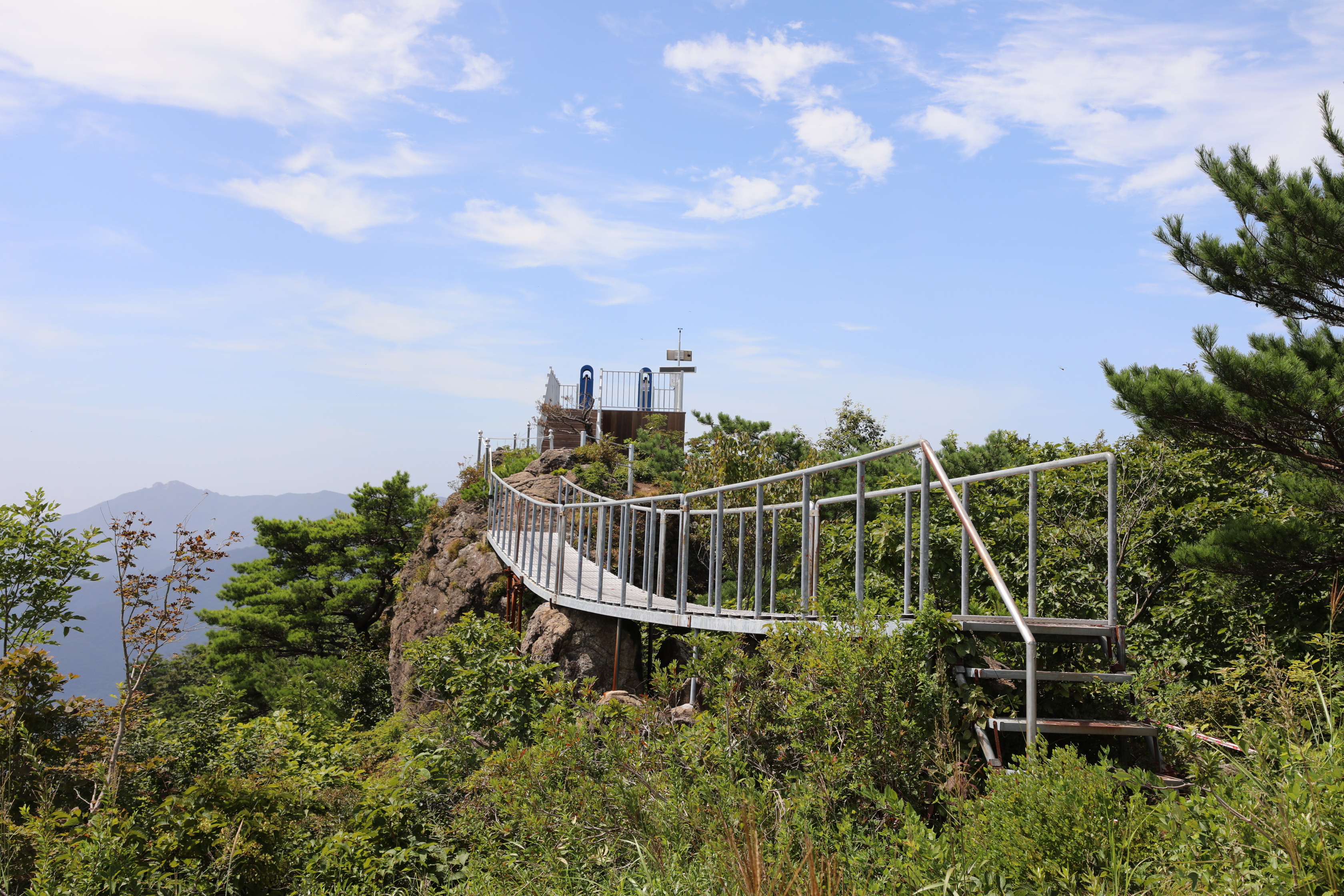 커다란 암봉 위에 구름다리가 설치돼 암봉을 다 오르면 갑자기 구름다리가 튀어나오듯 보인다.