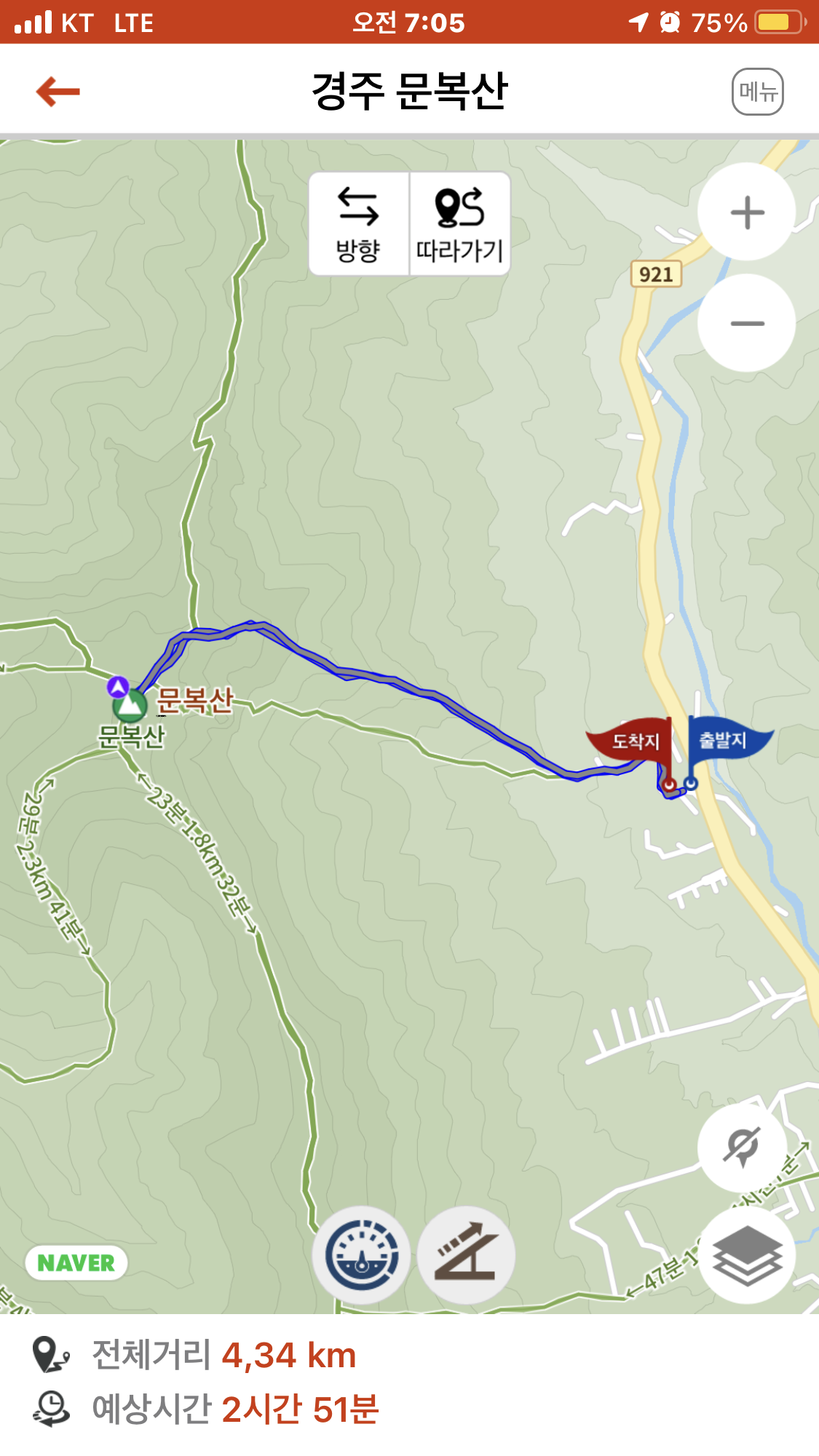 남쪽 산비탈을 올라 정상에 갔다가 다시 남쪽으로 내려오는 길을 선택한다.