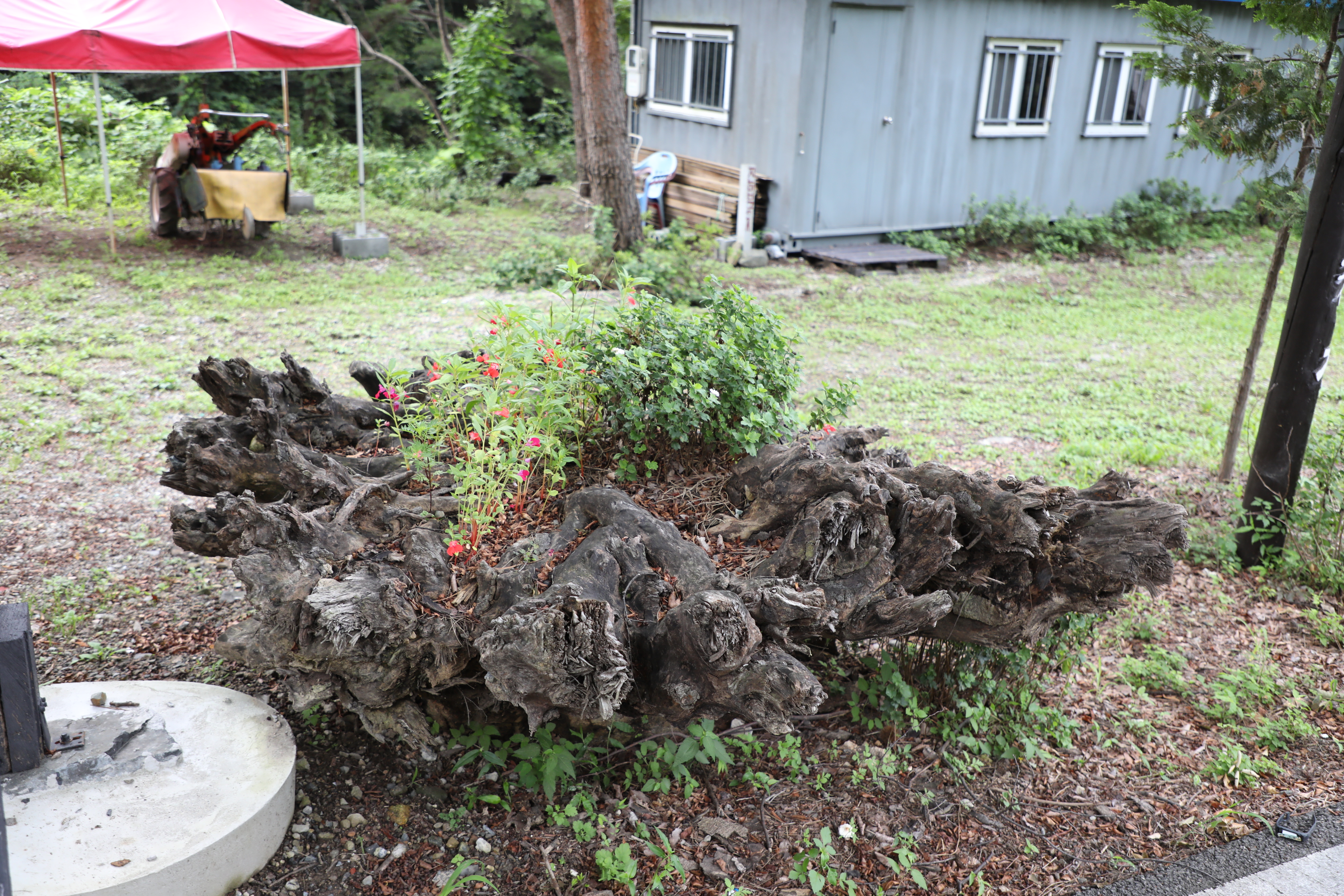 나무뿌리를 화분 삼아 꽃을 가꾸는 센스가 돋보인다.