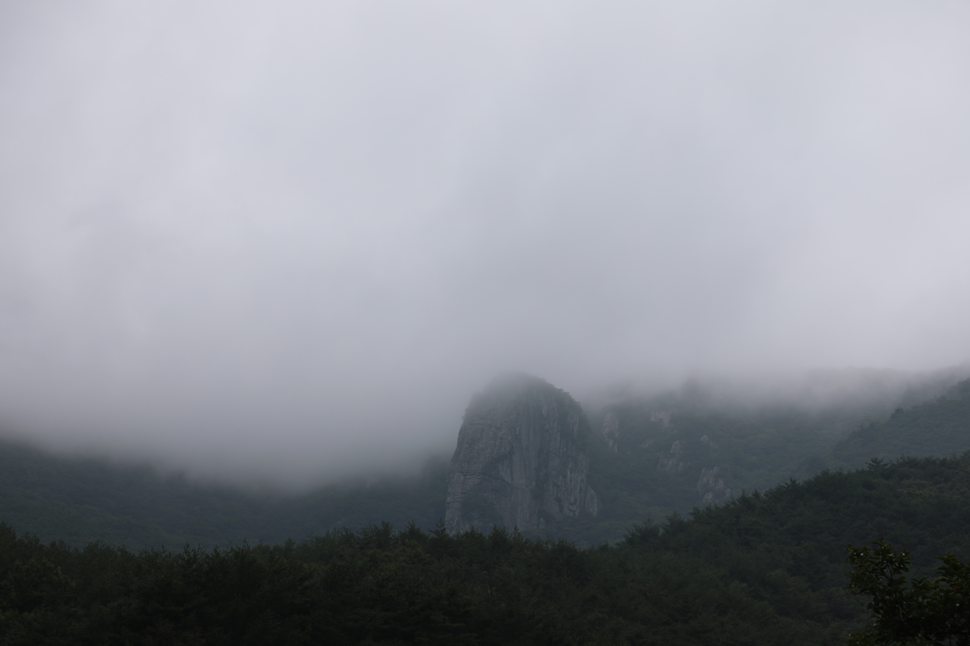 하산할 때 드린바위로 발을 들여놓다가 비가 내려 미끄럽기도 하고 안개도 심해 조망이 없겠다는 생각에 포기한다.
