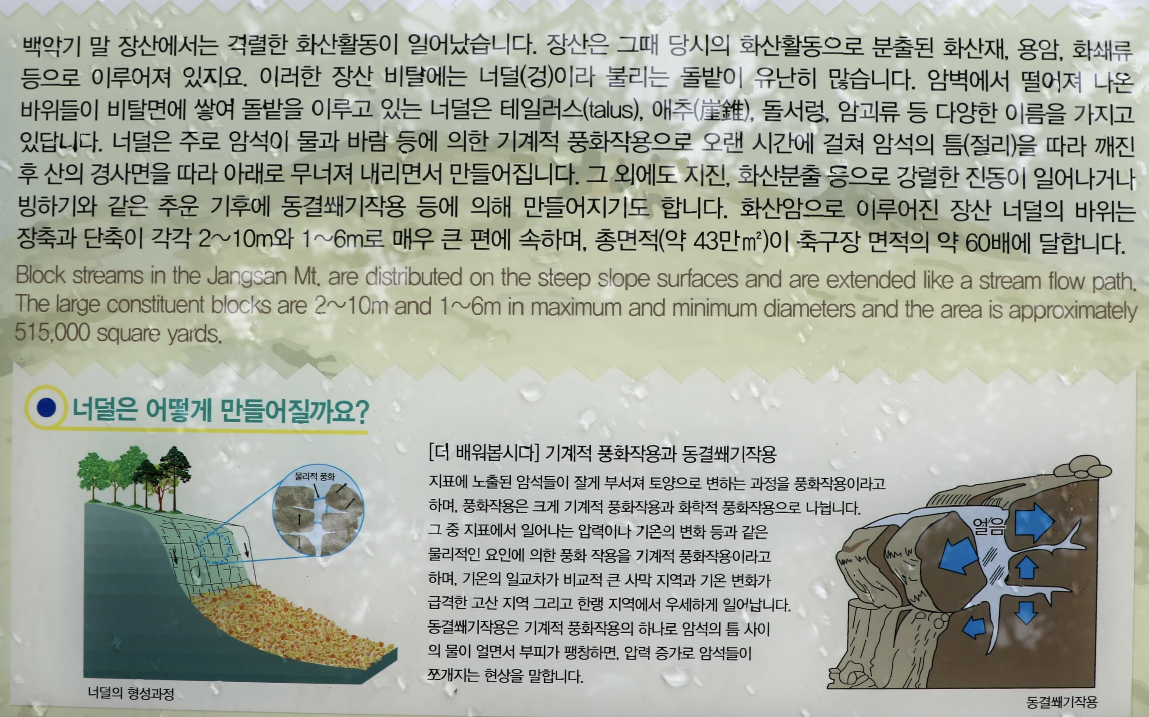 이런 무거운 암괴가 중력에 의해 비탈면에 쌓이게 되면 너덜겅(돌서렁) 지대가 형성된다.