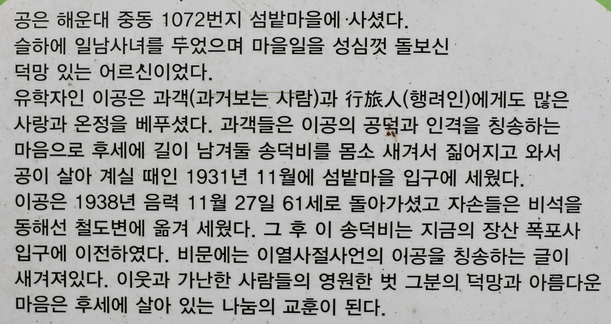 개조할 때 목재로 운반하는 일 품삯 등은 5개 동(재송동, 우동, 중동, 좌동, 해동)이 전담했다'라고 기록하고 있다. (안내문)