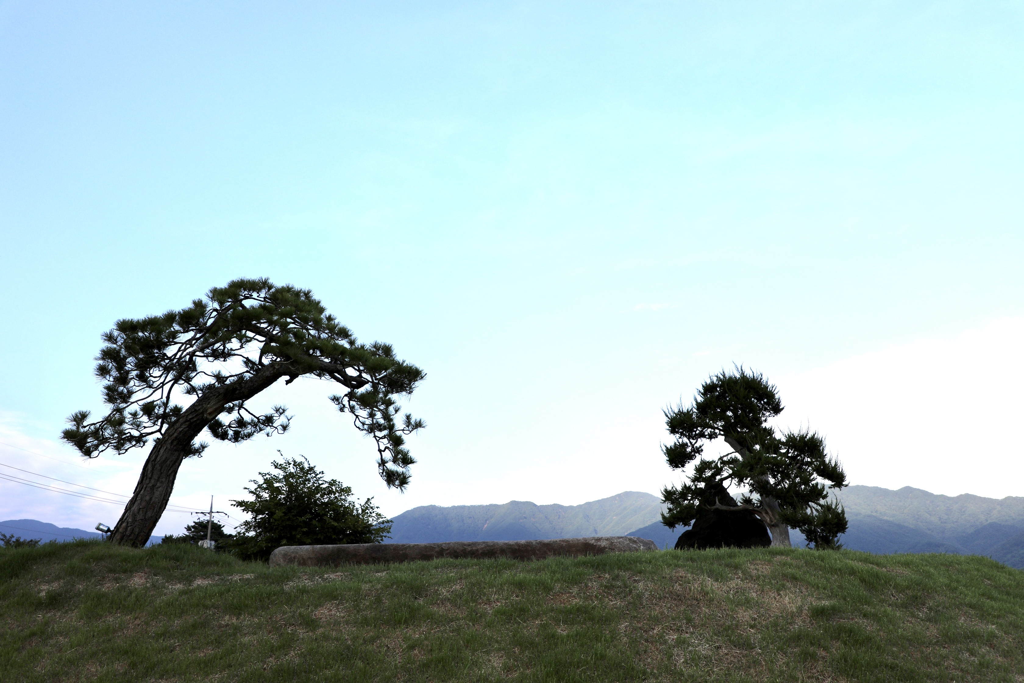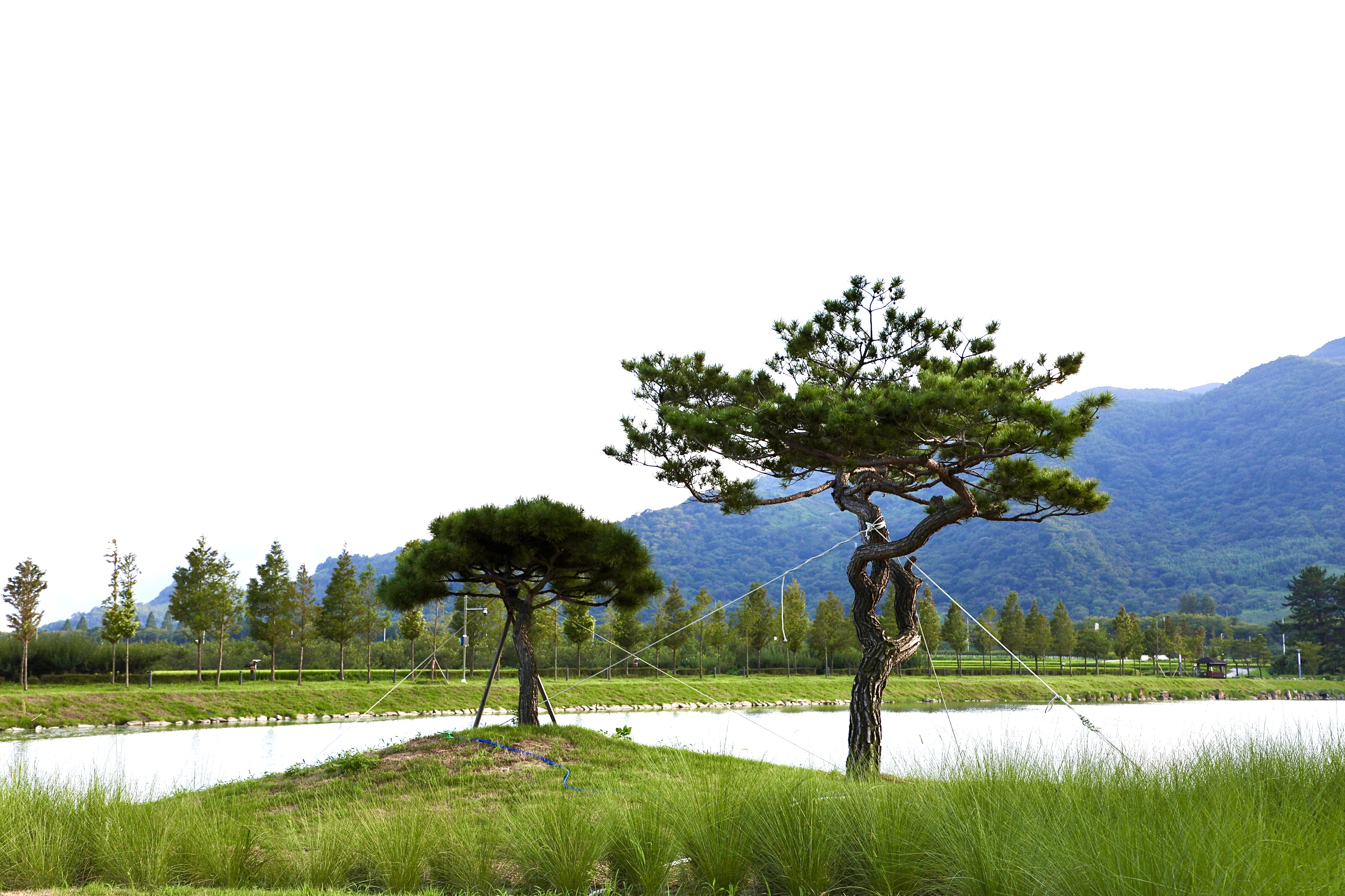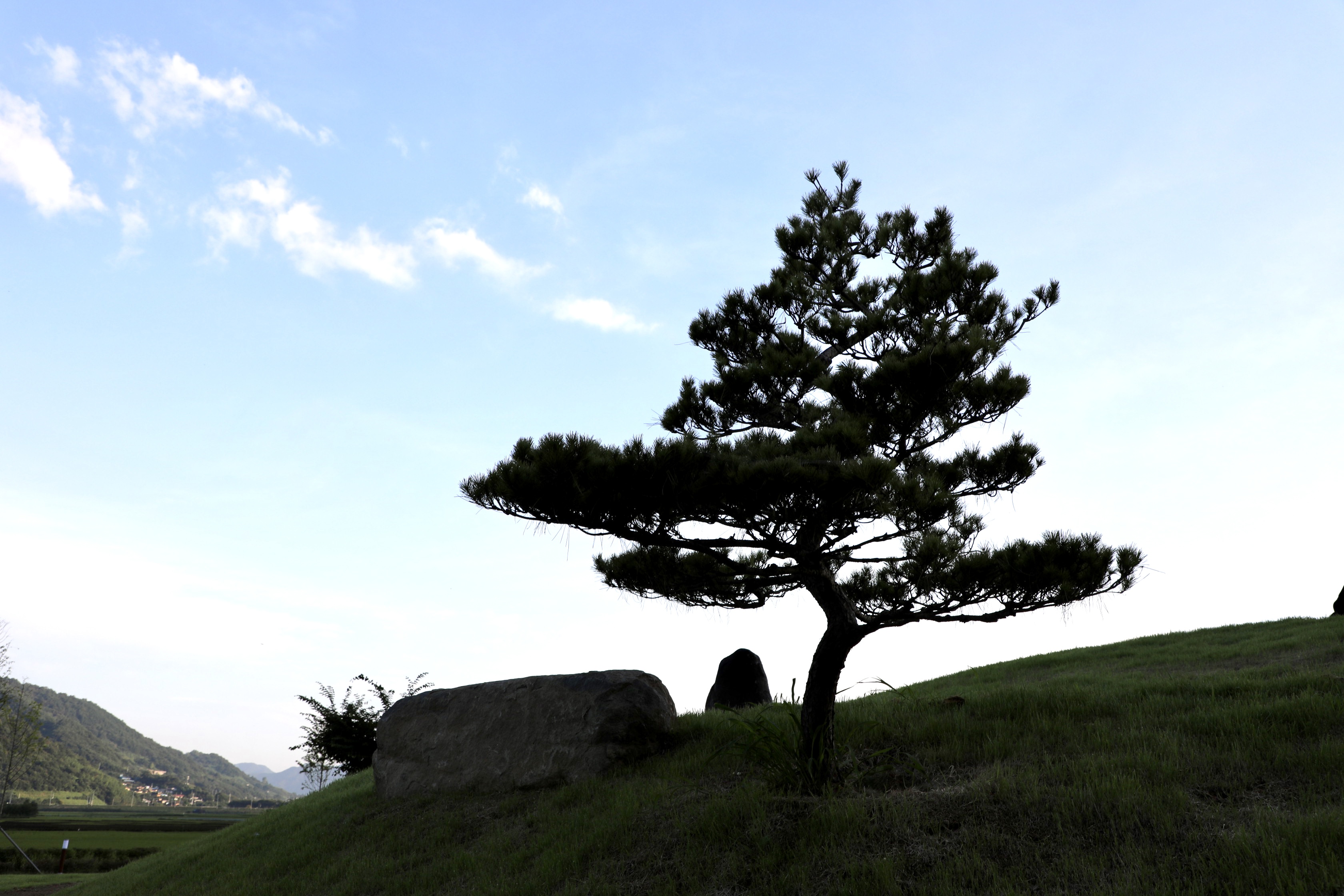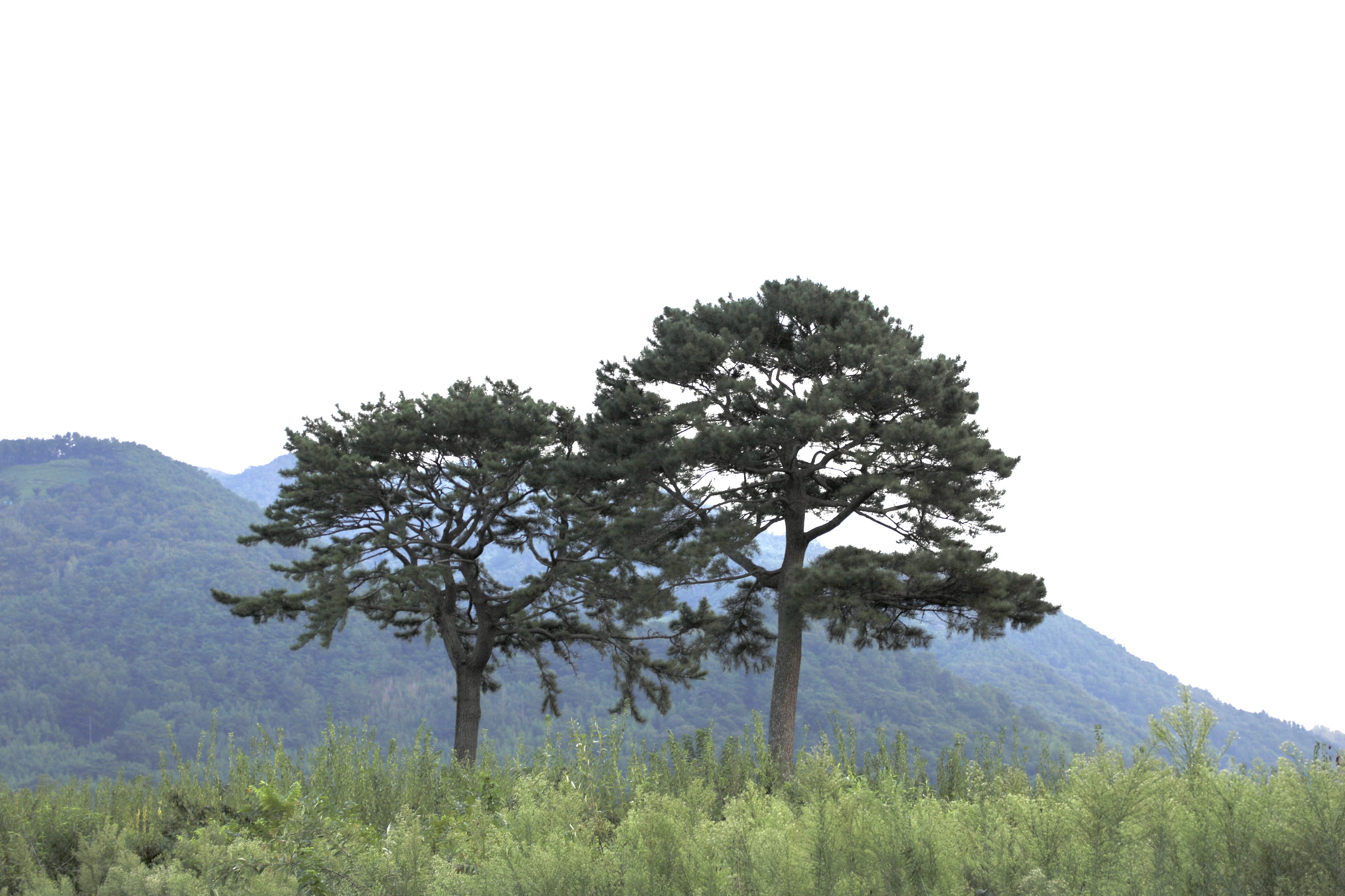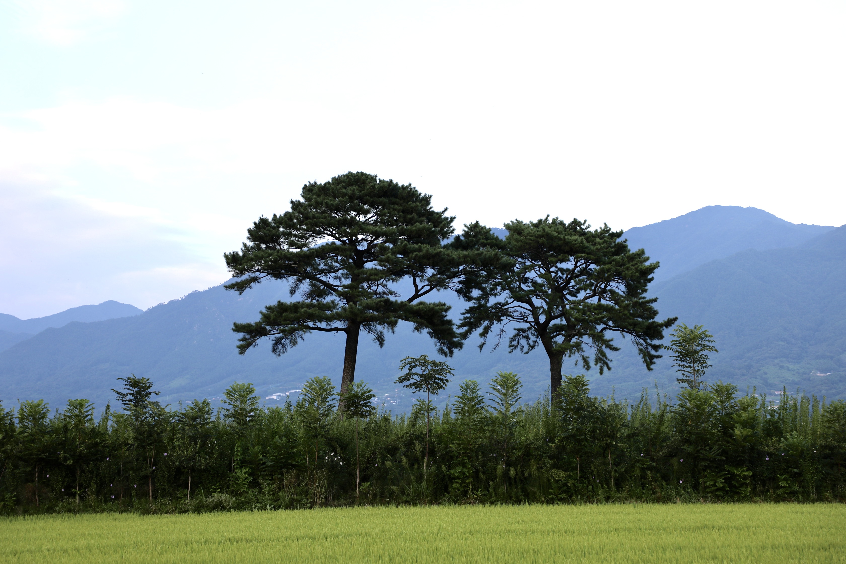 논뿐인 들녘에 약간 둔덕인 밭 가운데 소나무가 쌍으로 있다.