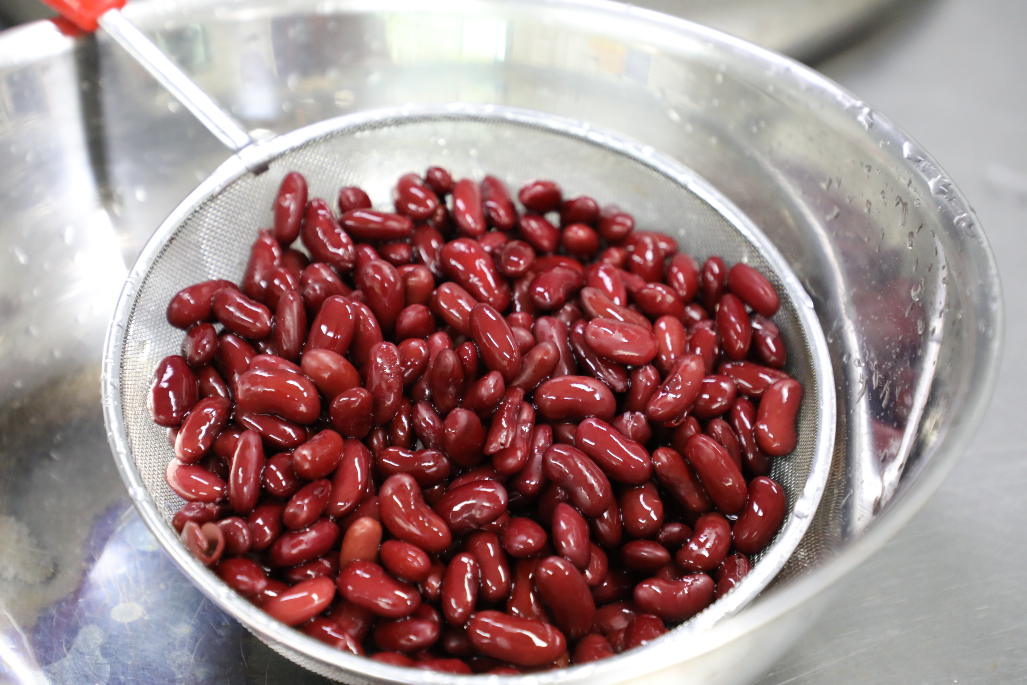 미리 준비한 팥이나 완두콩을 넣고 끓일 때 눌어붙지 않게 계속 저어야 해.