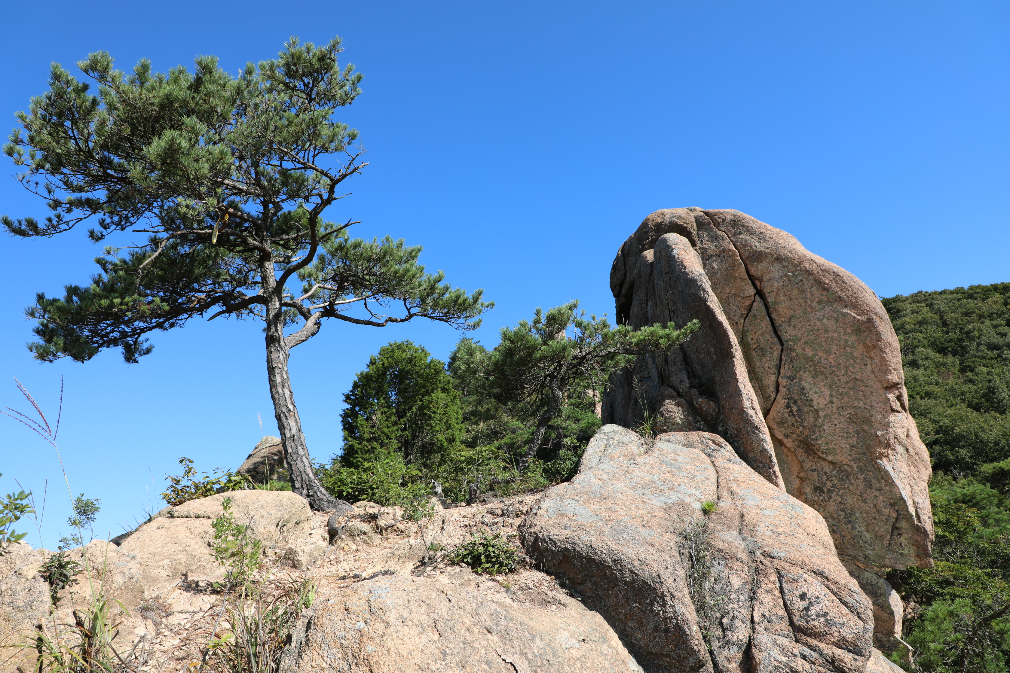 맑은 하늘에 보안등이 뽐내는 암릉의 각축이 볼만하다.