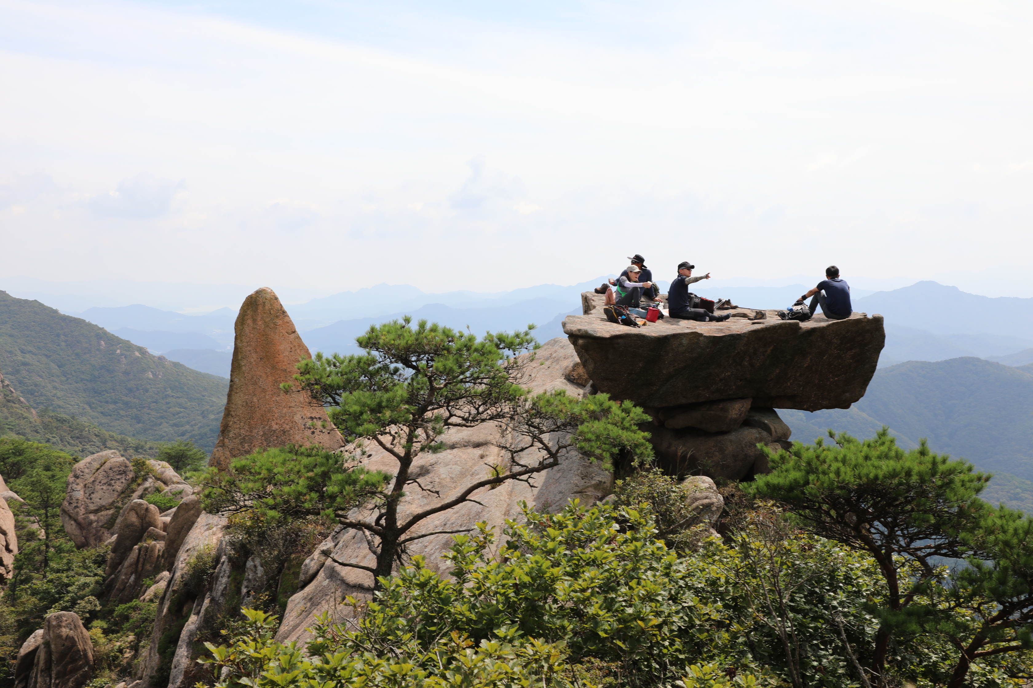 오늘 앞서거니 뒤서거니 하며 오르던 팀이 근사한 너럭바위에서 식사를 하며 쉰다.