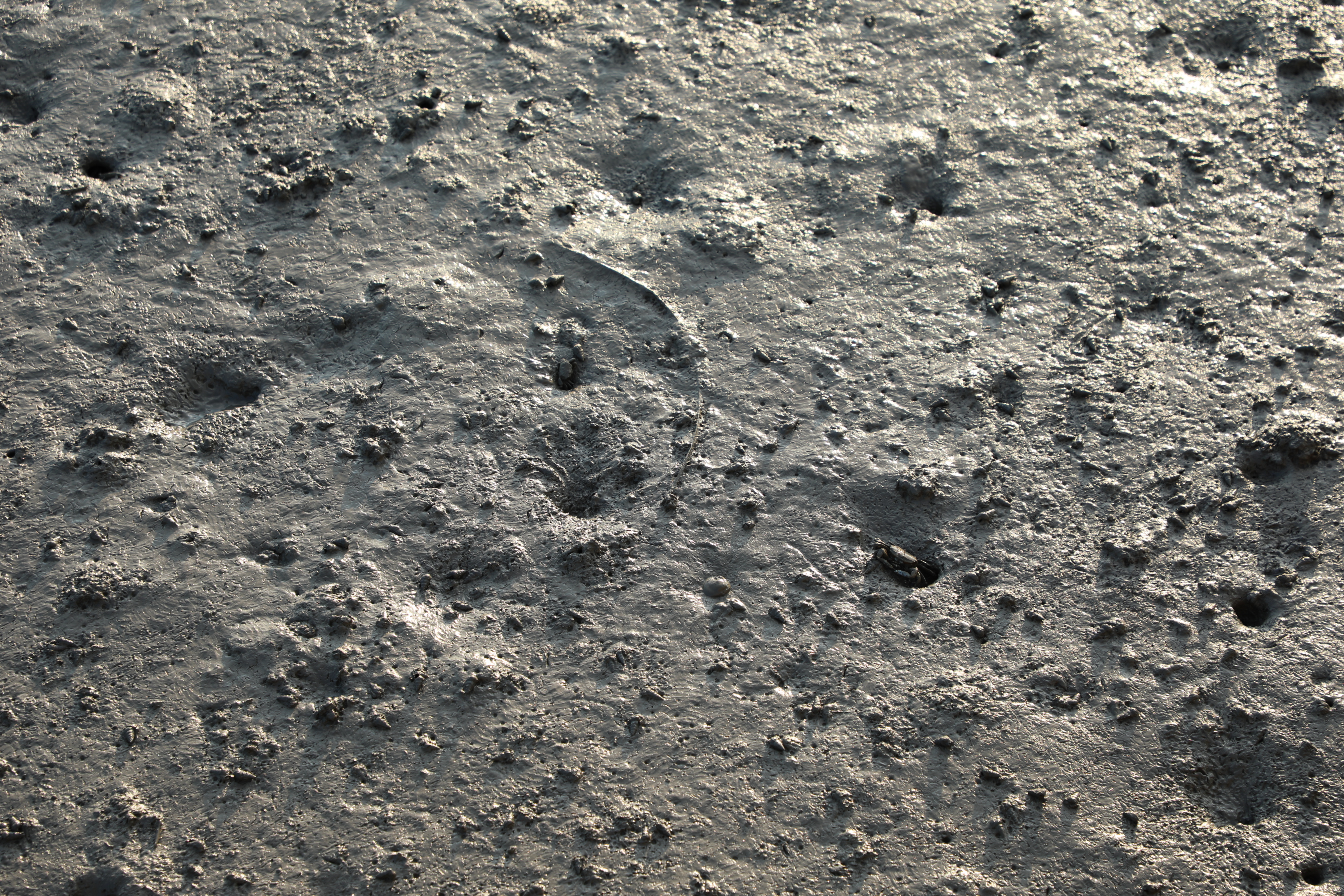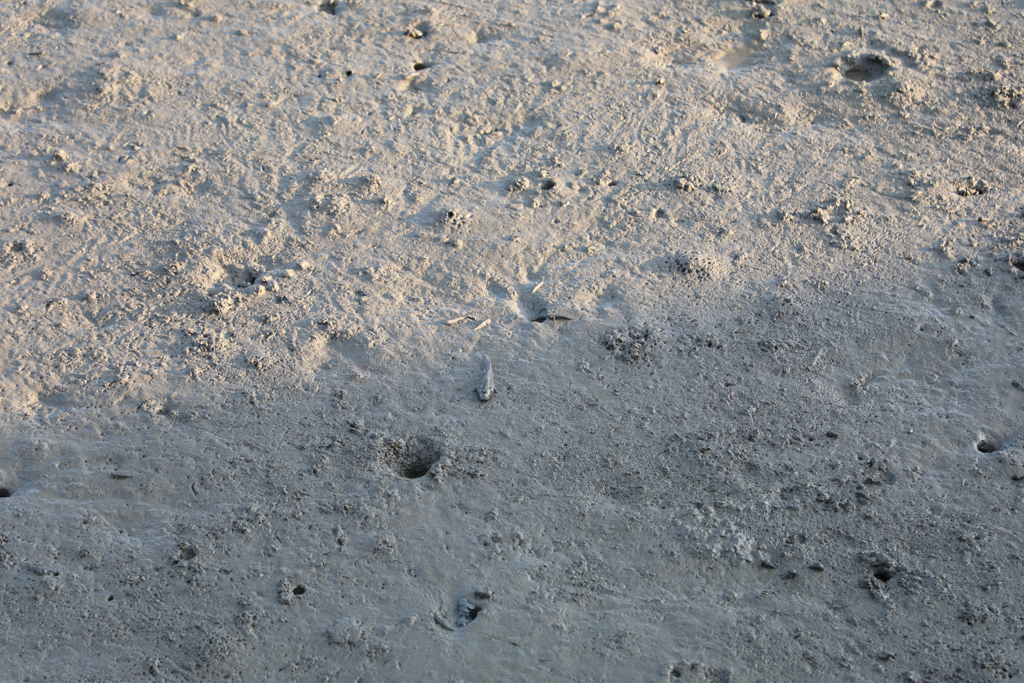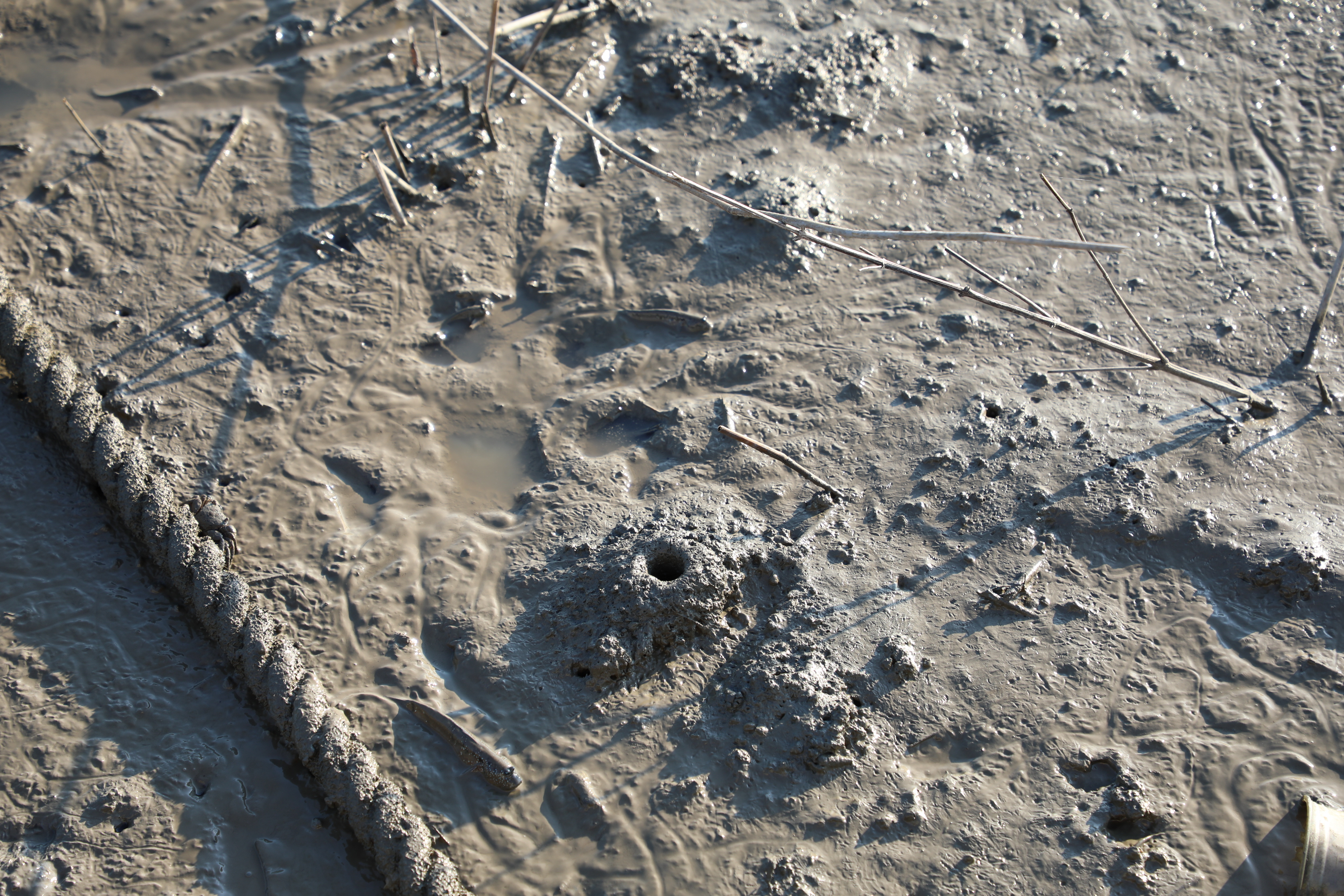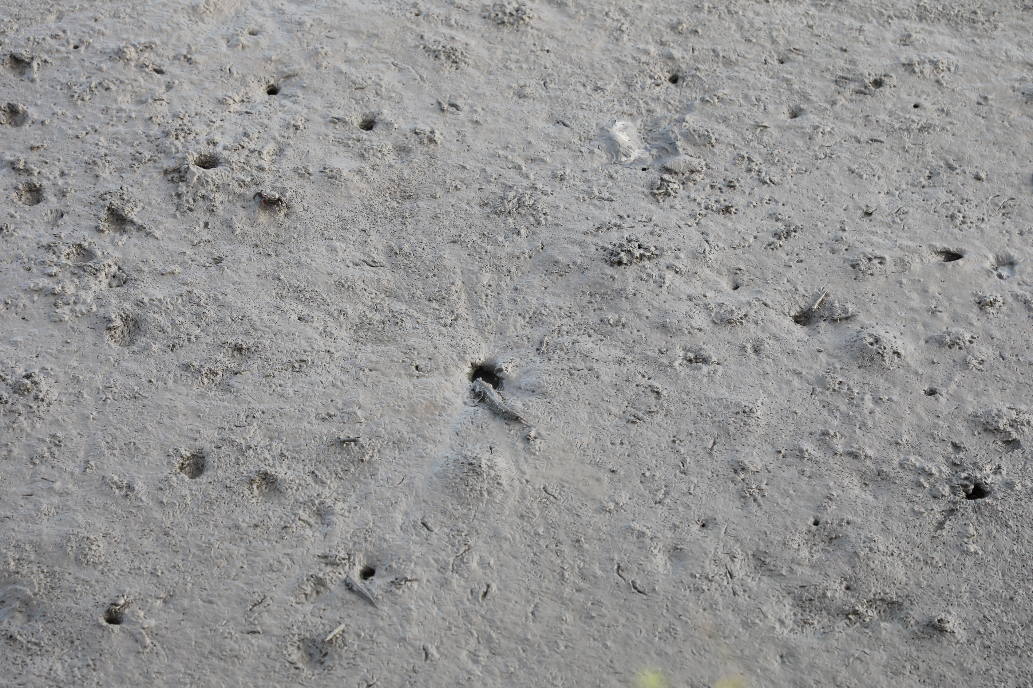 잘 놀던 게나 짱둥어가 발자국 소리만 들리면 후다닥 구멍 속으로 사라진다.