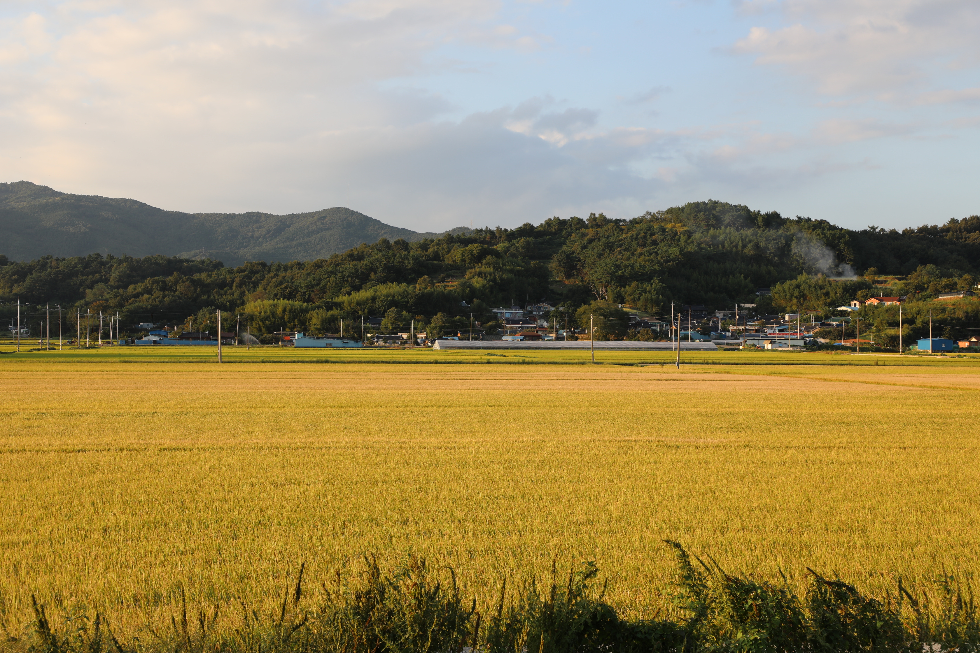 시커먼 갯벌 옆 농지엔 황금색 벼가 고개를 숙이며 수확을 앞두고 있다.