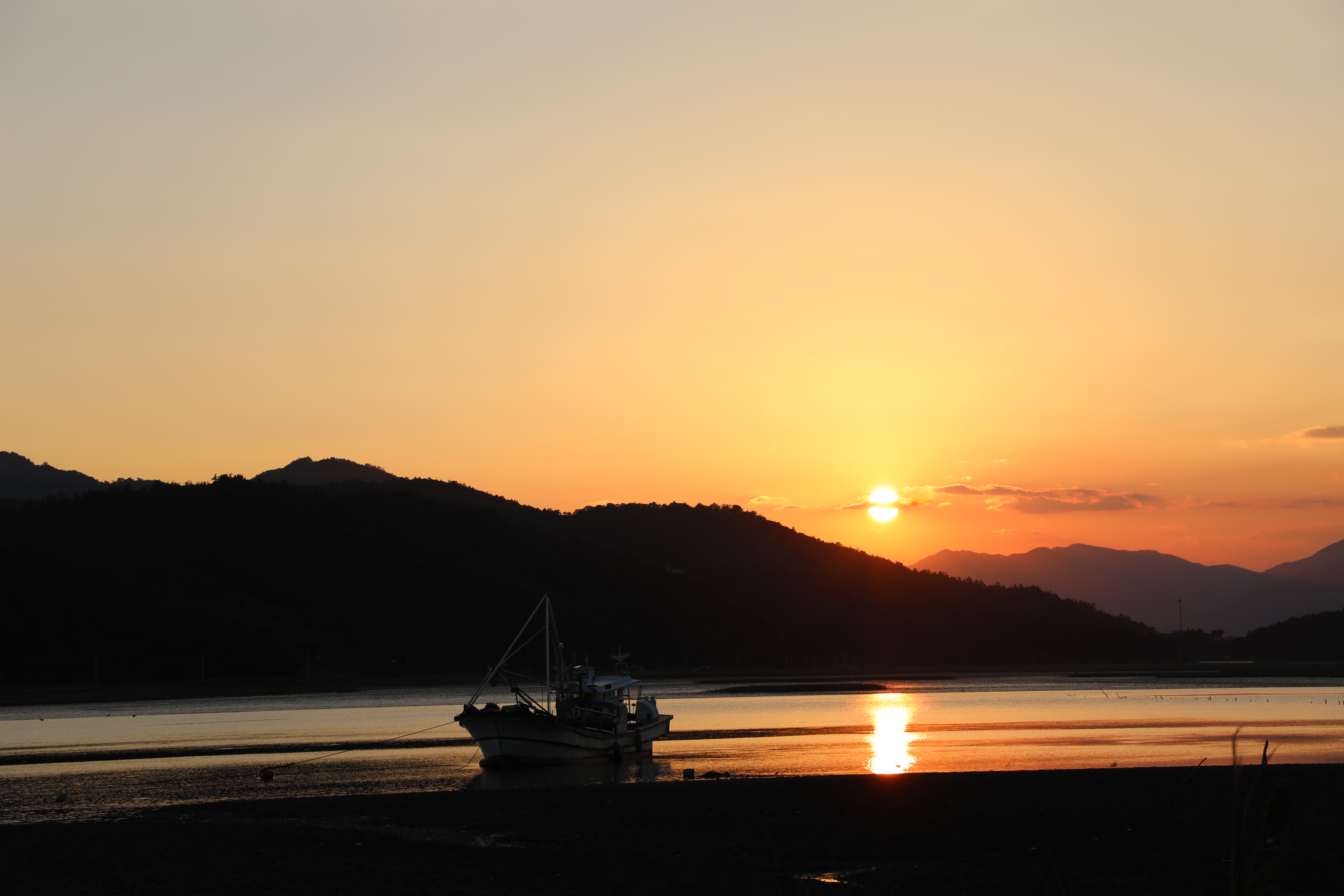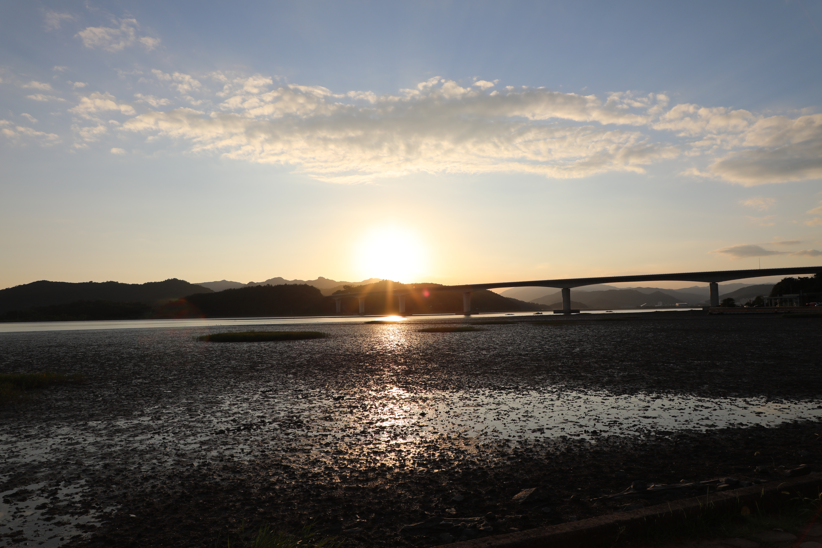 석양에 지는 노을이 갯벌과 산 사이 바다에 반영된 모습이 절경이다.