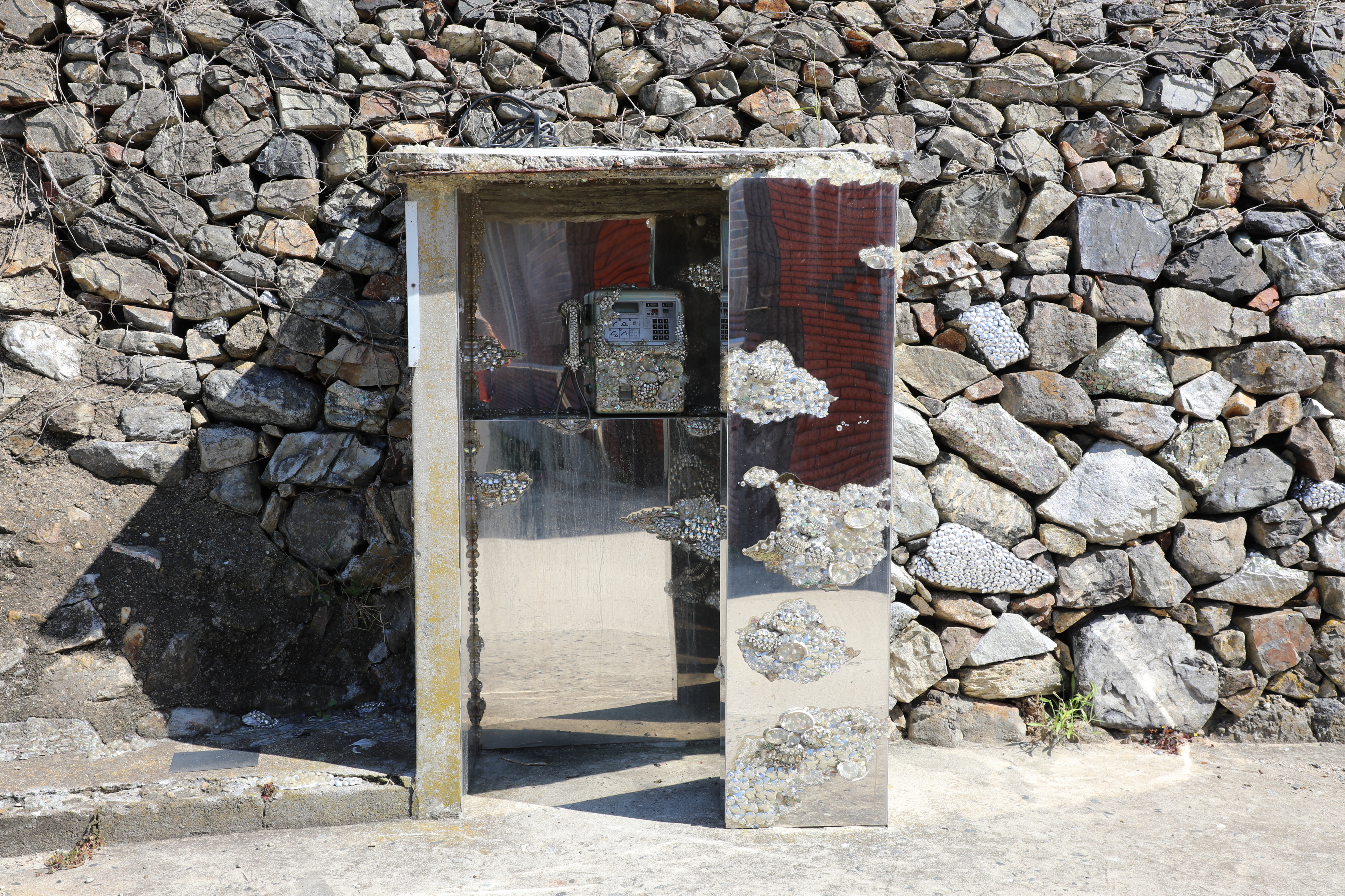 골목을 통과하는 데, 공중전화 박스를 구슬과 조개껍질로 요란하게 장식했다.