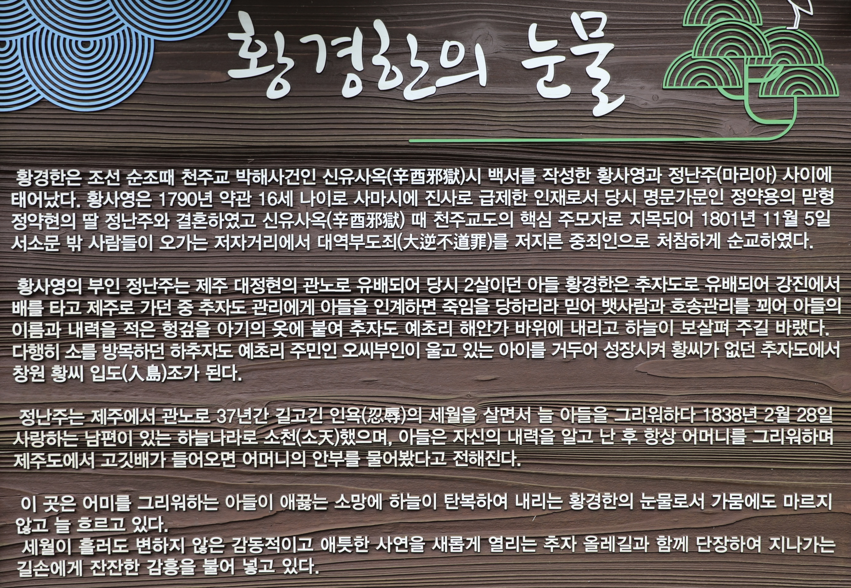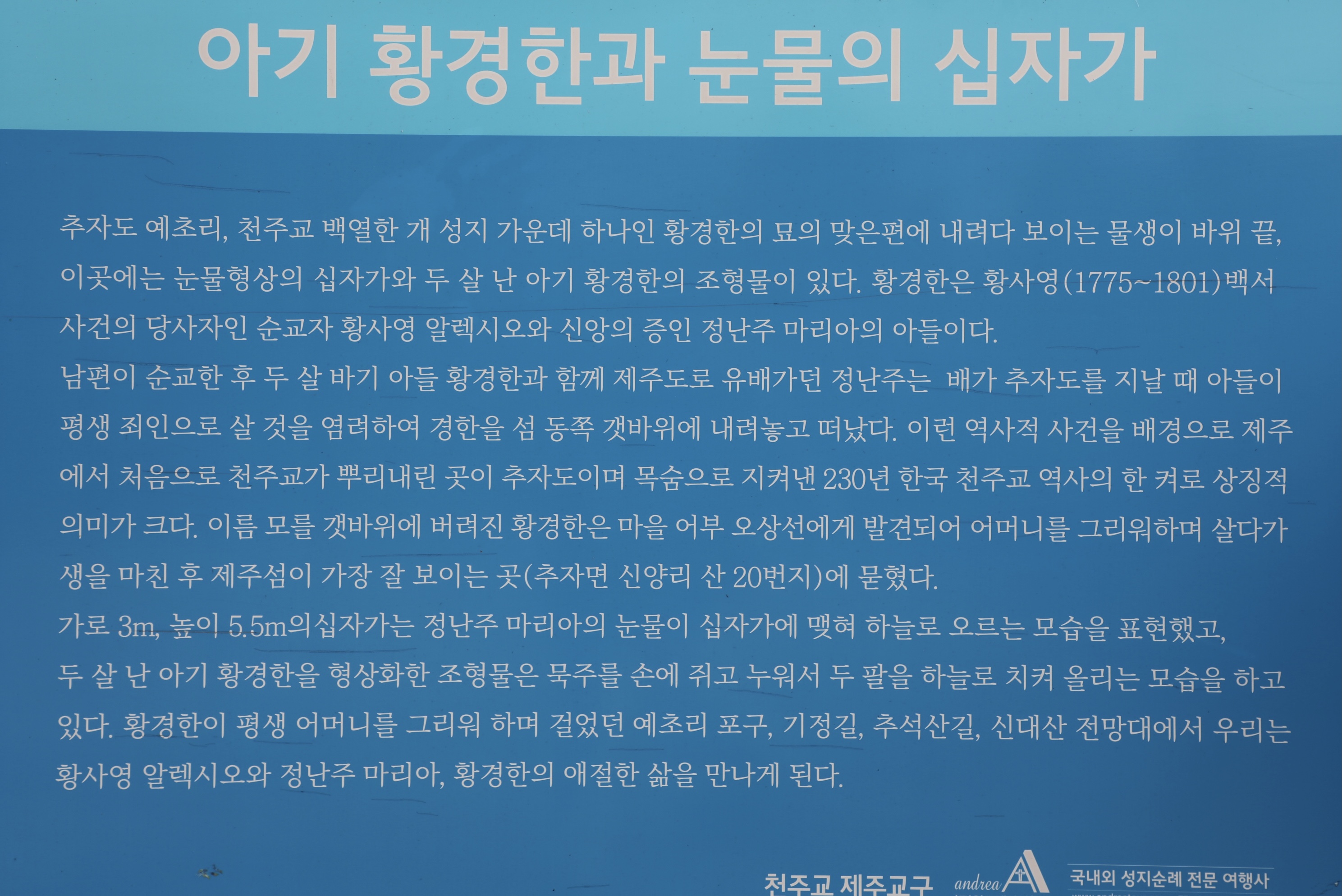 황사영은 백서 사건으로 순교하고 아내는 두 살인 아들 경헌과 제주도로 유배중 호송선이 예초리에 머물자