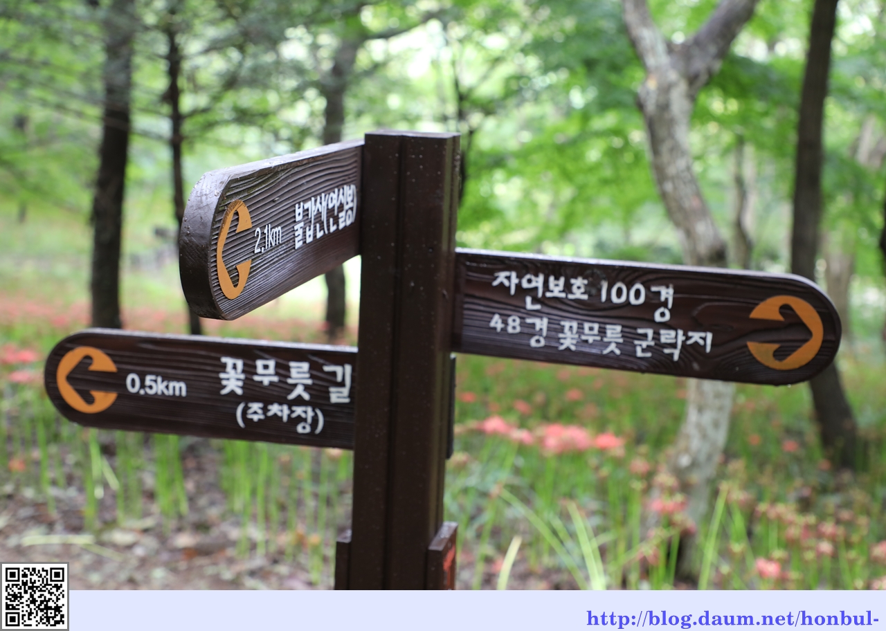 용천사로 들어가기 전 "자연보호 100경 중 48경 꽃무릇 군락지" 이정표를 보고 방향을 돌린다.