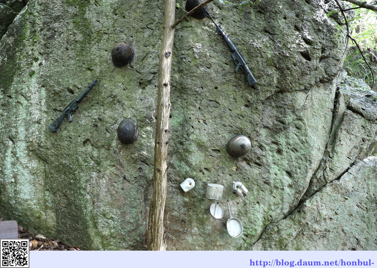바위에 걸린 총이며 헬멧, 수통 등이 그 시절의 아픔을 되새기게 한다.