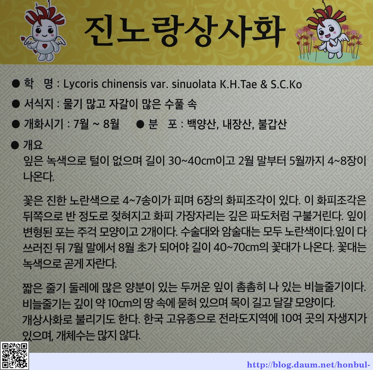 상사화 교육홍보관 앞에서 붉노랑꽃무릇과 노랑꽃무릇을 보며 궁금증이 풀린다.