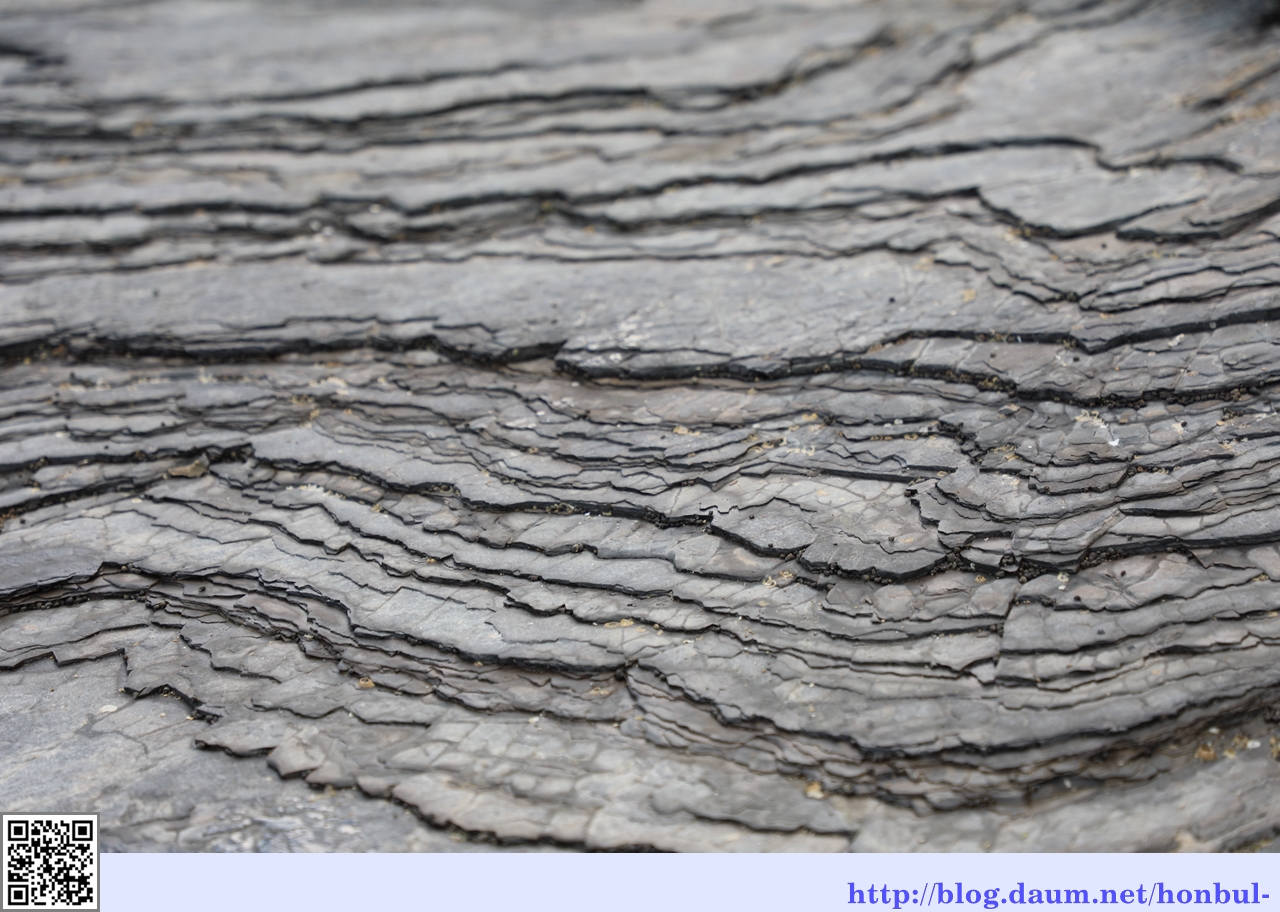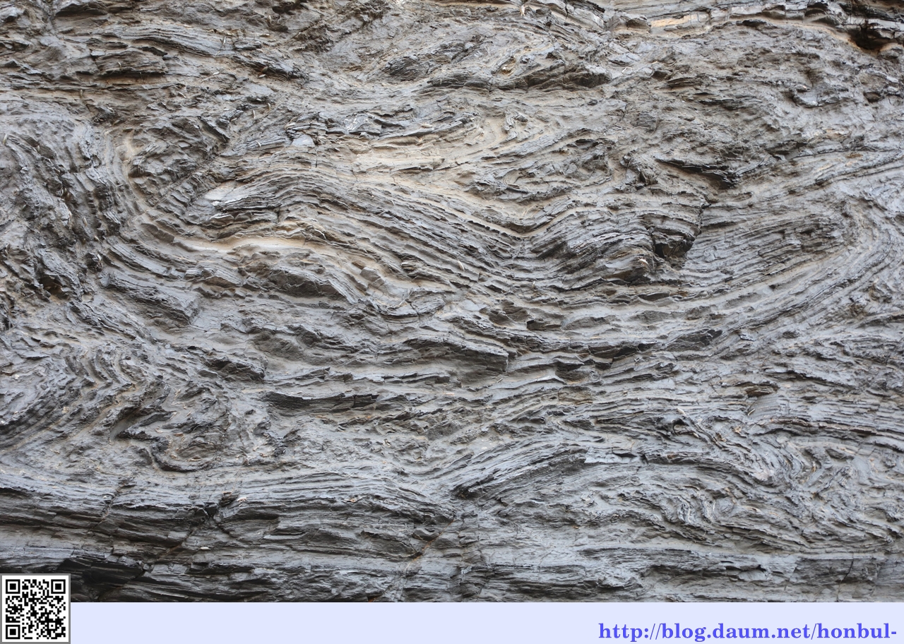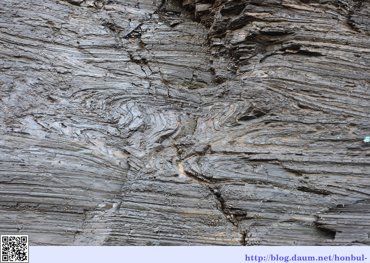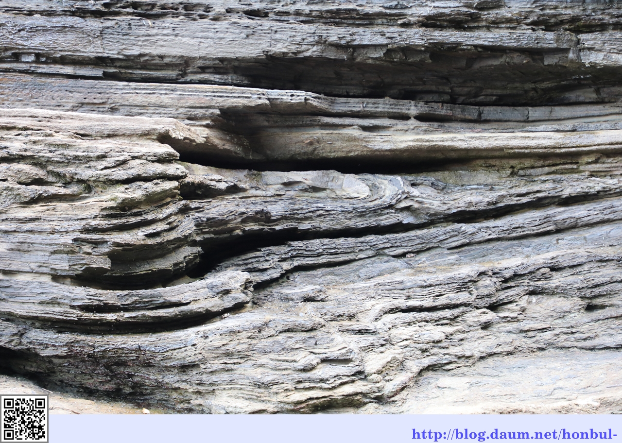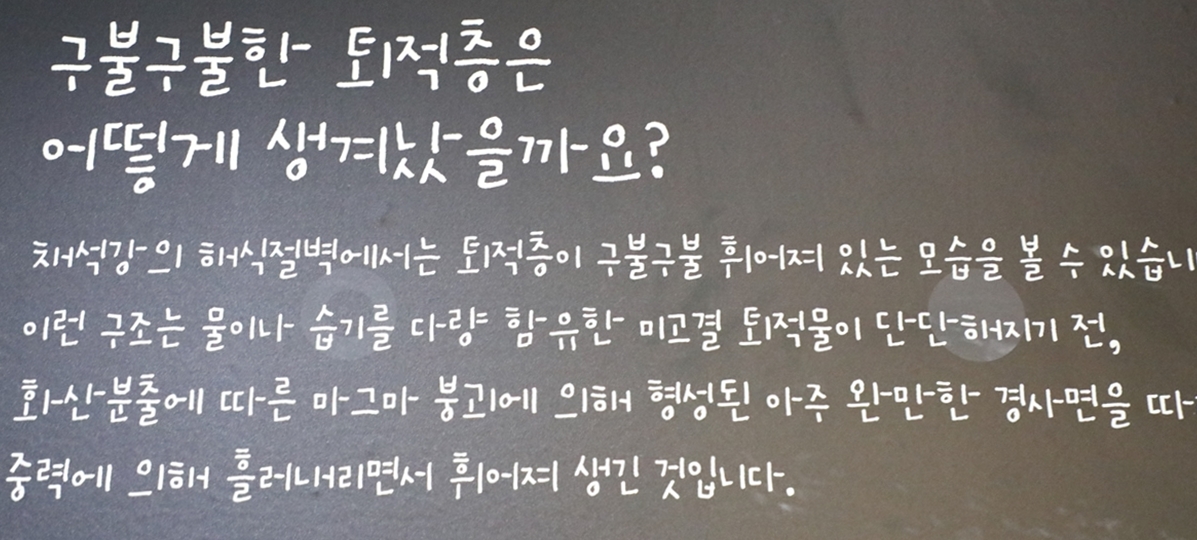 책을 쌓은 듯 직선 형태의 퇴적층만 있는 게 아니라 이렇게 다양한 형태를 보이는 퇴적층도 있다.