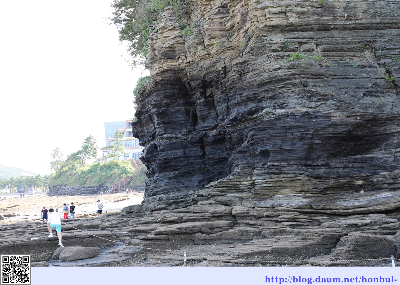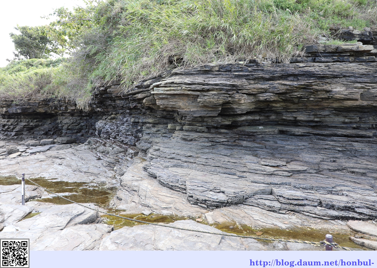높은 해식애 및 넓은 파식대, 수 만권의 책을 정연히 올려놓은 듯한 층리 등