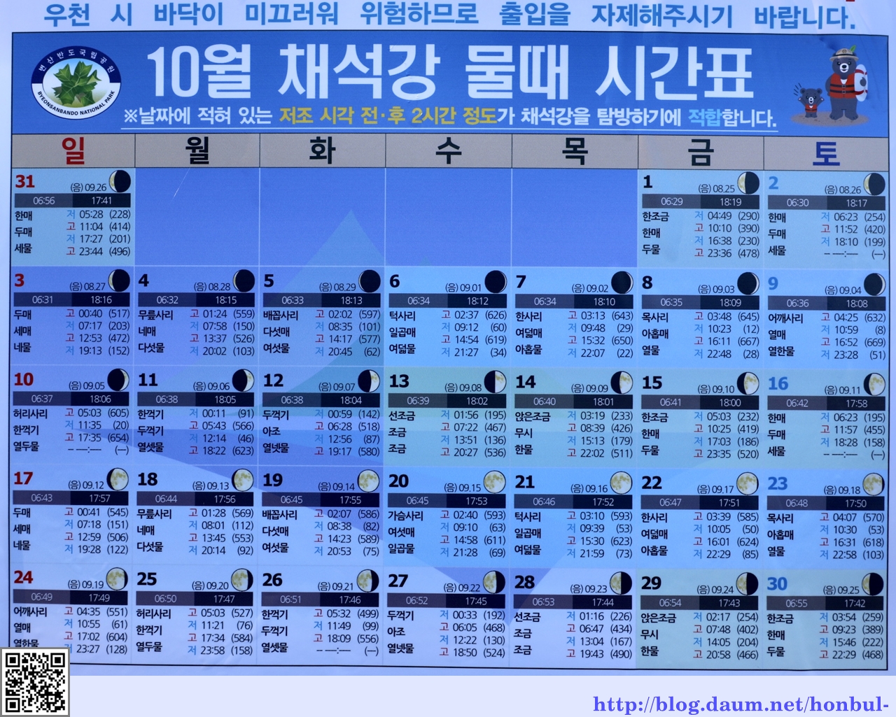 변산반도 국립공원에선 매달 이렇게 채석강 물때 시간표를 게시한다.
