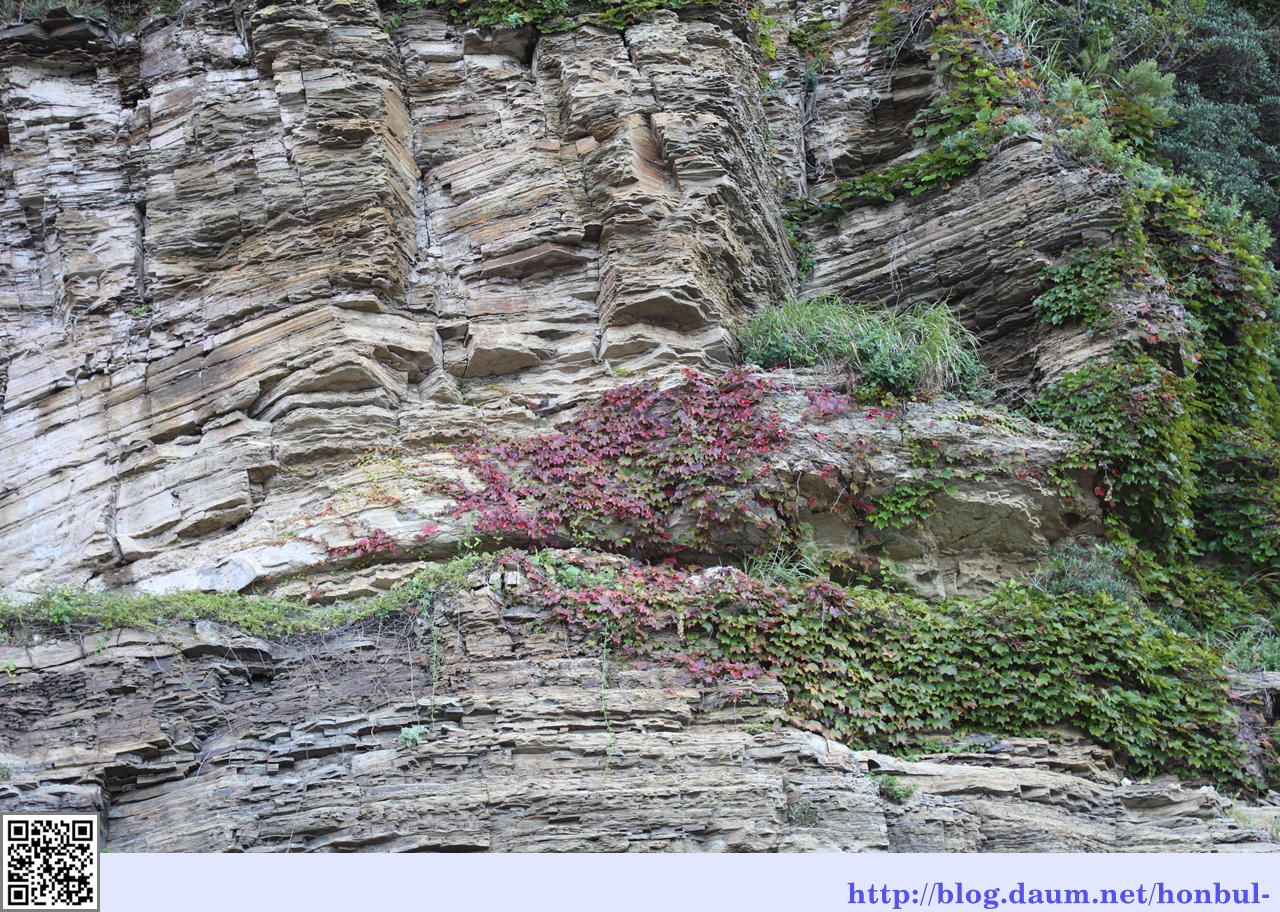해식 단애를 따라 오르는 담쟁이 풀도 단풍이 들며 아름답게 수놓고 있다.