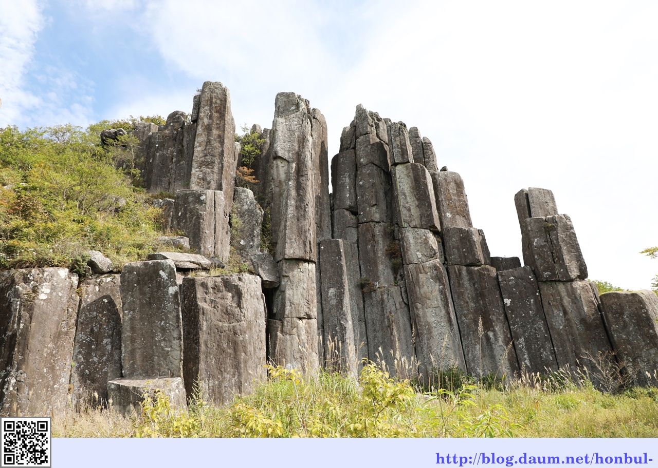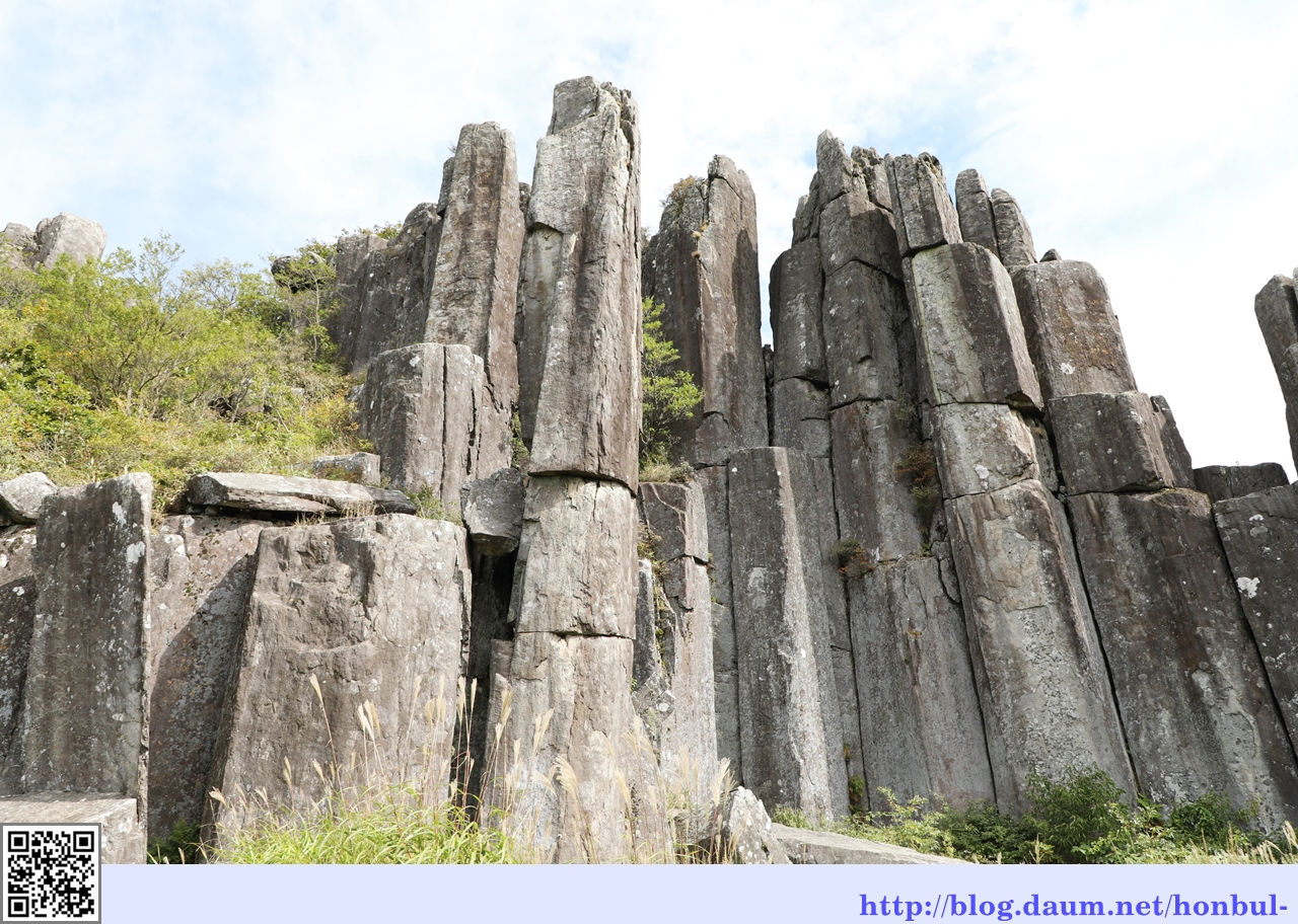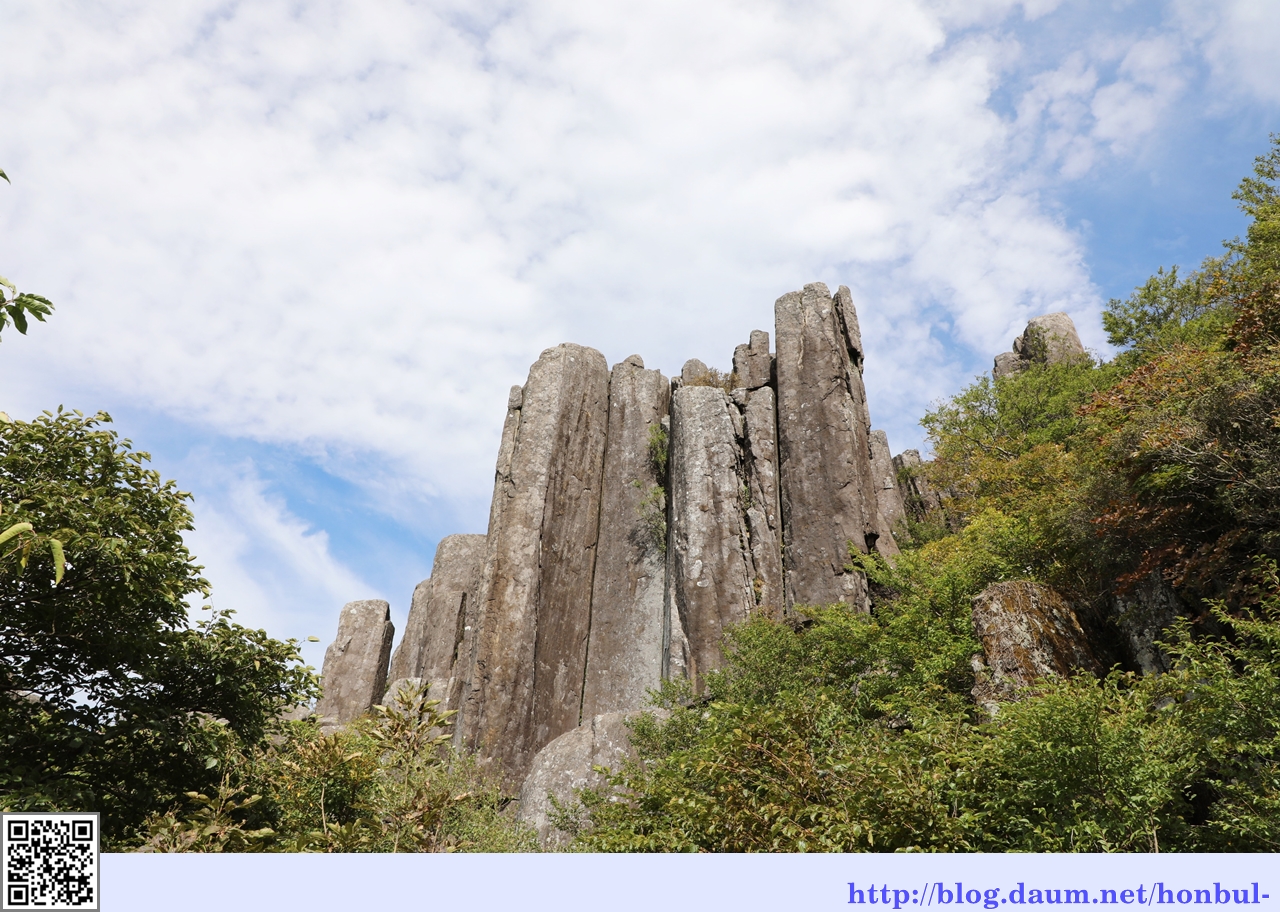 수직 절리상의 암석이 석책을 두른 듯 치솟아 장관을 이룬다.