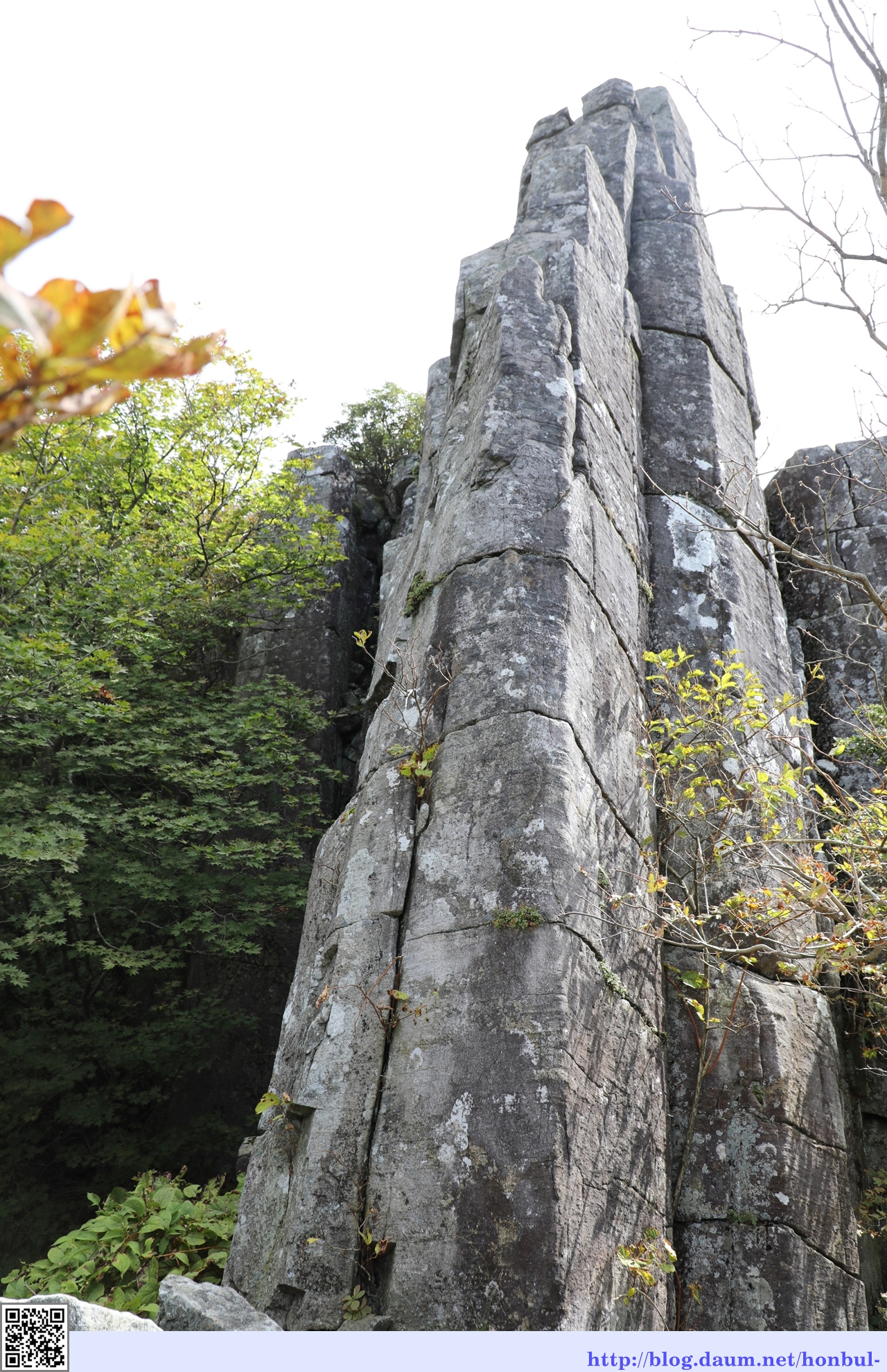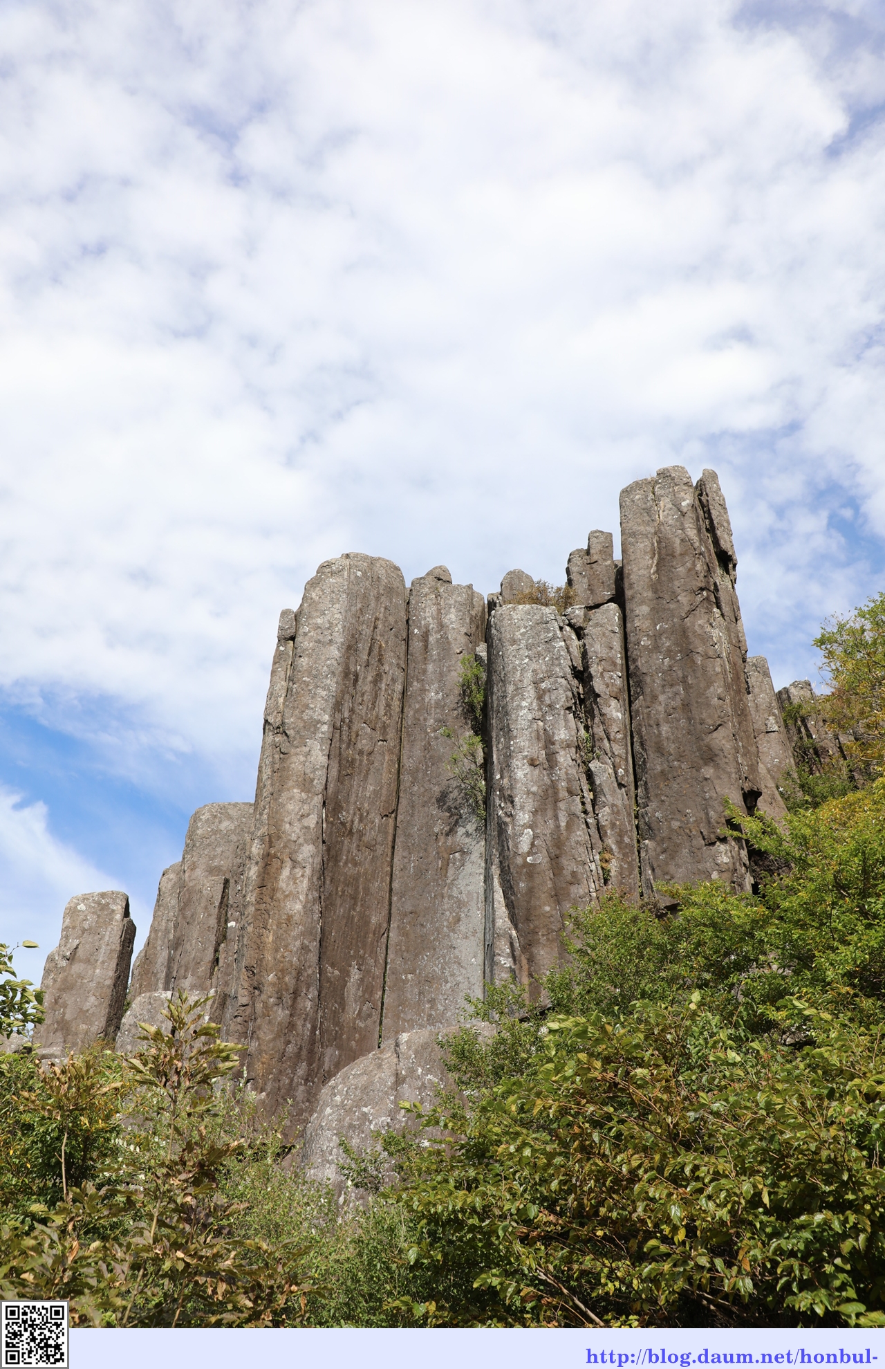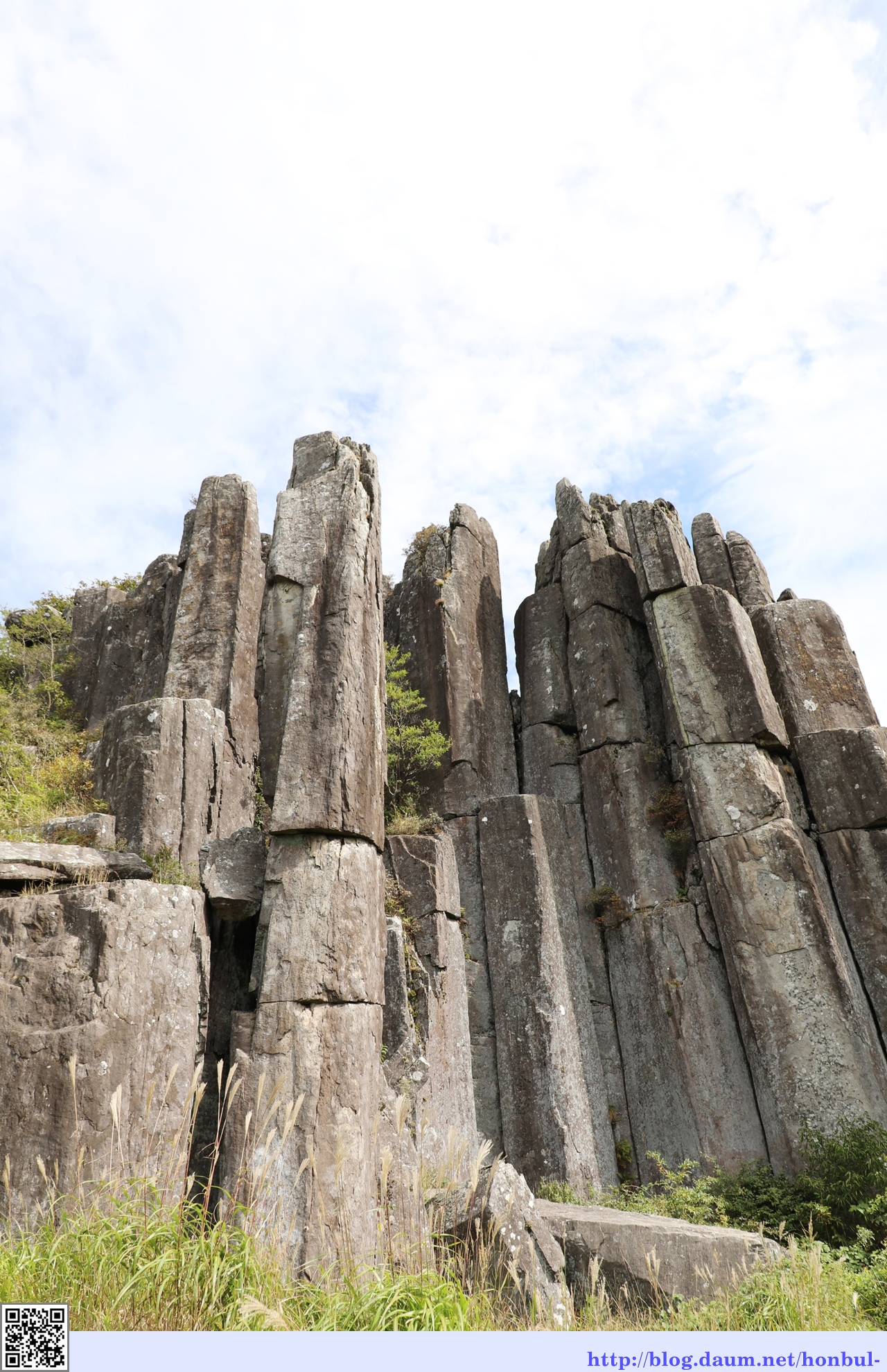수직 절리상의 암석이 석책을 두른 듯 치솟아 장관을 이룬다.