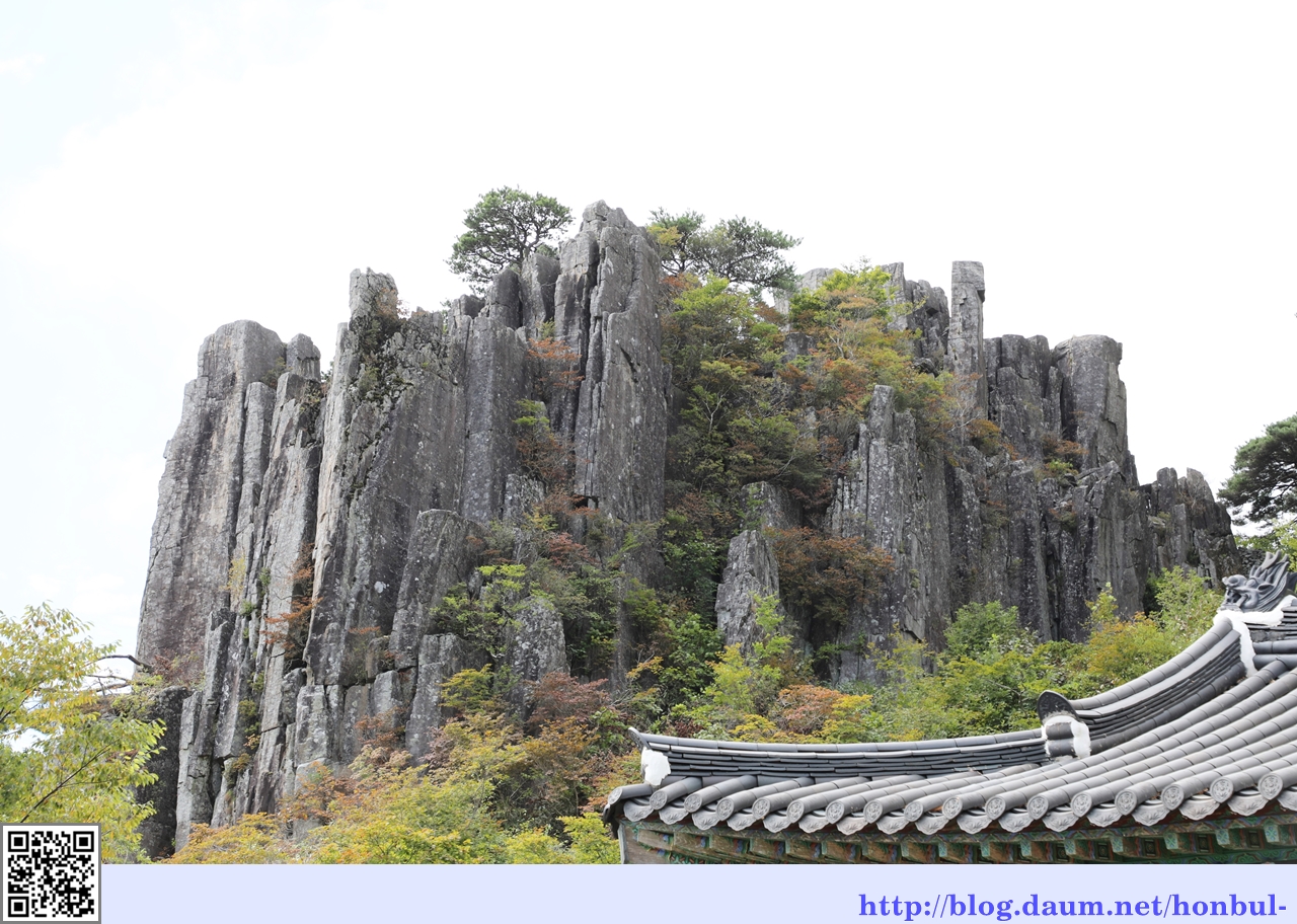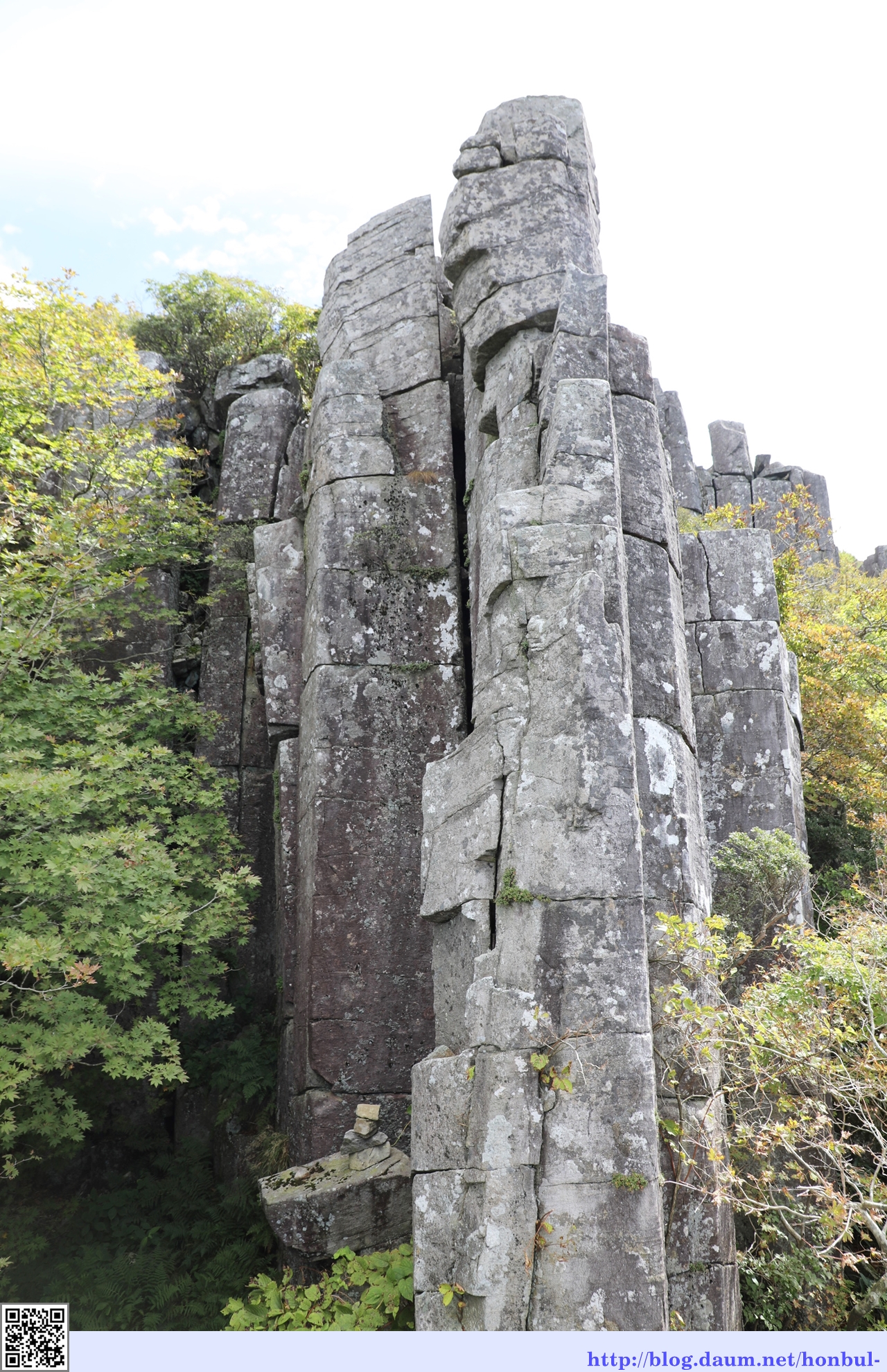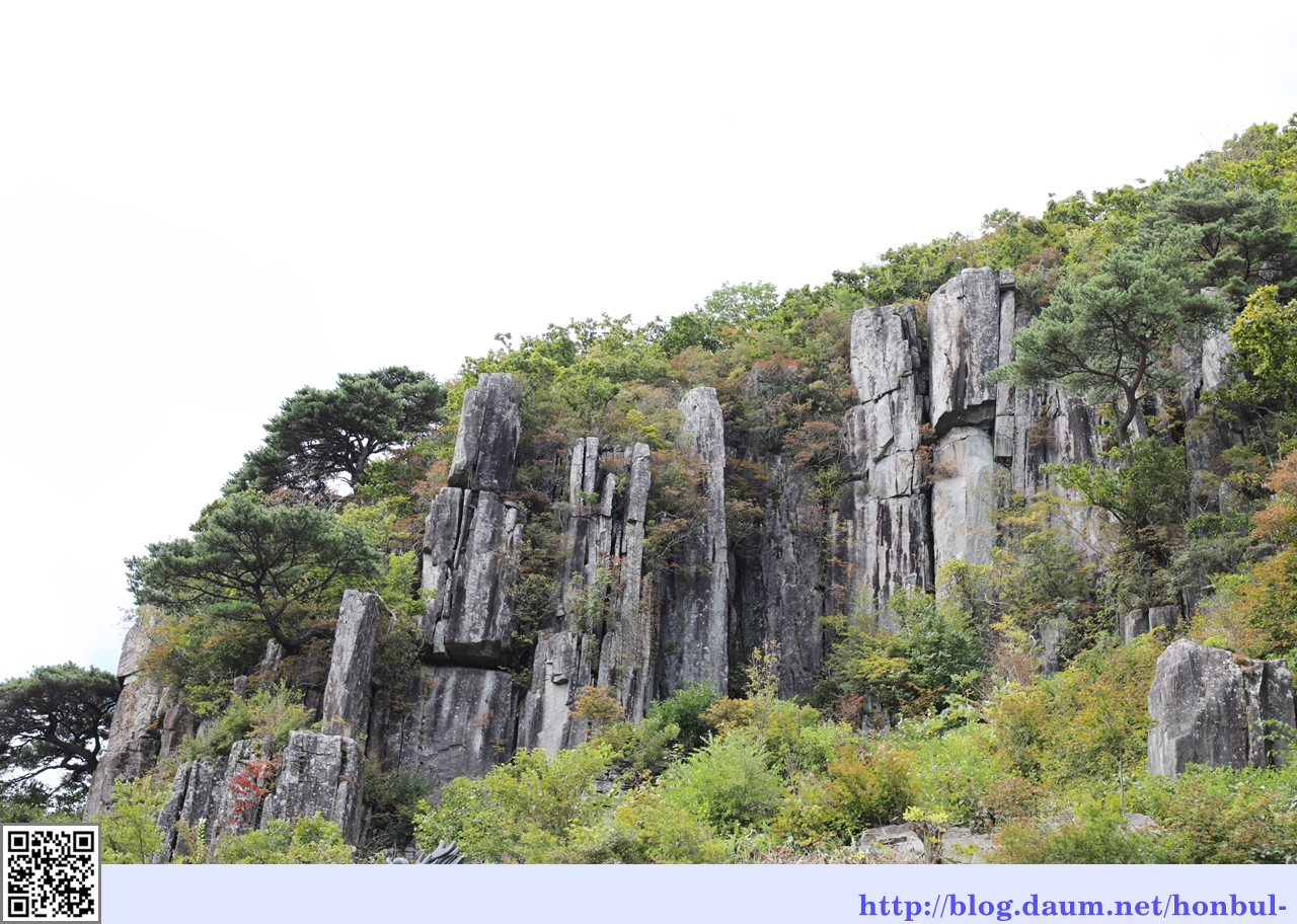 수직 절리상의 암석이 석책을 두른 듯 치솟아 장관을 이룬다.