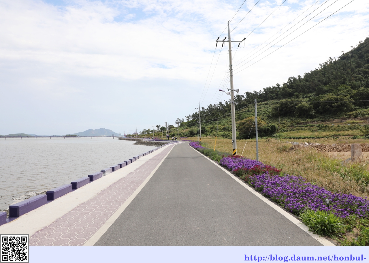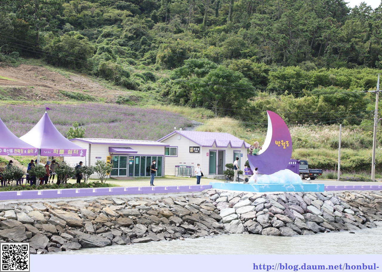 반월도 주민들은 1.5km의 섬 길에 루드비키아 6만 주와 접시꽃 6만 주를 심어 '보라꽃 섬'을 만들었다.