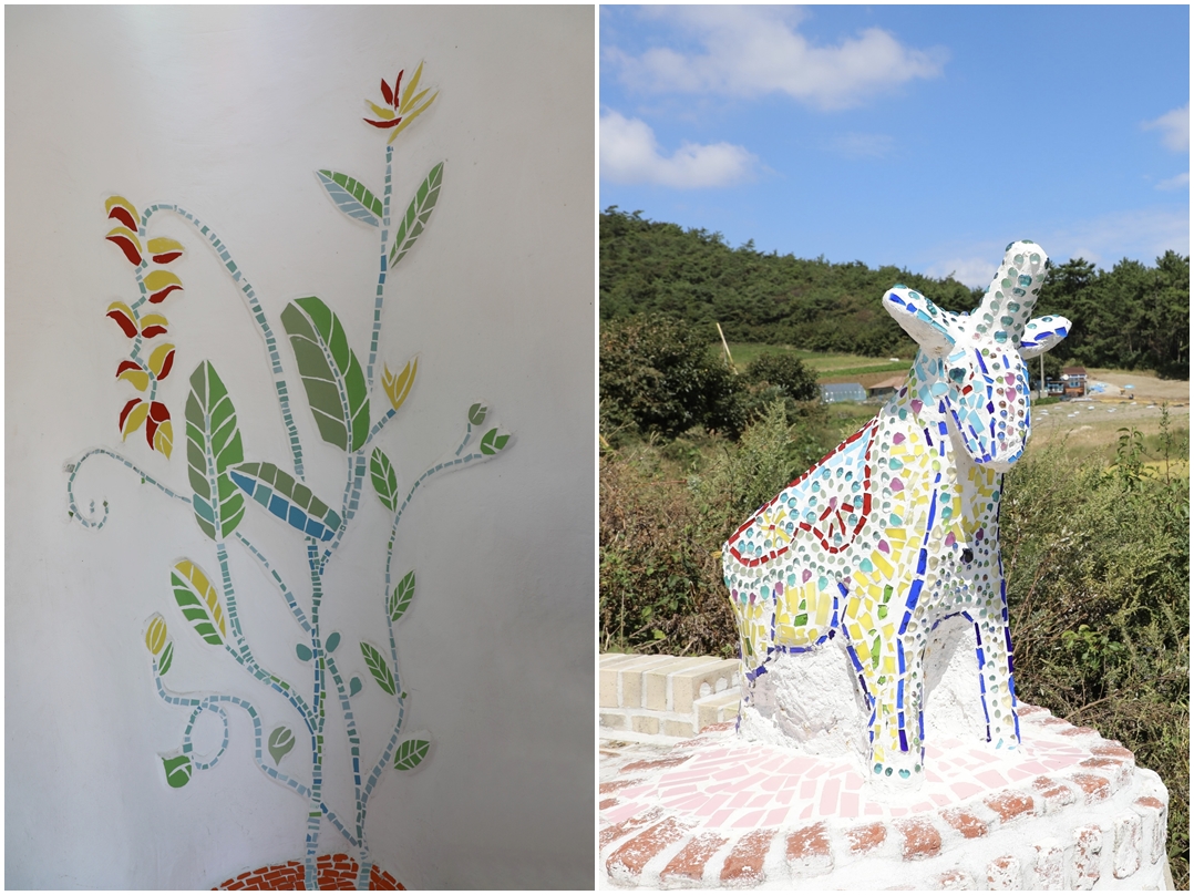 태양은 강렬한 색상을 이용해 모자이크로 처리했고, 달은 도자기 그릇을 이용했다.