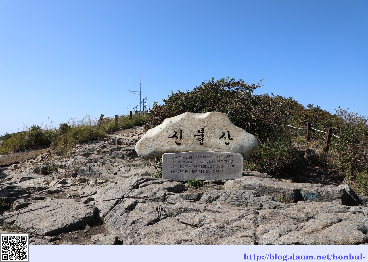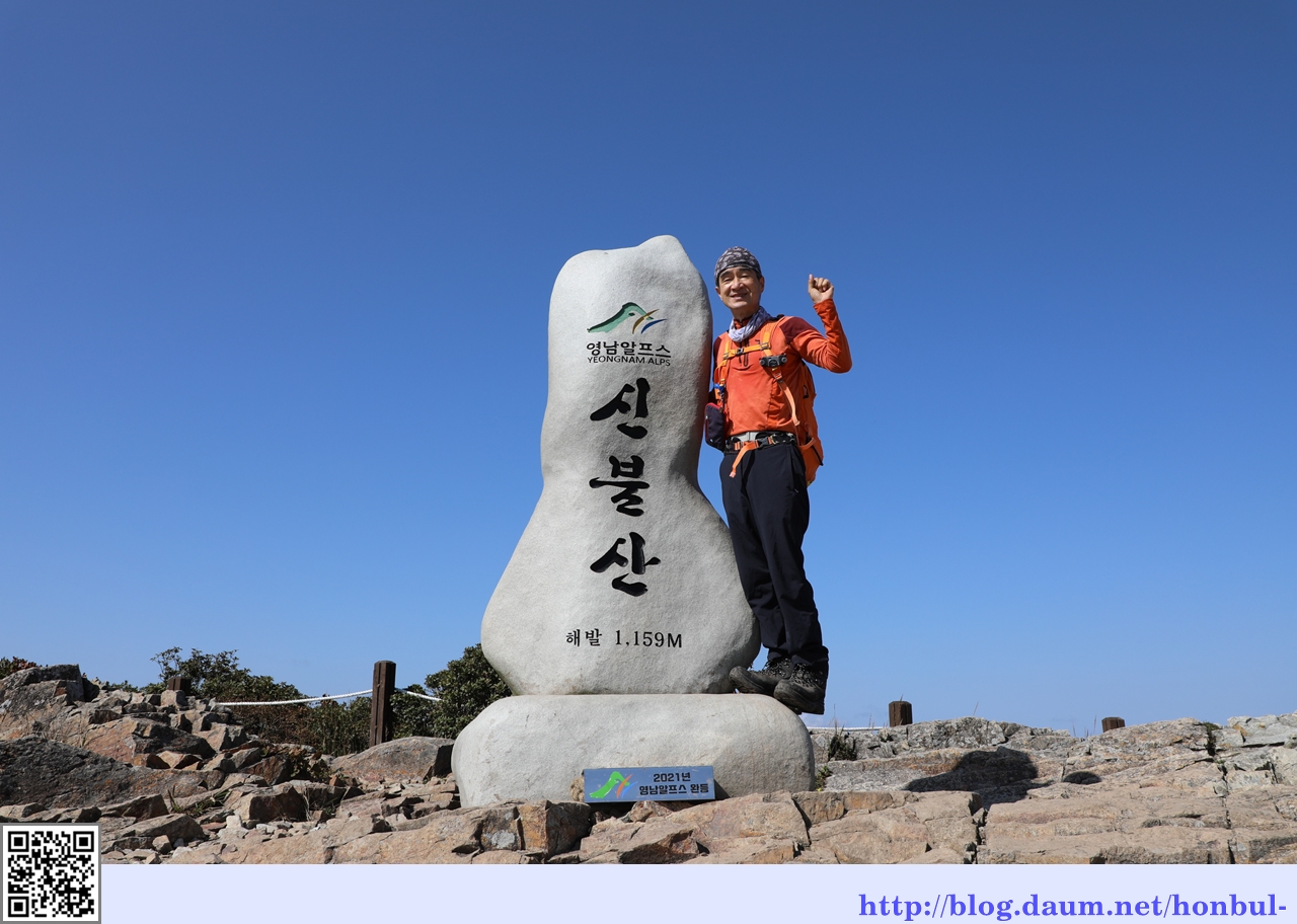 푸른 하늘에 하얗게 반짝이는 신불산 정상 표지석을 잡고 인증 사진을 찍었다.