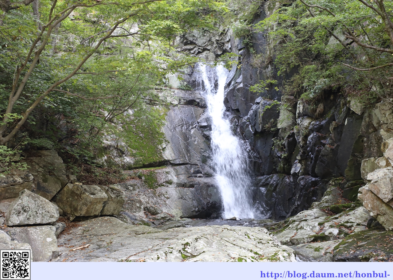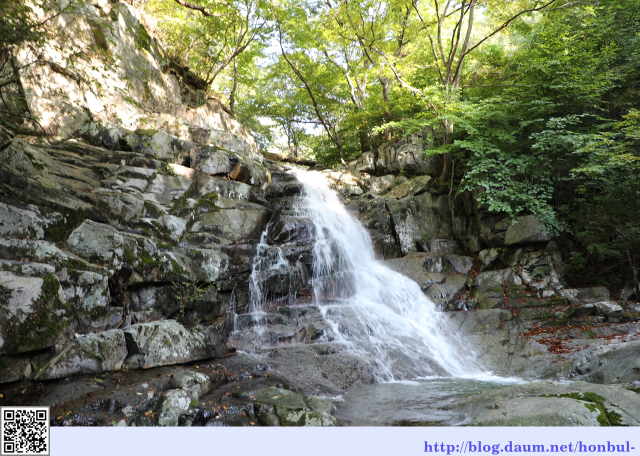 이 폭포 위쪽에 한계암이란 작은 사찰이 보인다.