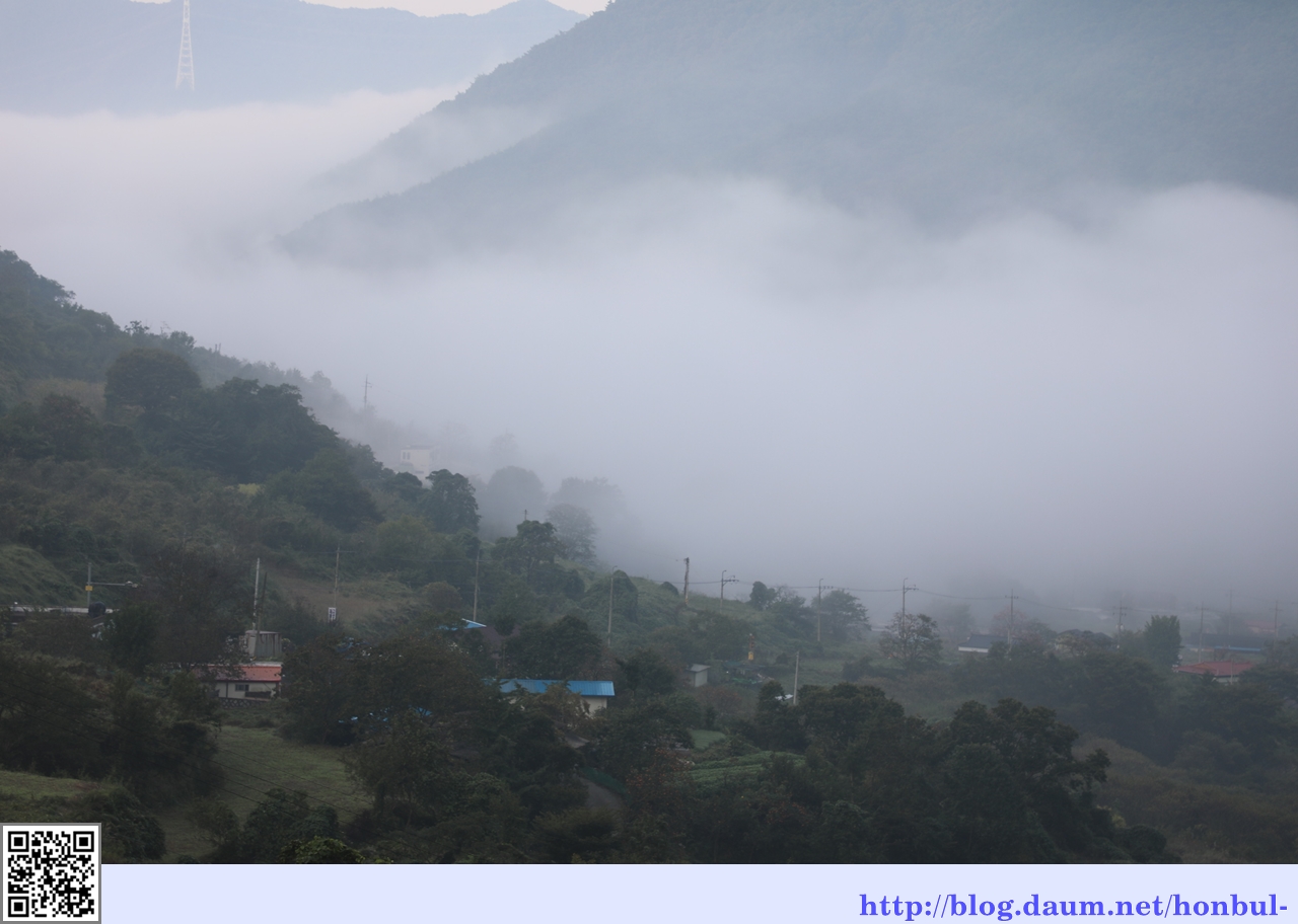 아침 7시가 넘었는데도 마을에 안개가 내려앉아 앞이 보이지 않는다.