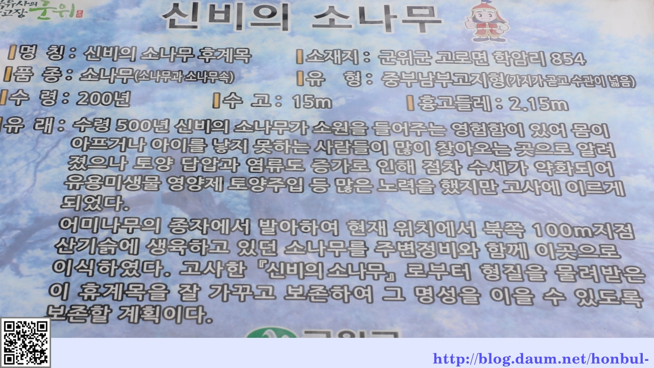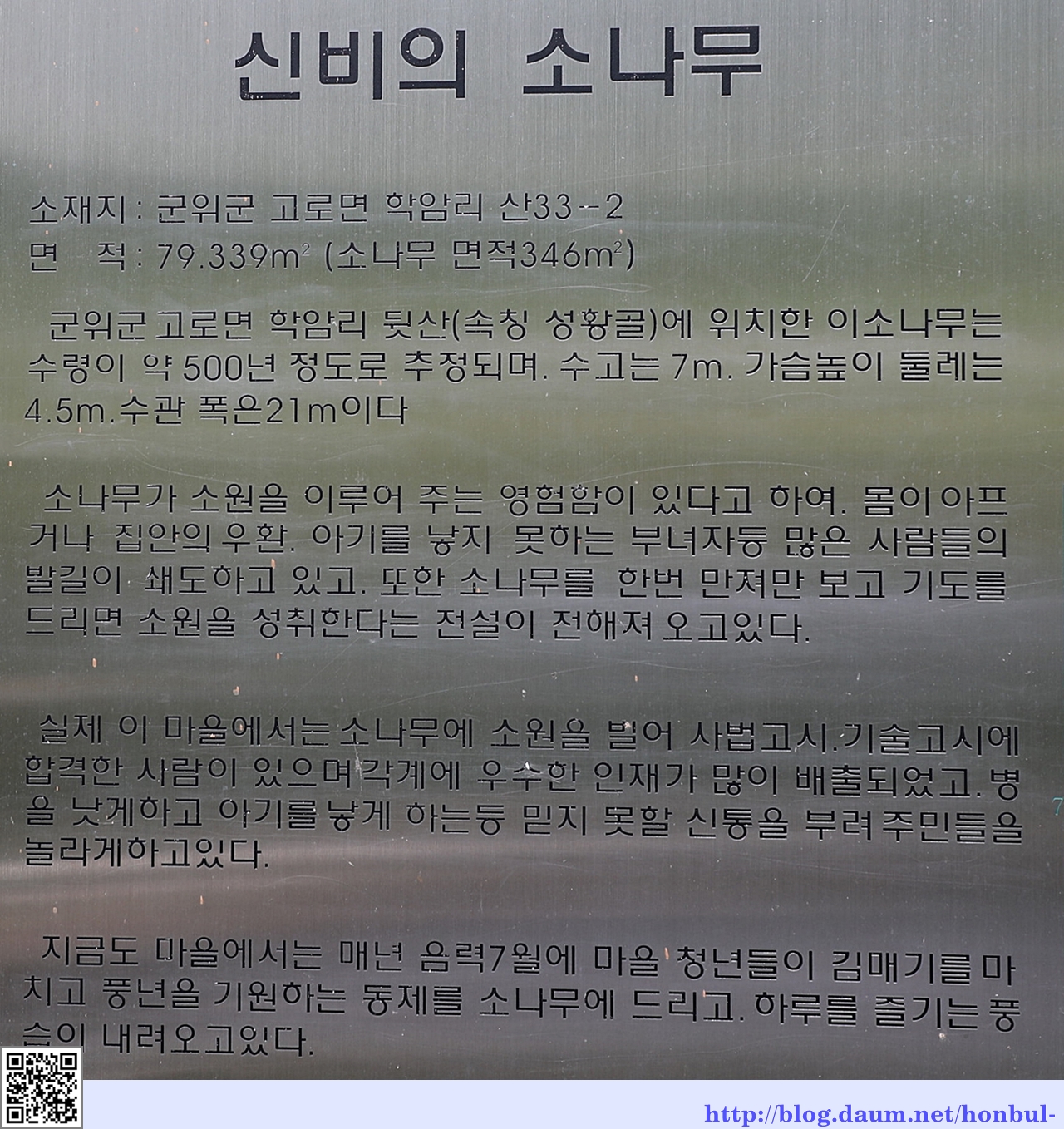 아미산을 끝내고 내일 산행하게 될 청송 주왕산으로 가는 길에 만난 신비의 소나무 안내문이다.