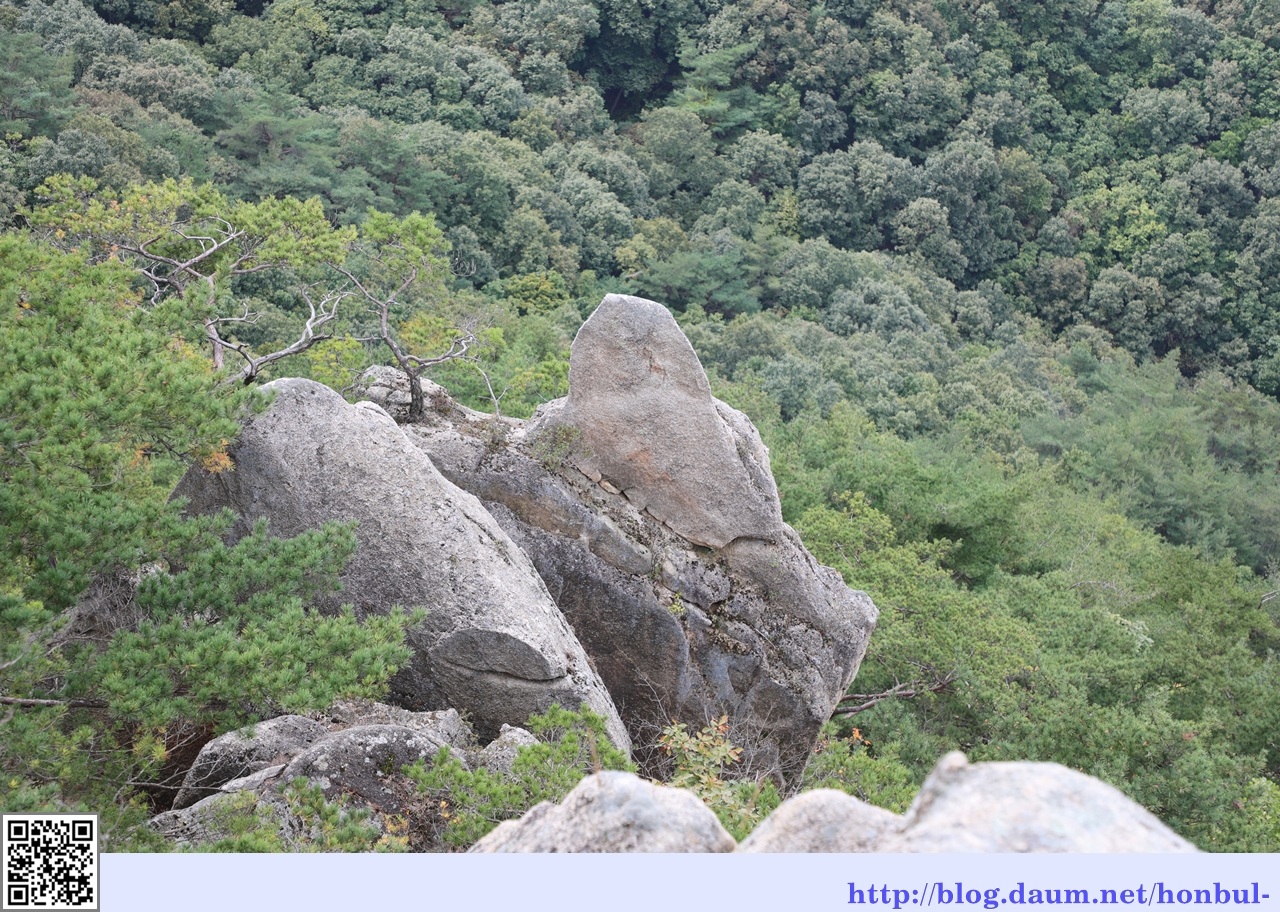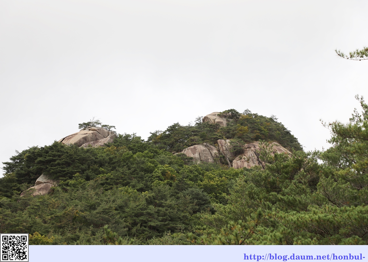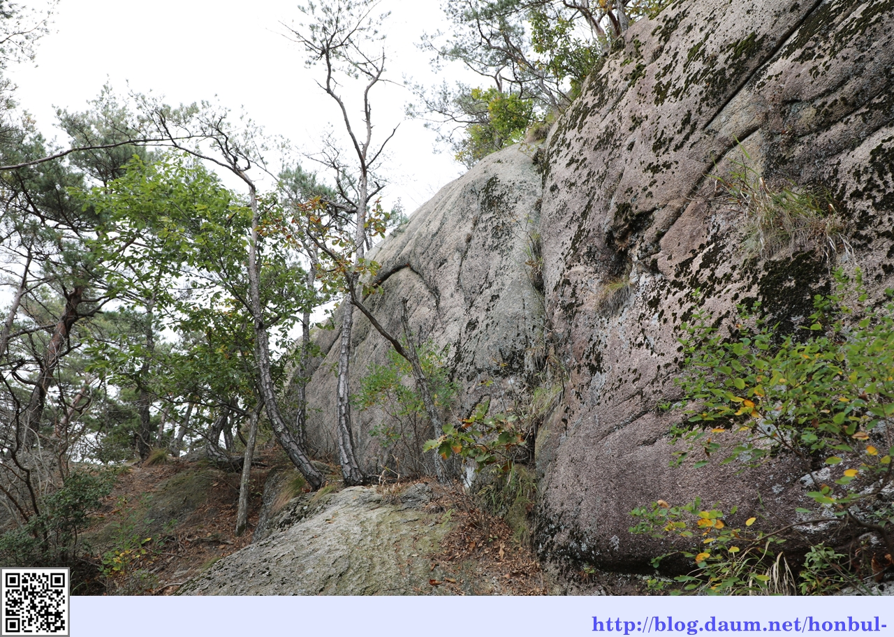 이 바위산을 왼쪽으로 휘돌아 어렵지 않게 오를 수 있다.