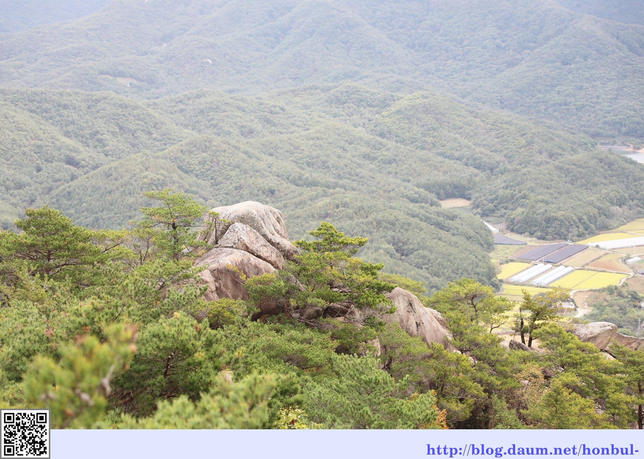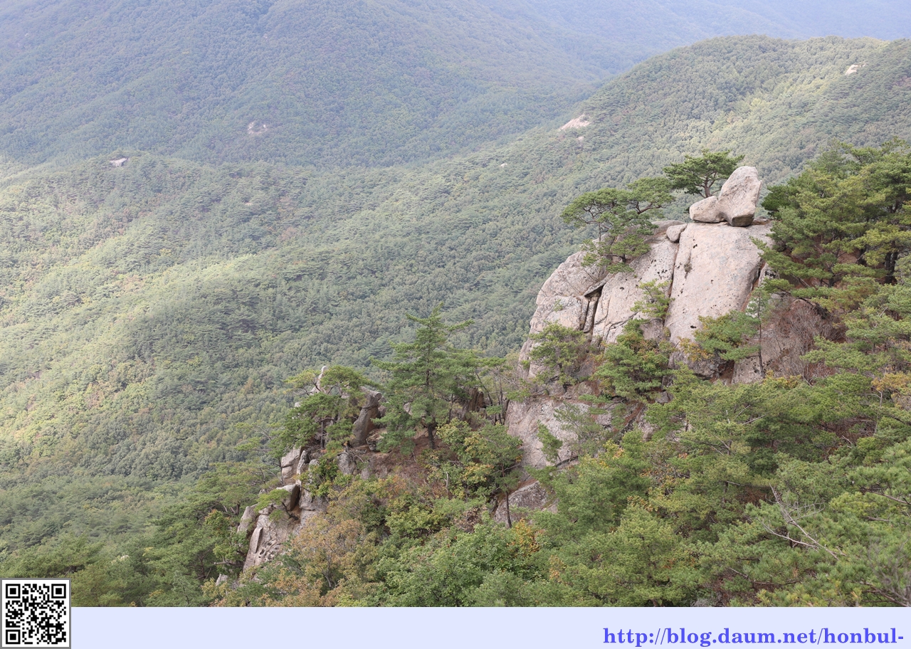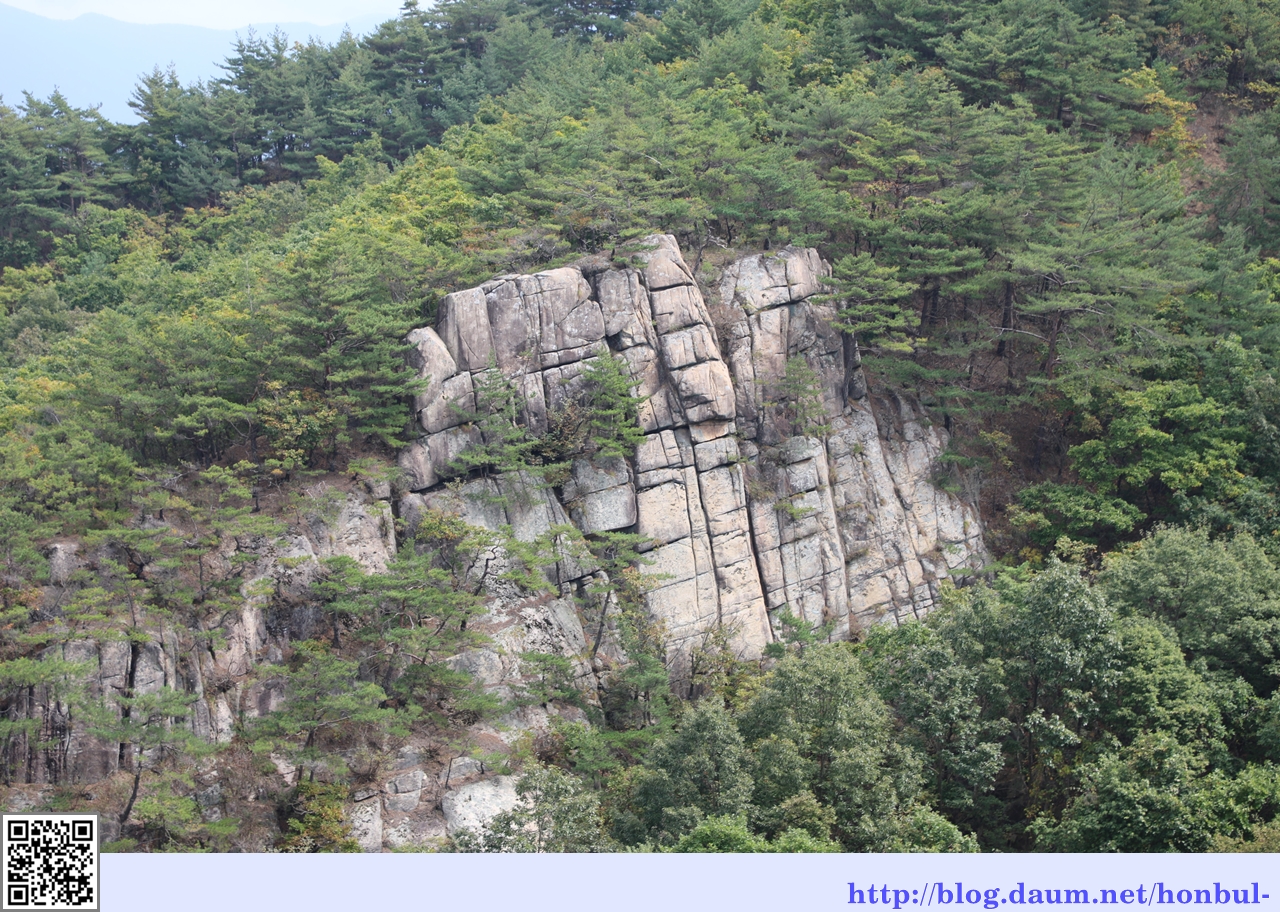 이 바위산을 왼쪽으로 휘돌아 어렵지 않게 오를 수 있다.