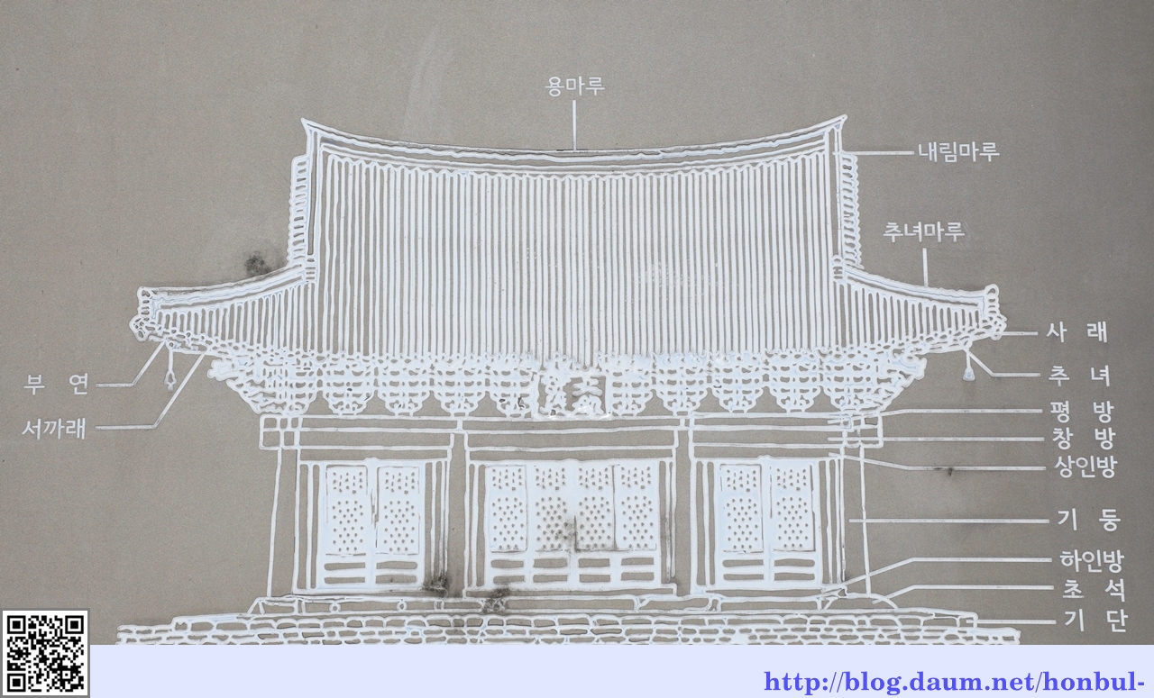 중도리 열주 쪽은 빗반자를 사면으로 돌리고 그것을 다시 조각하였다.