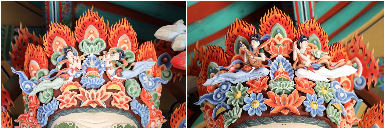 불단의 기둥을 뒤로 물려 넓은 내부 공간을 이루며 상부의 포작들은 연꽃 봉오리 모양으로 조각되어있고,